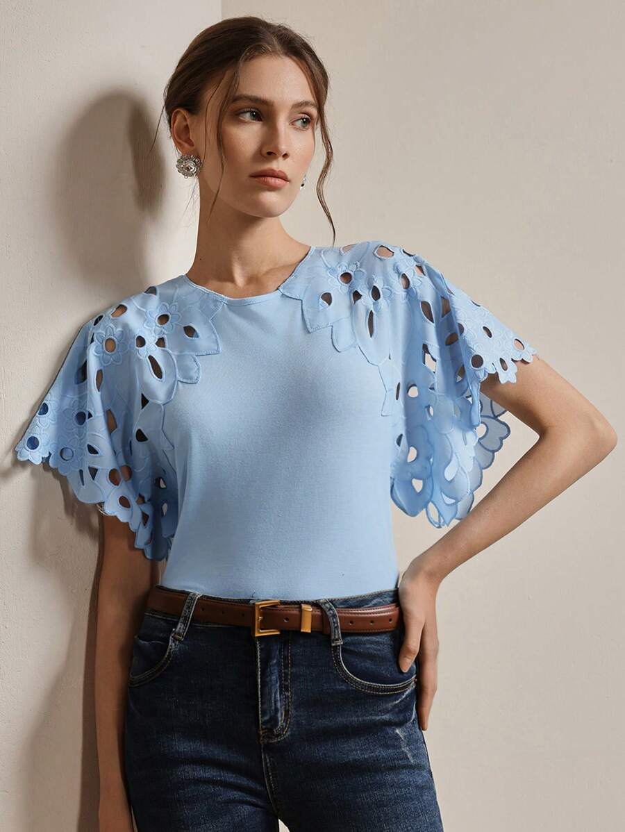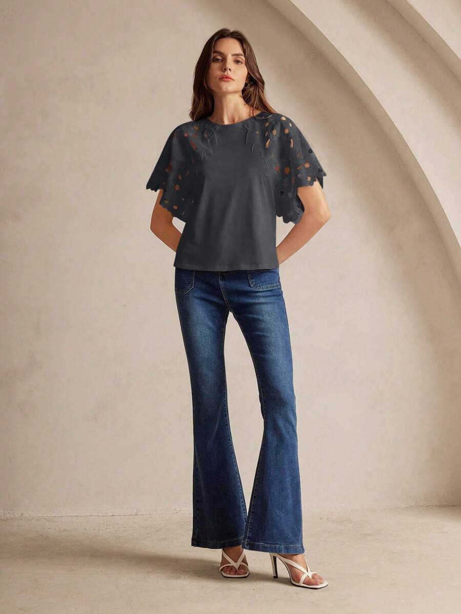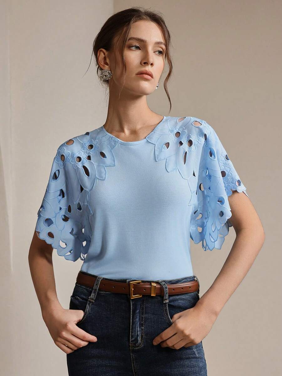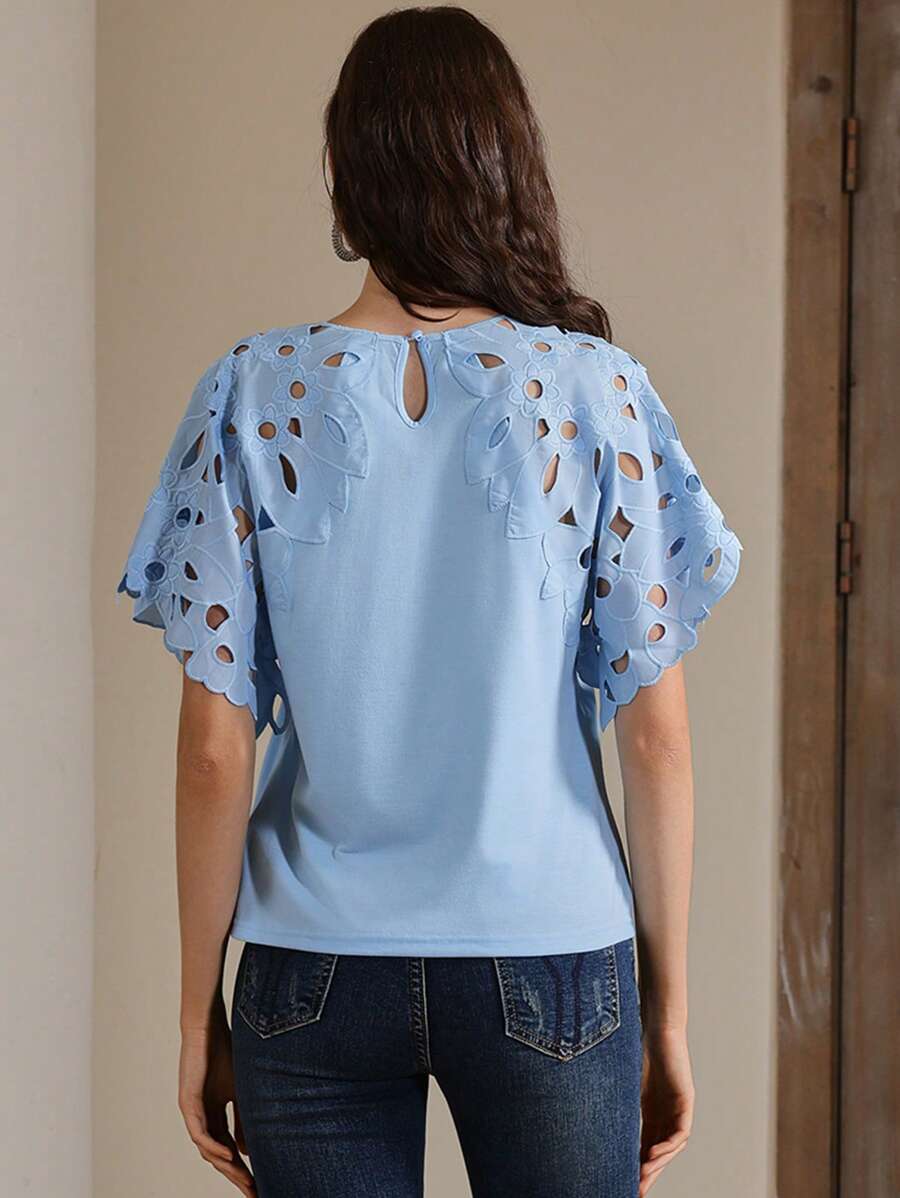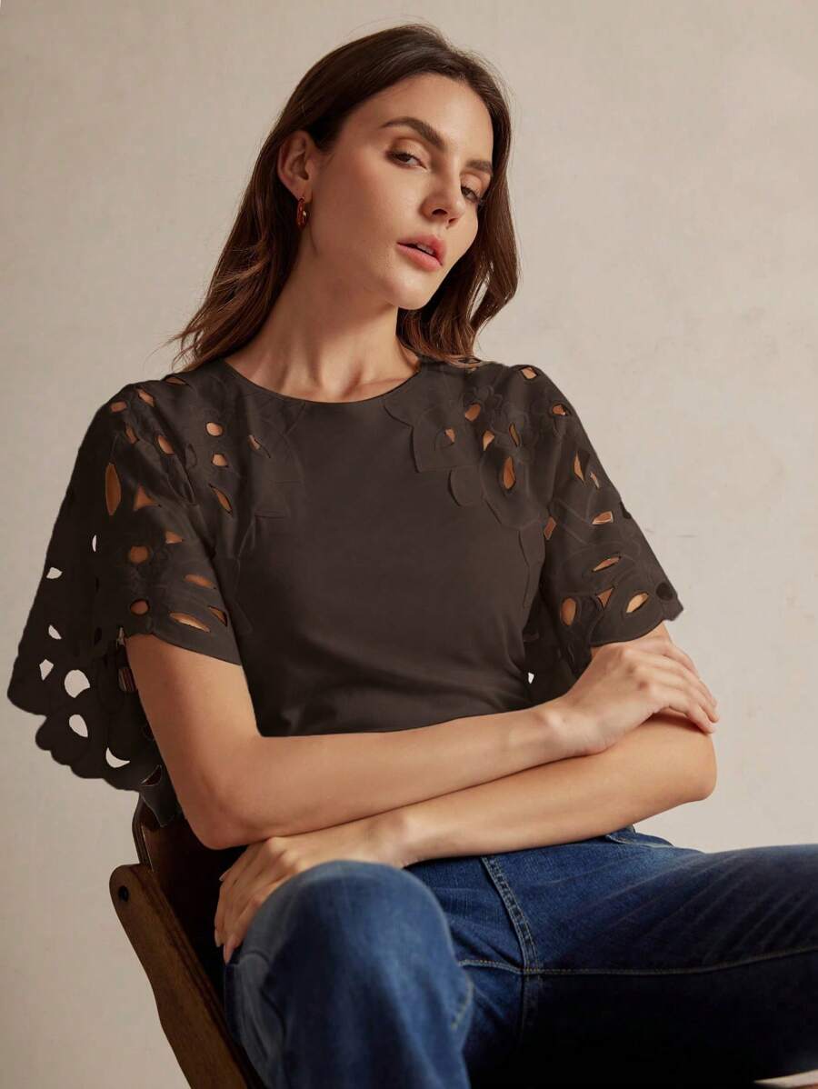 MIU Women Elegant Solid Color Hollow-Out Short Sleeve Fashion T-Shirt