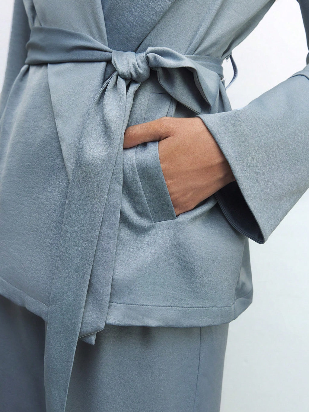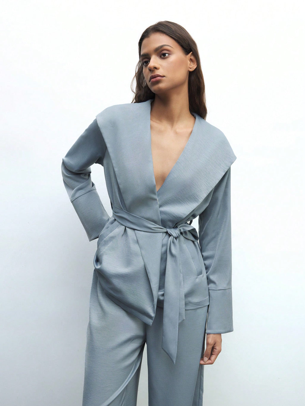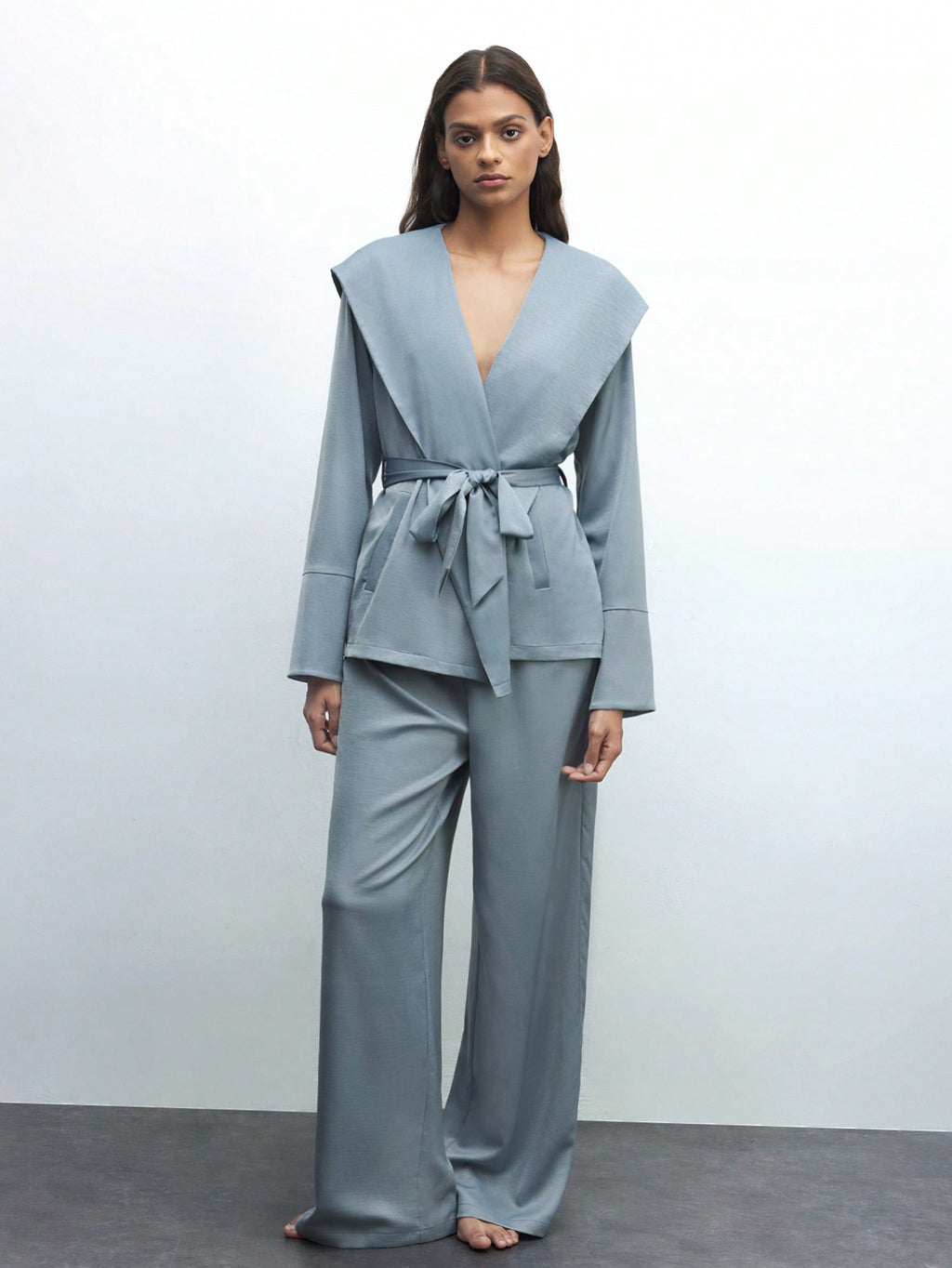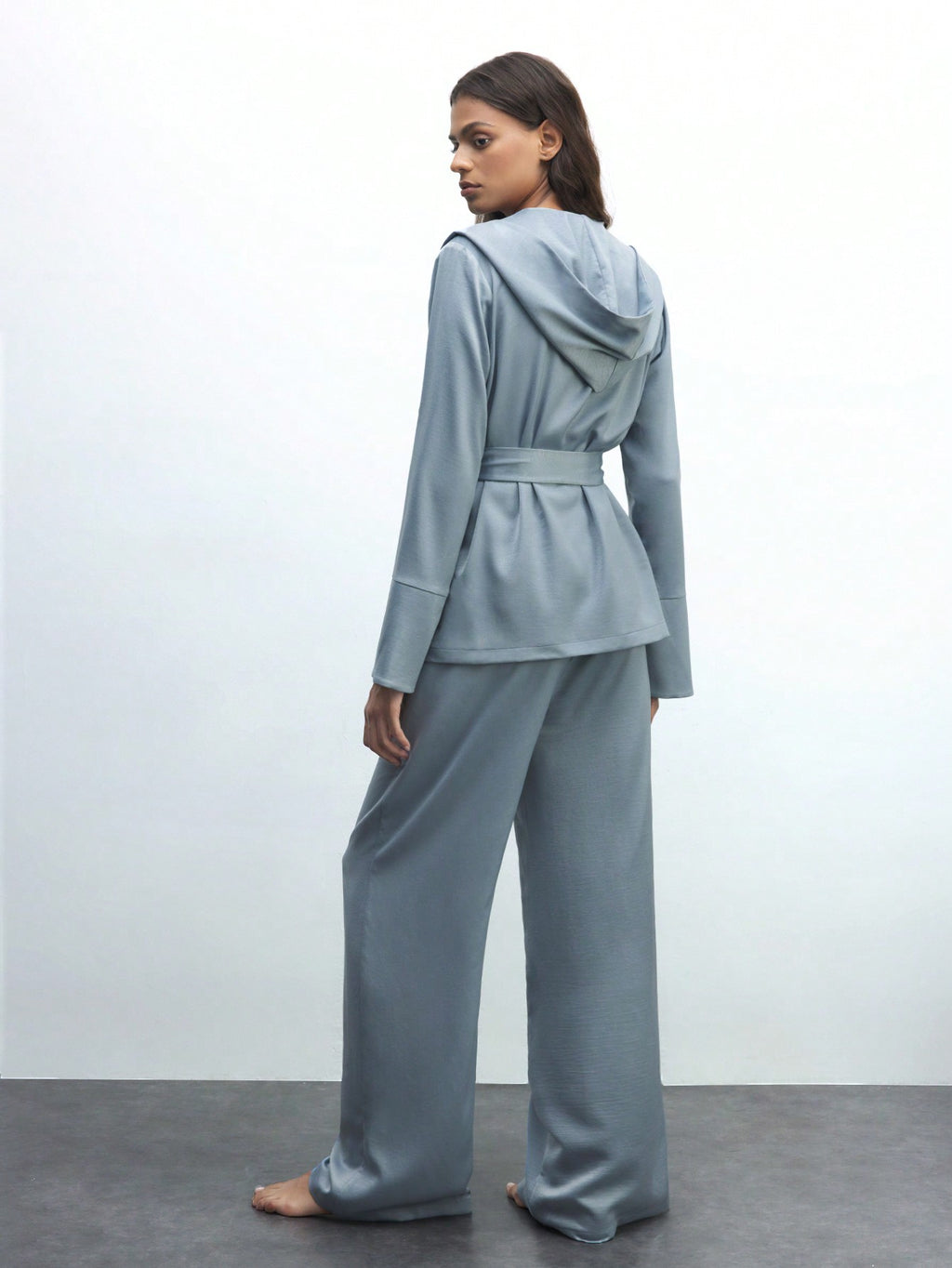 MIU Women Elegant Solid Color Hooded Cross Wrap Belted Long Sleeve Top And Full Length Pants Sleepwear Set, Autumn/Winter