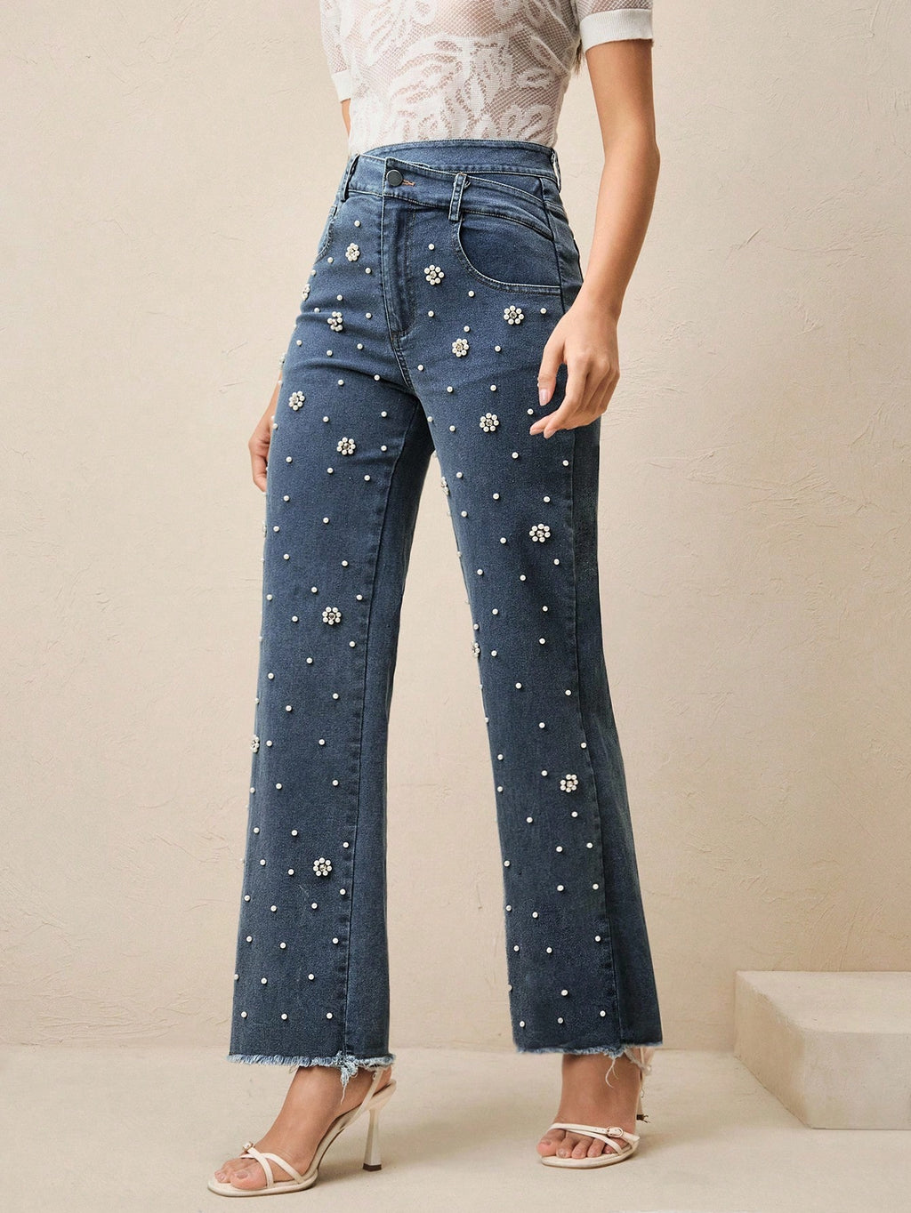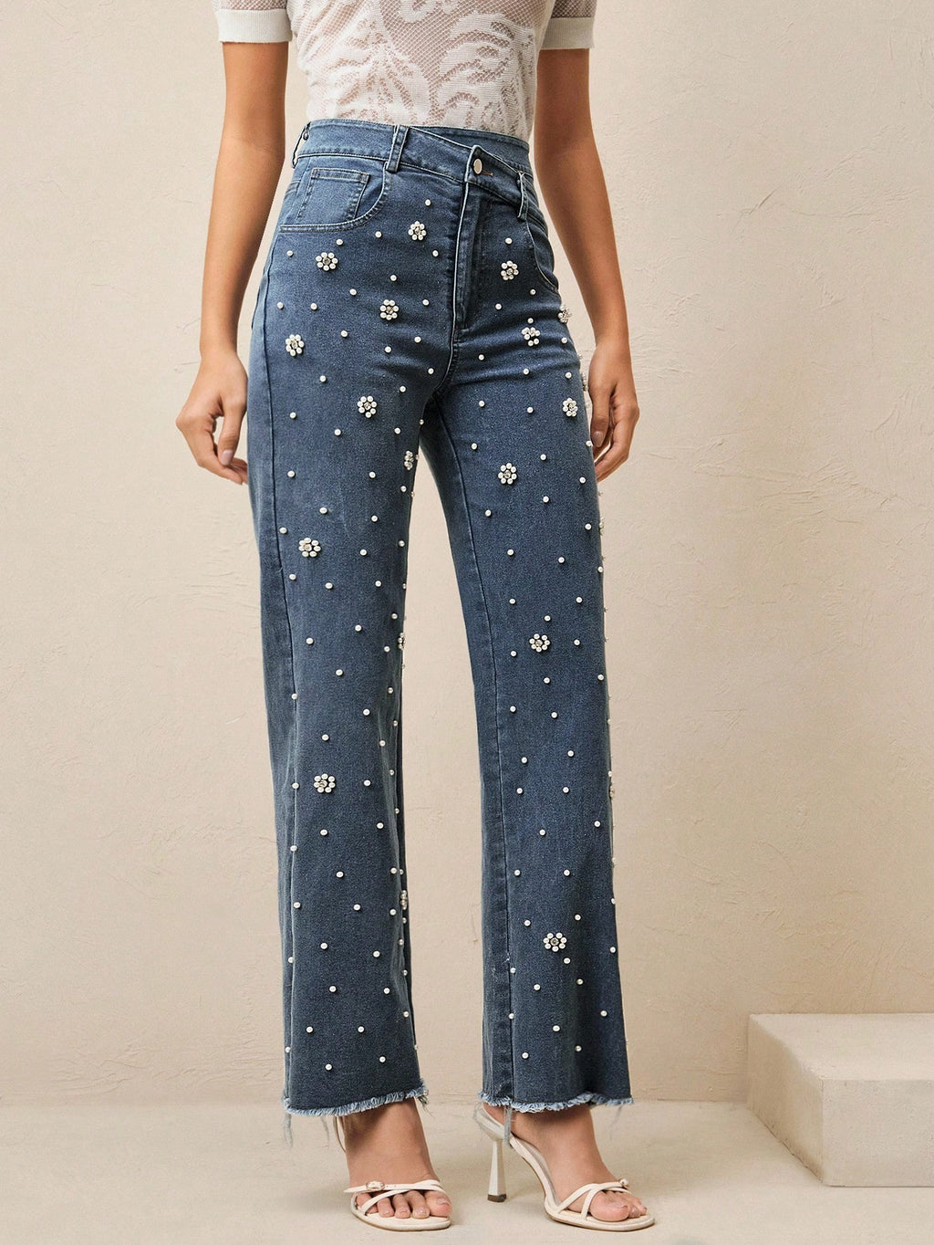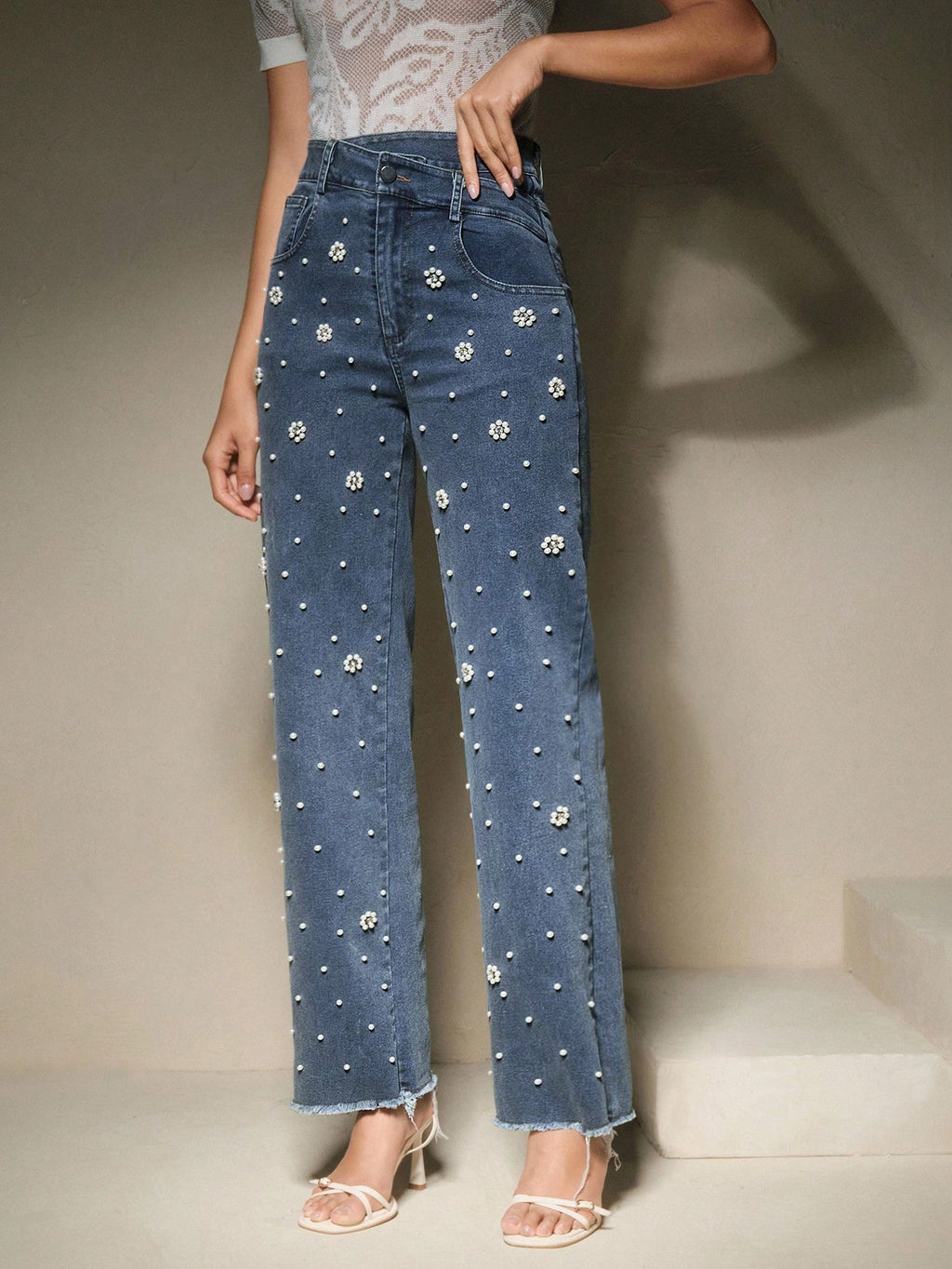 MIU Women Faux Pearl Flower Decor Pocket Straight Leg Loose Casual Jeans
