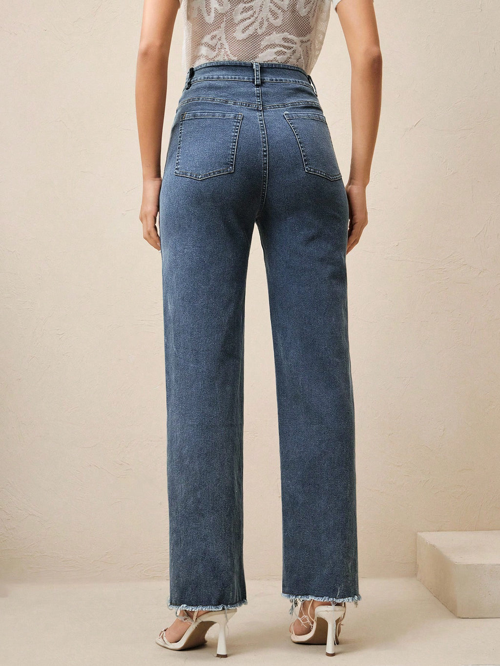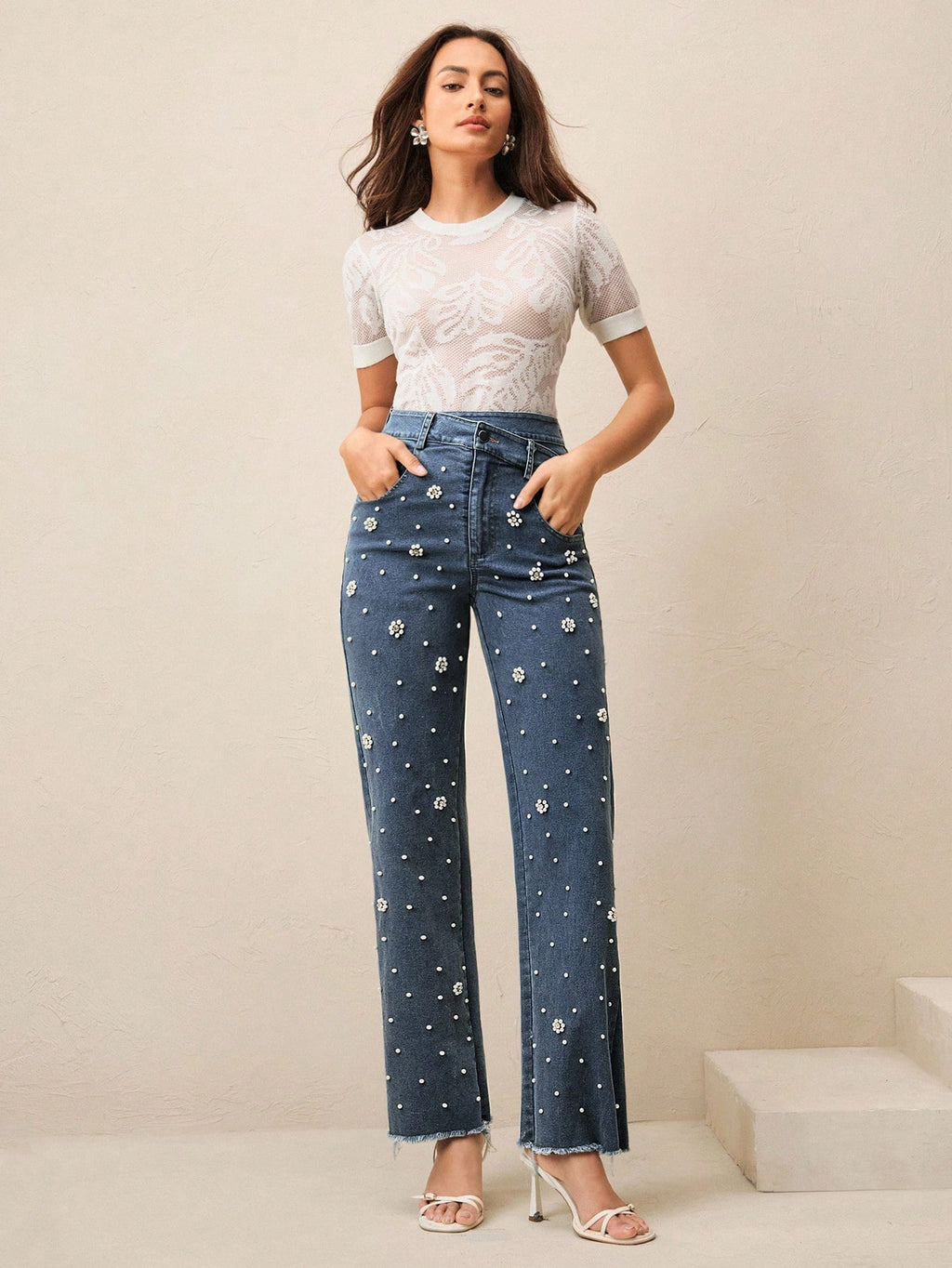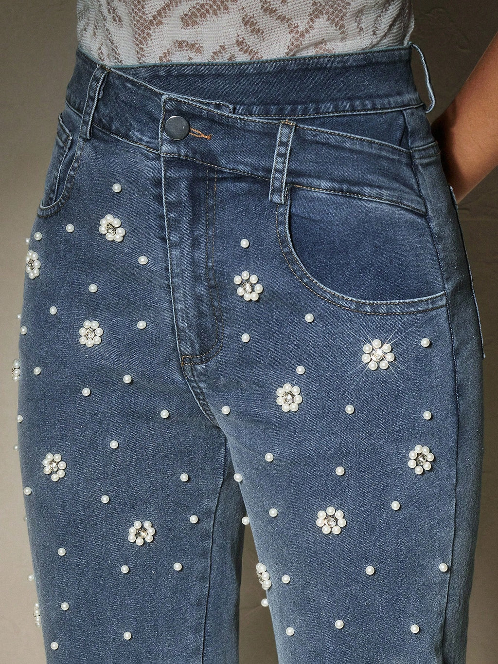 MIU Women Faux Pearl Flower Decor Pocket Straight Leg Loose Casual Jeans