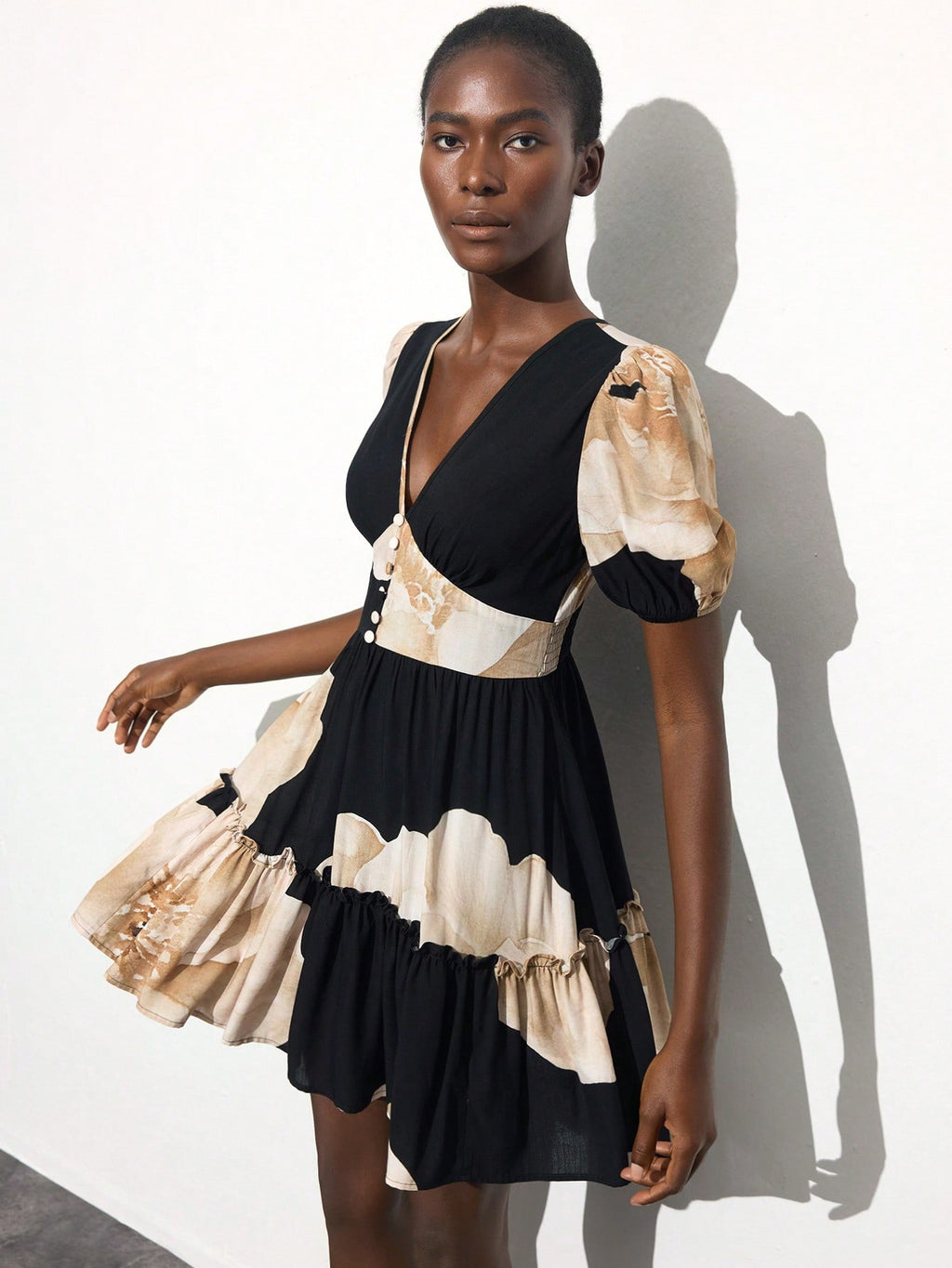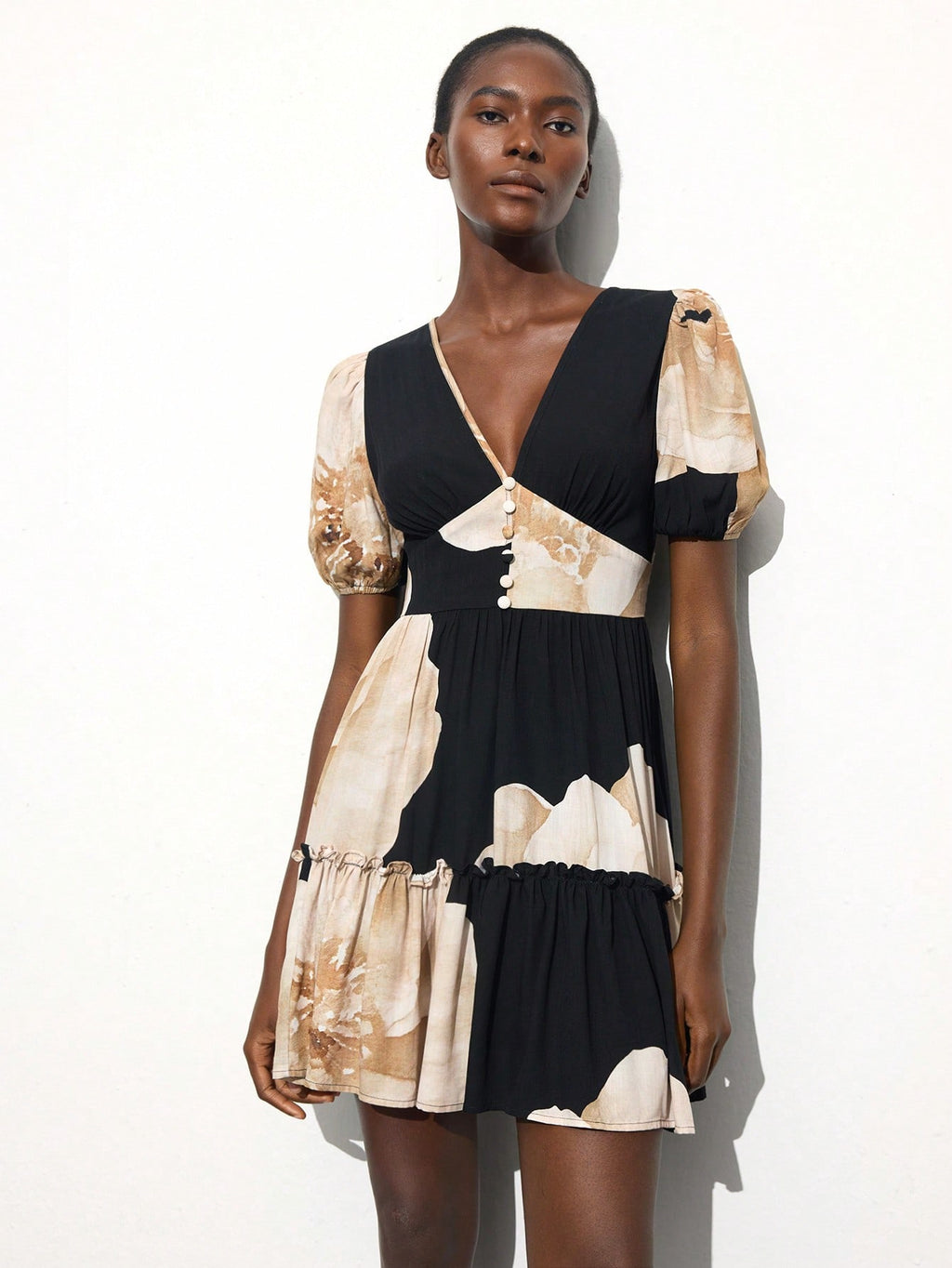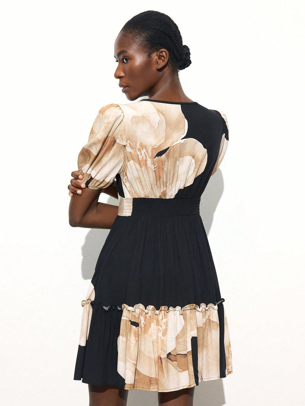 MIU Women Floral Print Deep V-Neck Elegant Short Sleeve Mini Dress,Bohemian Clothes,Vacation Outfits
