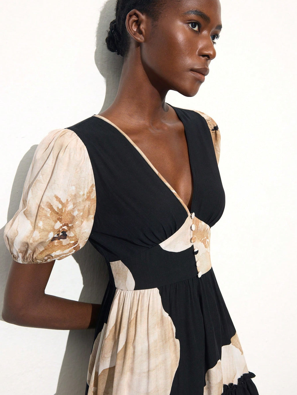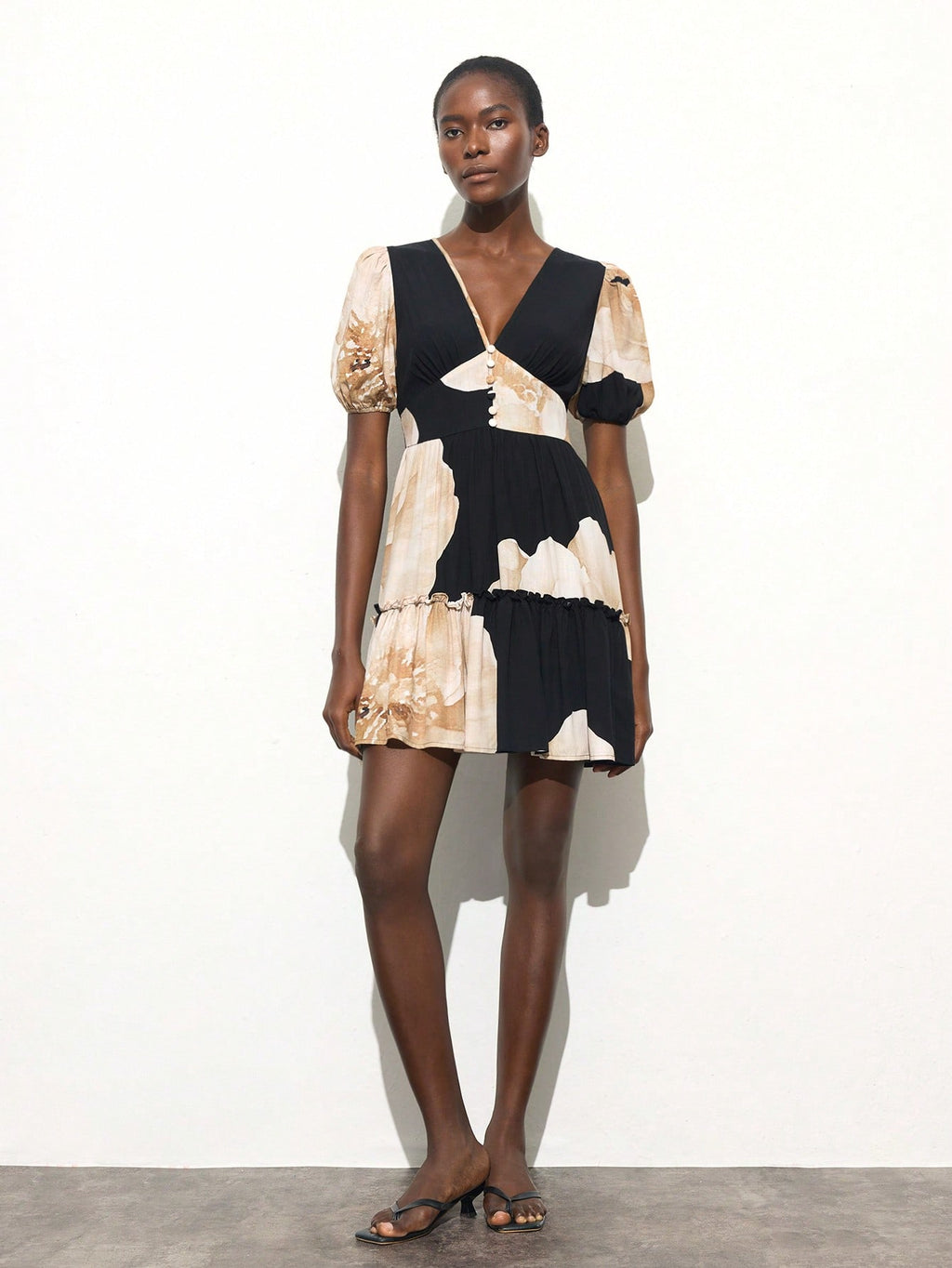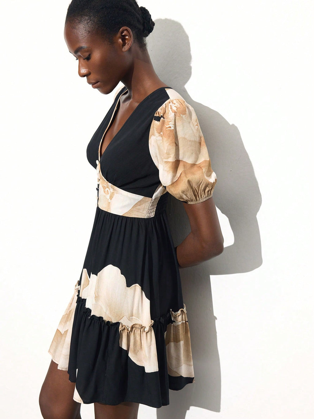 MIU Women Floral Print Deep V-Neck Elegant Short Sleeve Mini Dress,Bohemian Clothes,Vacation Outfits
