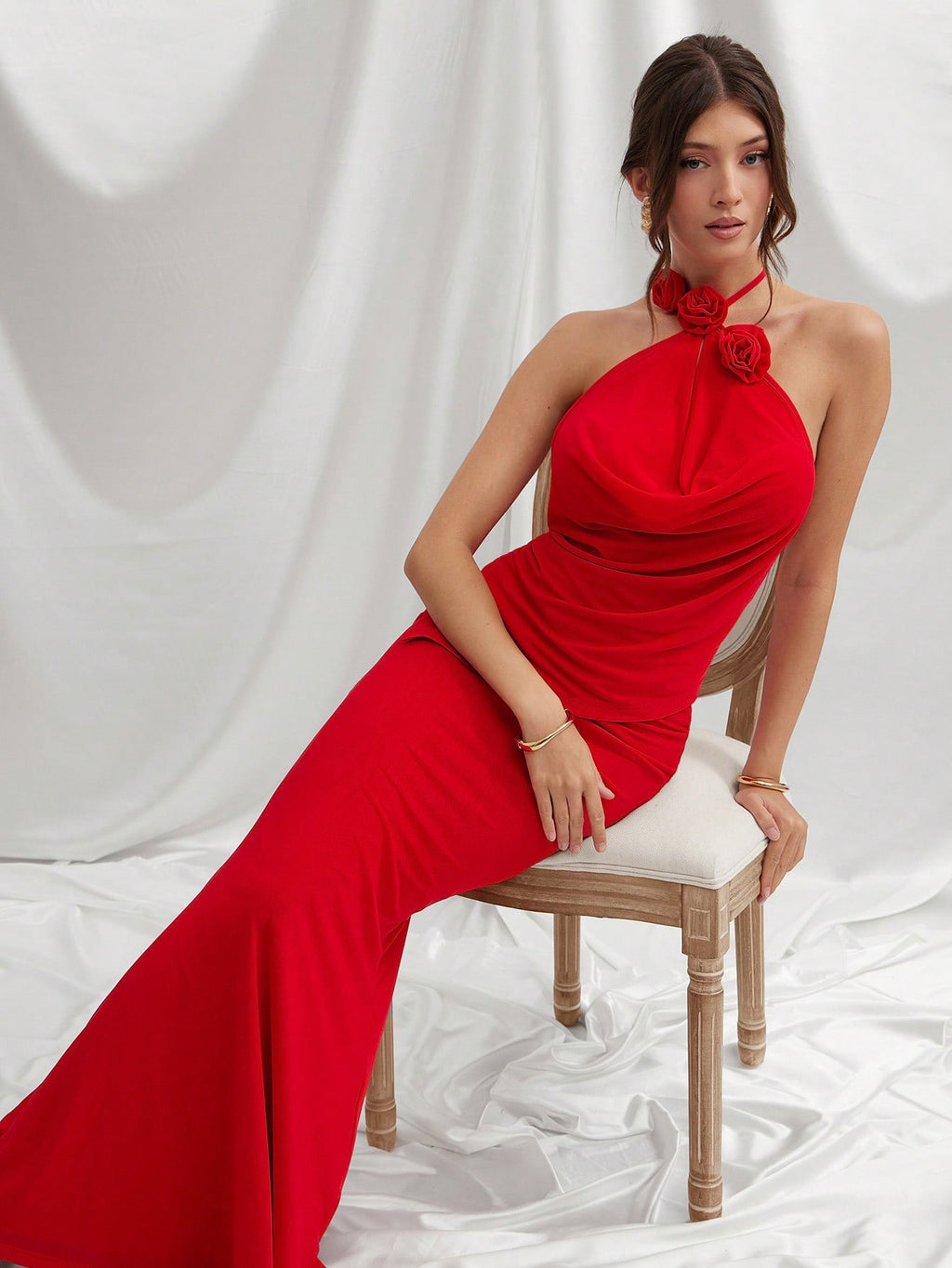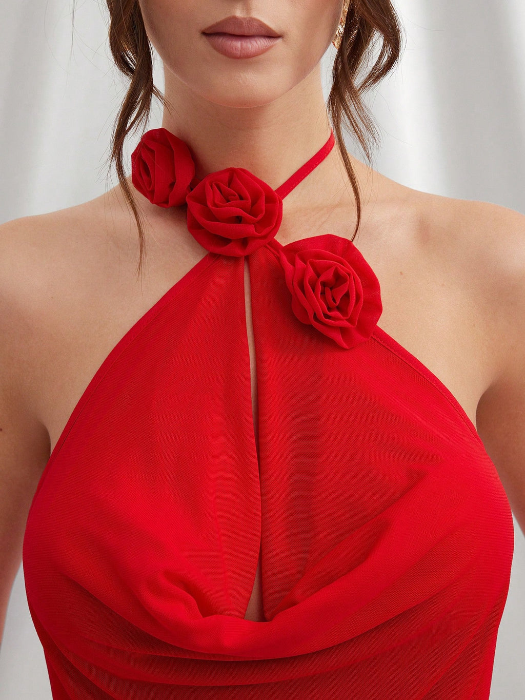 MIU Women Halter Cowl Neck Top With Rosette Detail And Asymmetrical Hem