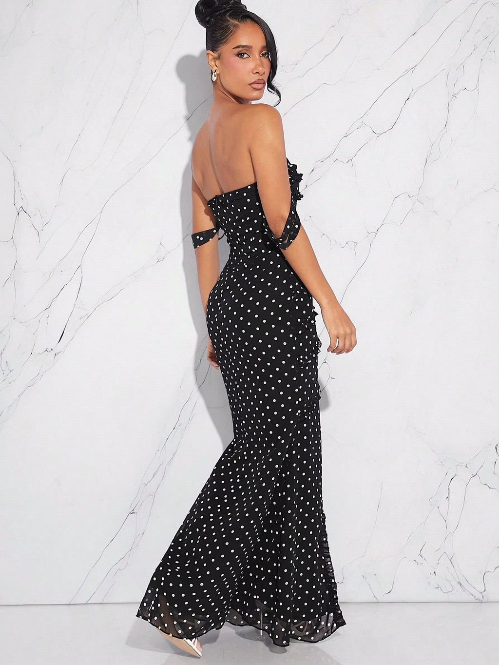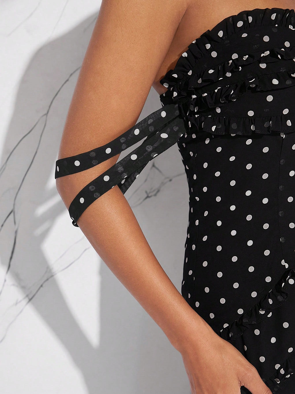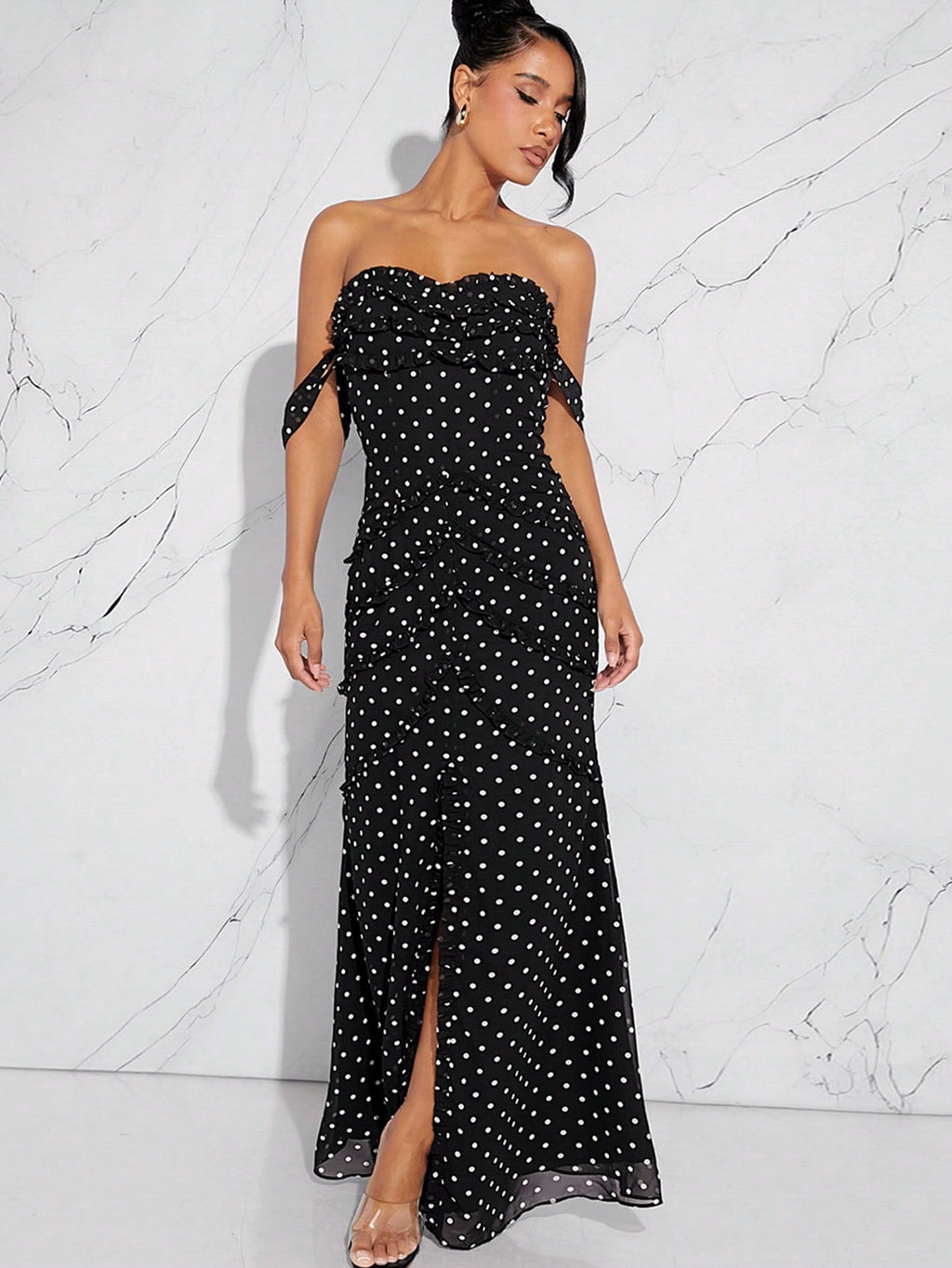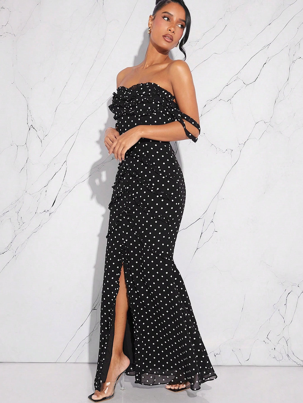 MIU Women Polka Dot Off-Shoulder Summer Slit Dress