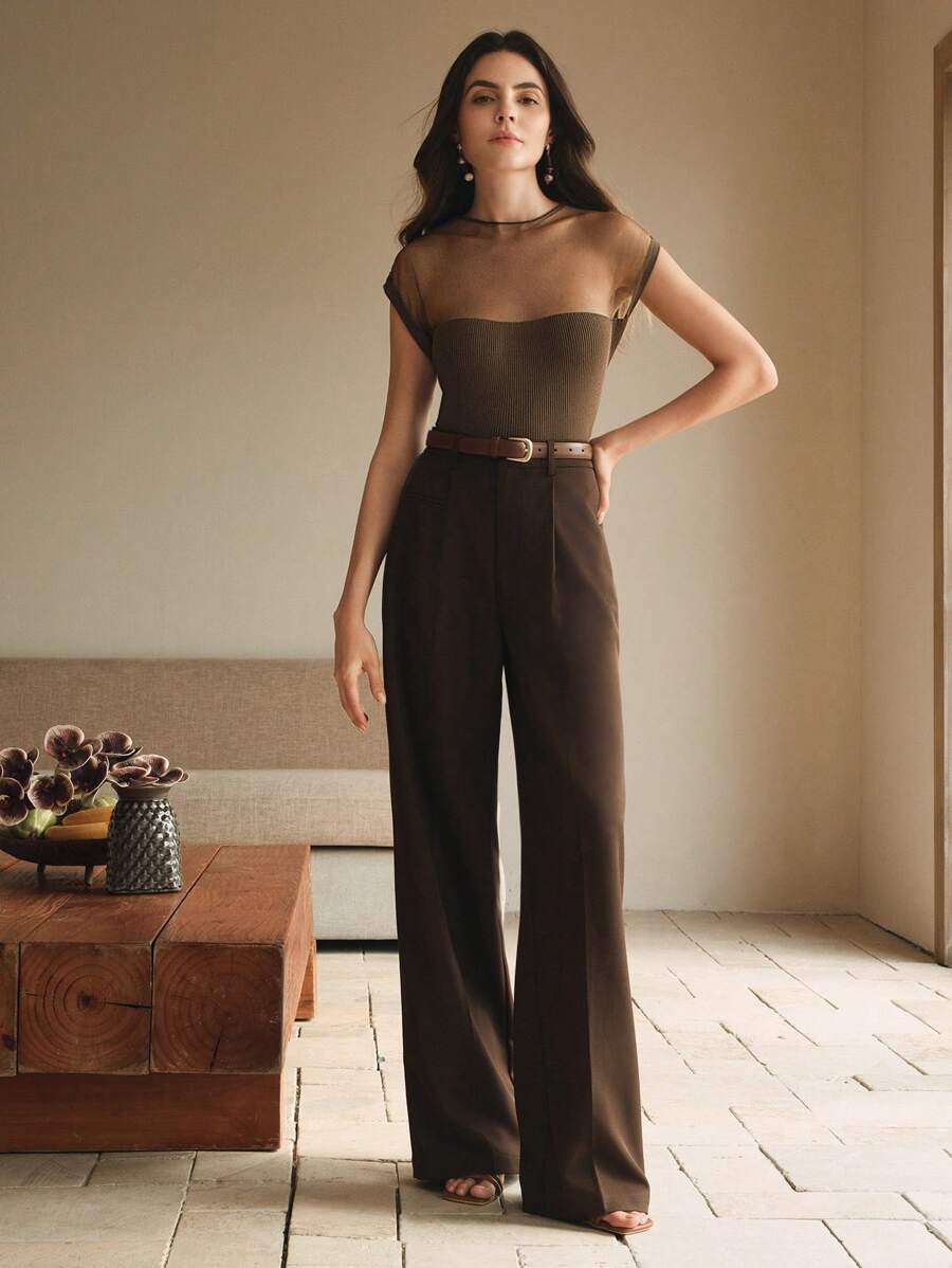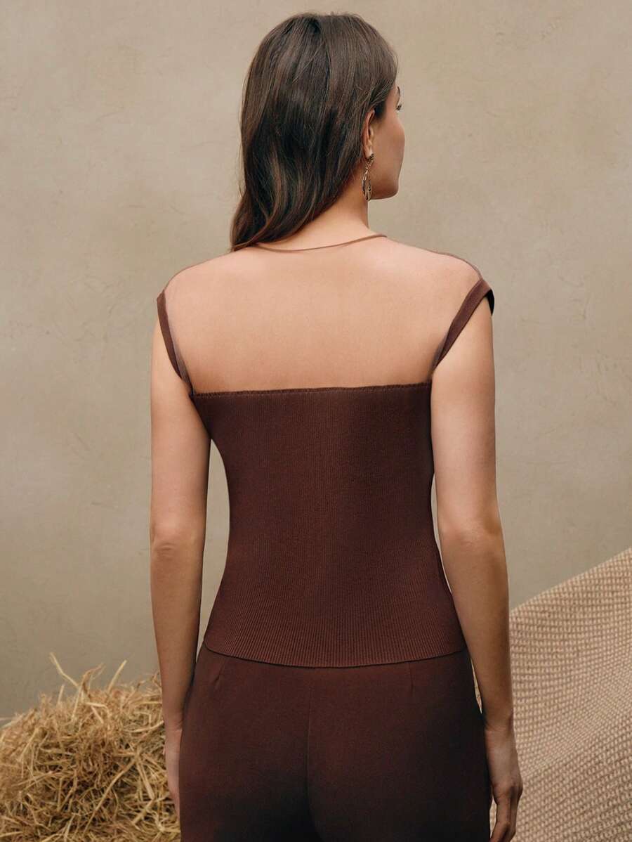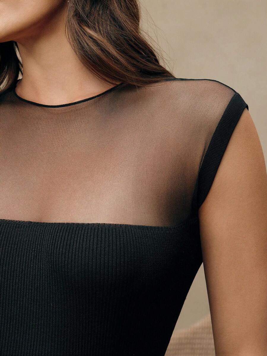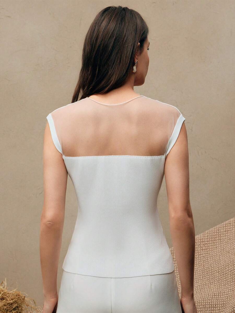 MIU Women Semi-High Collar Fitted Short Sleeve Mesh Patchwork Knit T-Shirt, Spring/Summer Outfits