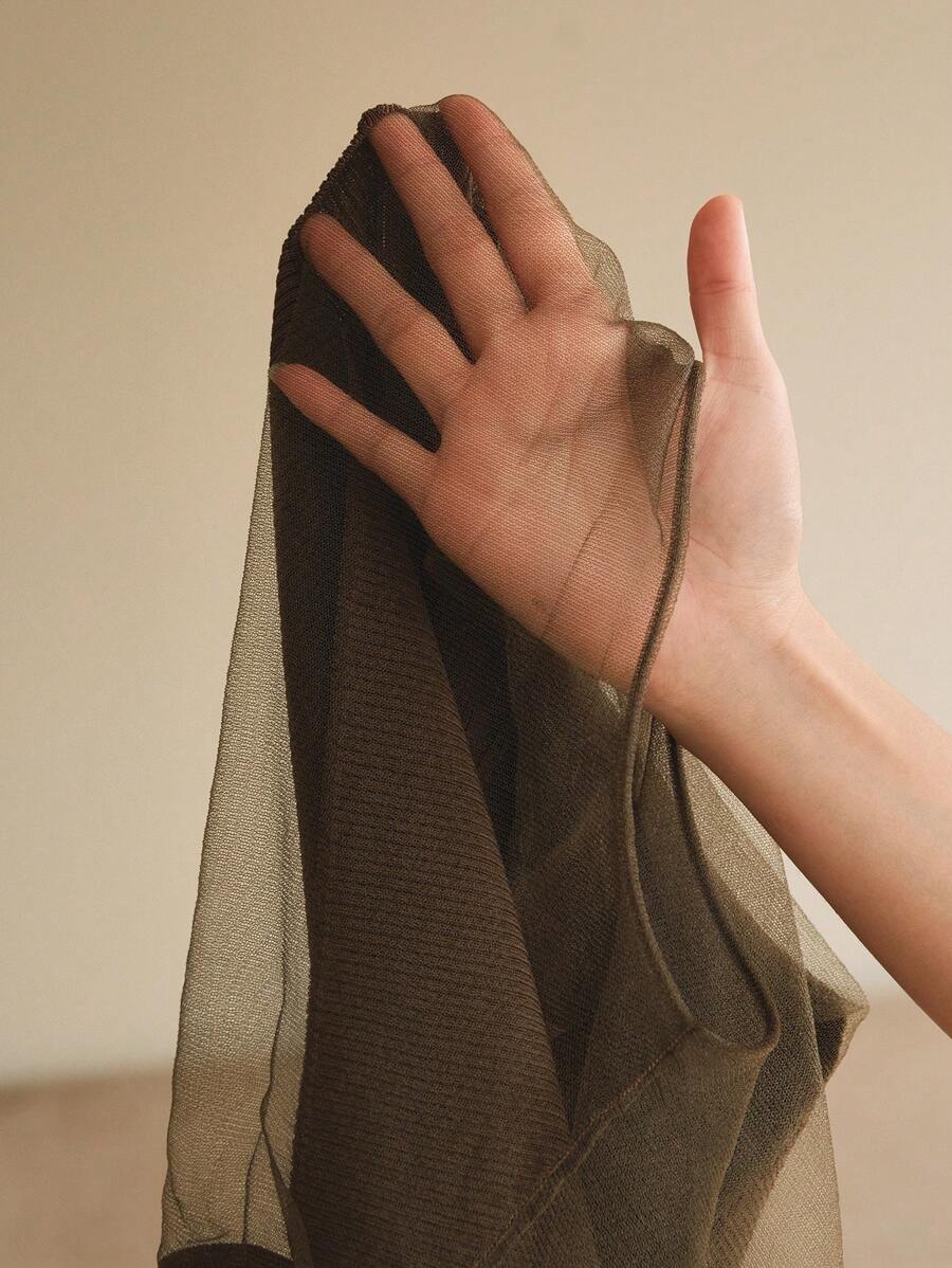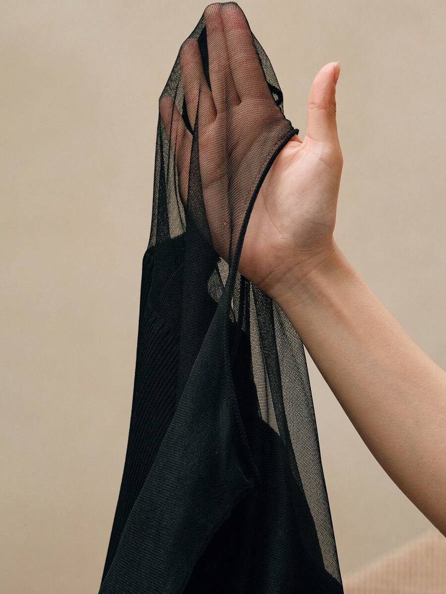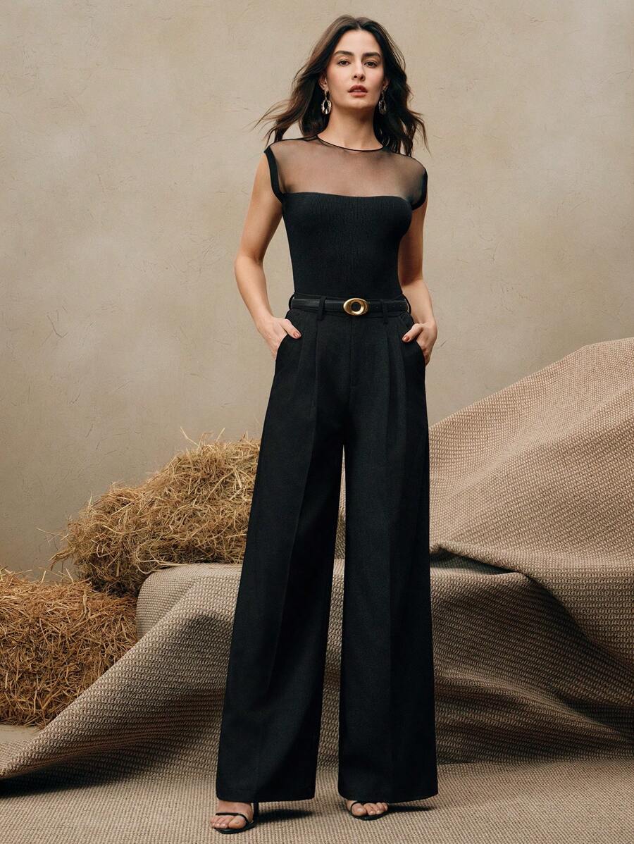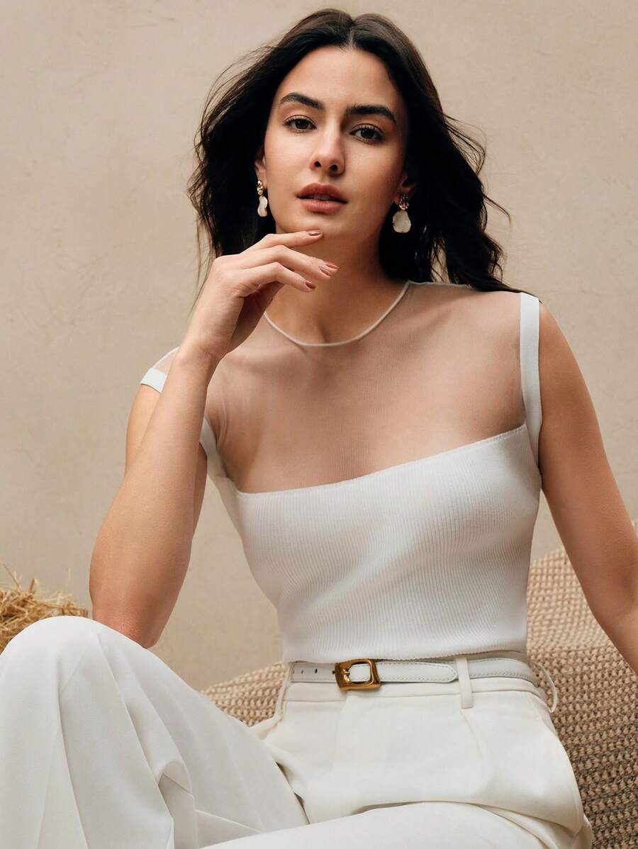MIU Women Semi-High Collar Fitted Short Sleeve Mesh Patchwork Knit T-Shirt, Spring/Summer Outfits