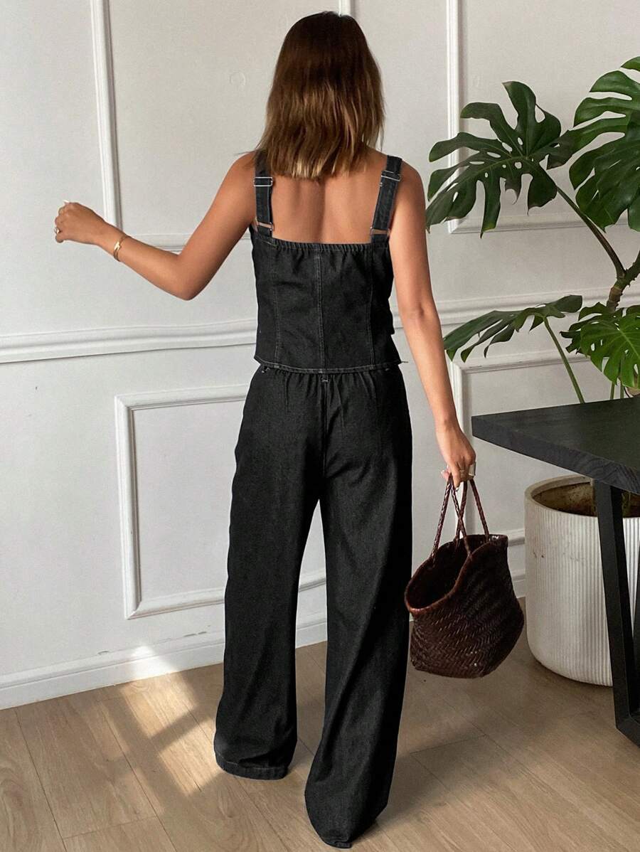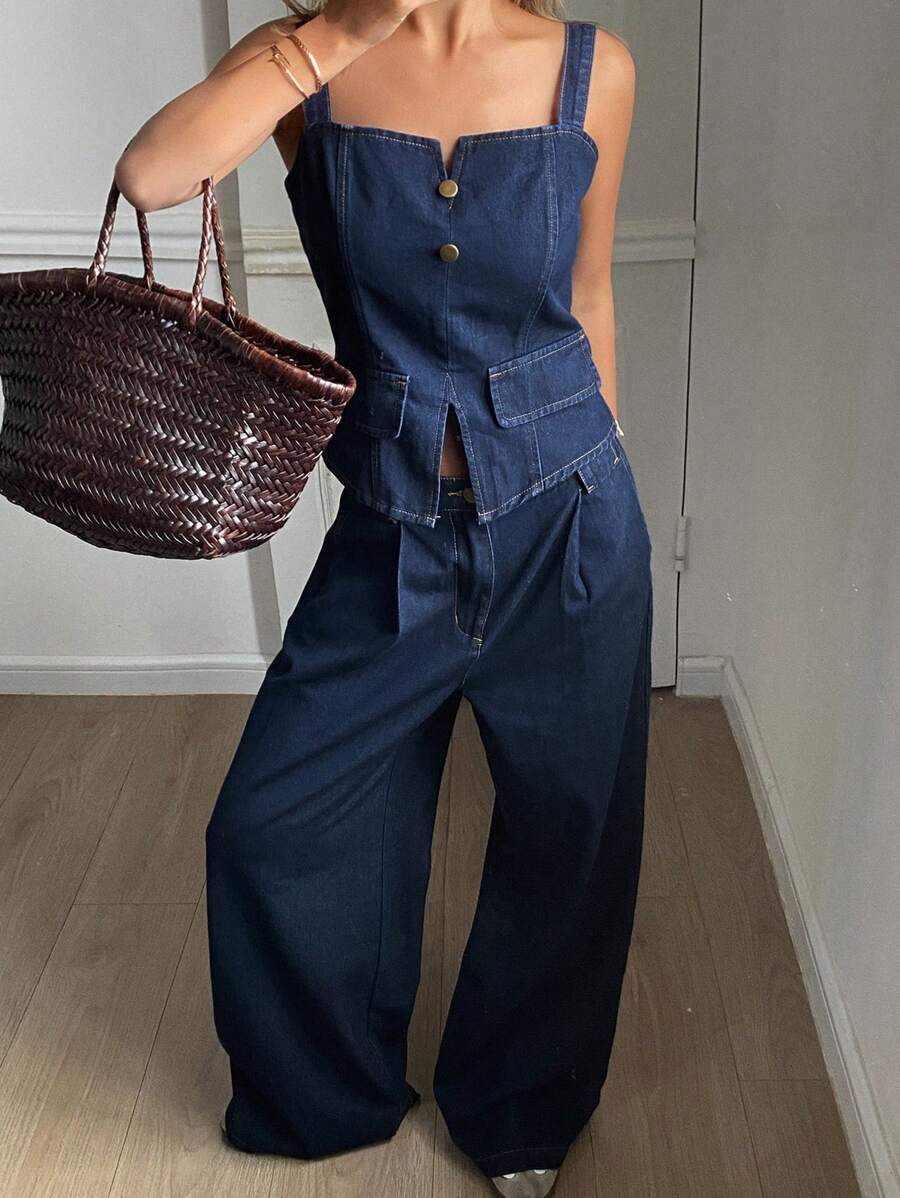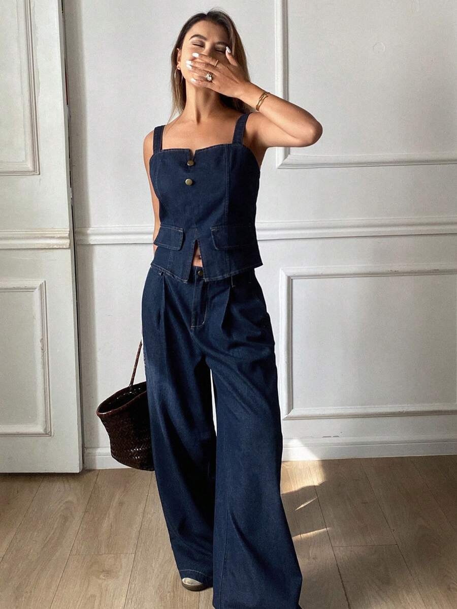 MIU Women Solid Color Fitted Camisole With Flared Leg Denim Jeans Set, Spring/Summer