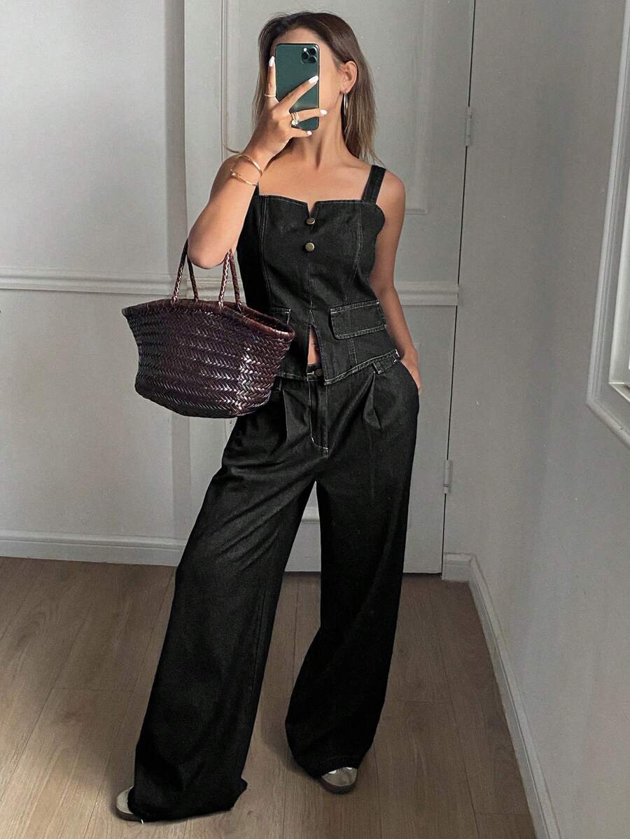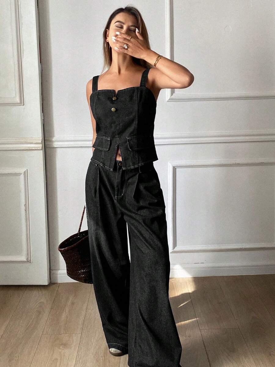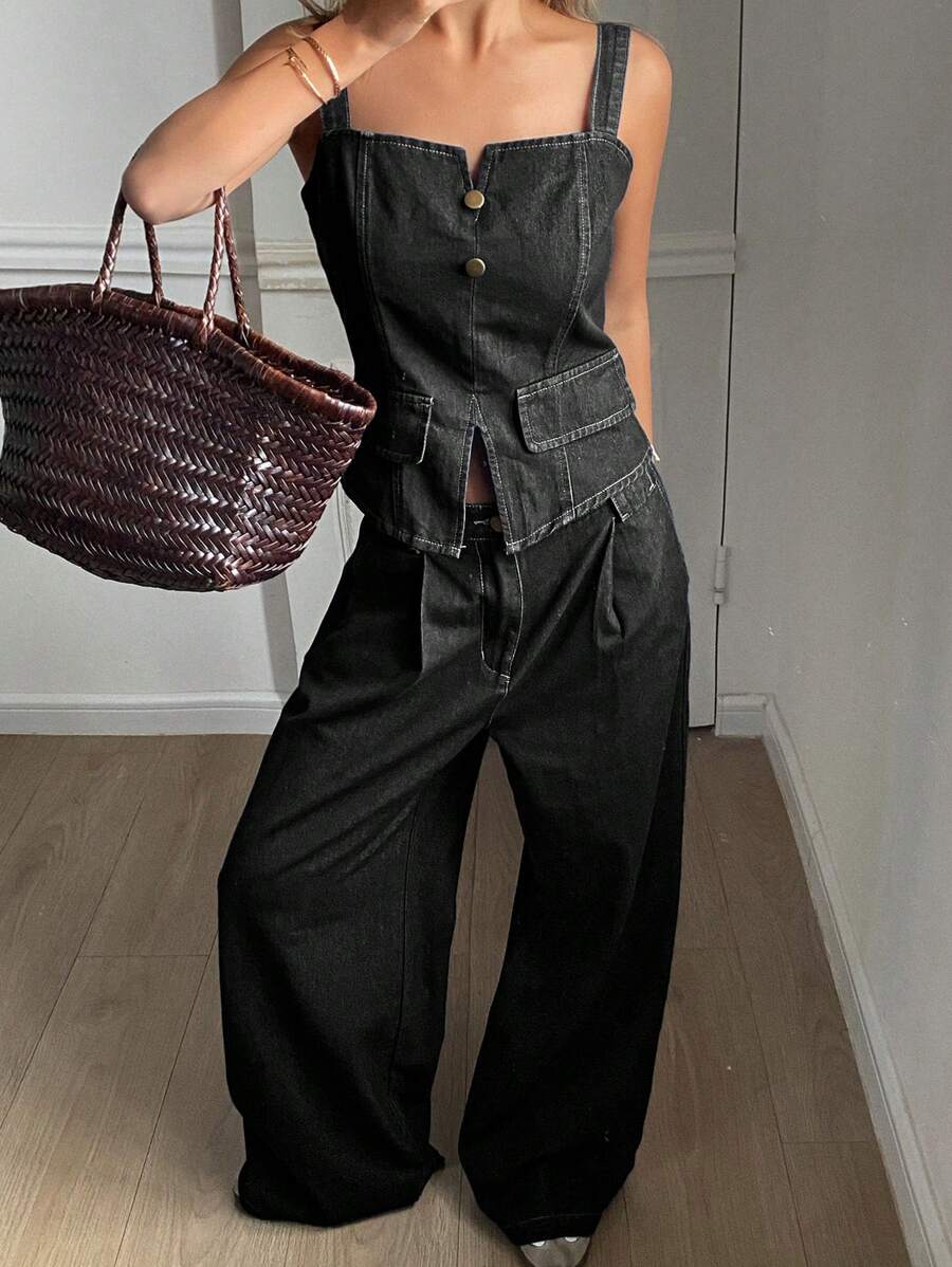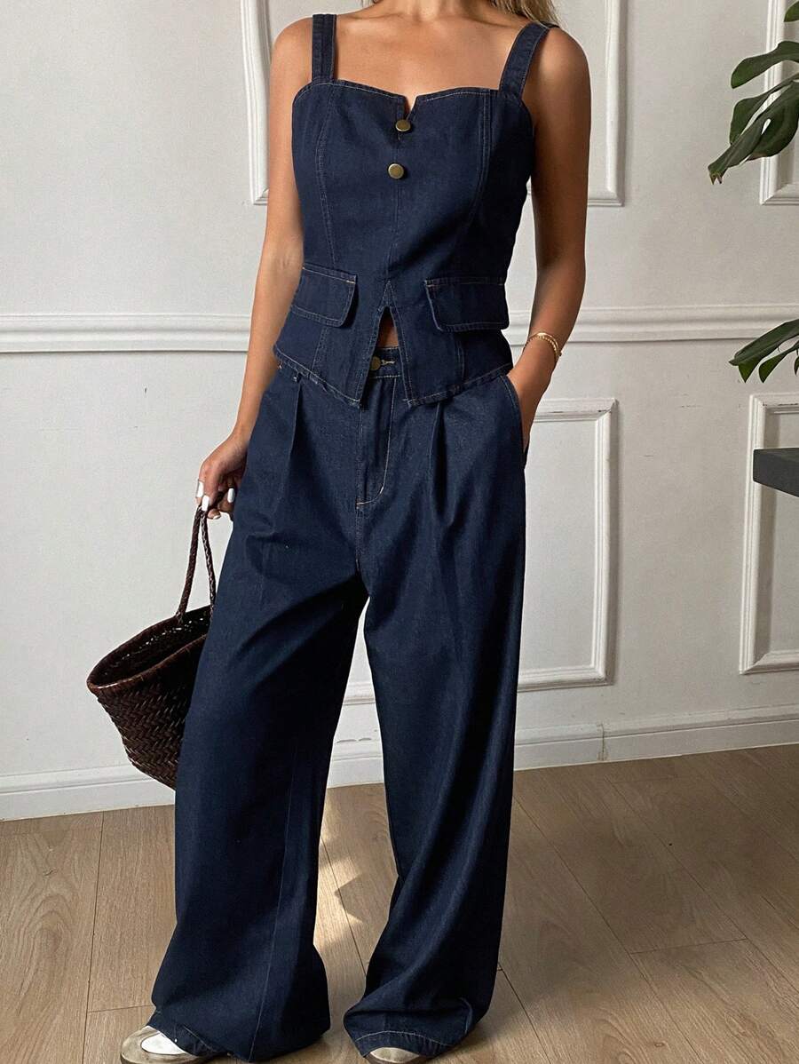 MIU Women Solid Color Fitted Camisole With Flared Leg Denim Jeans Set, Spring/Summer