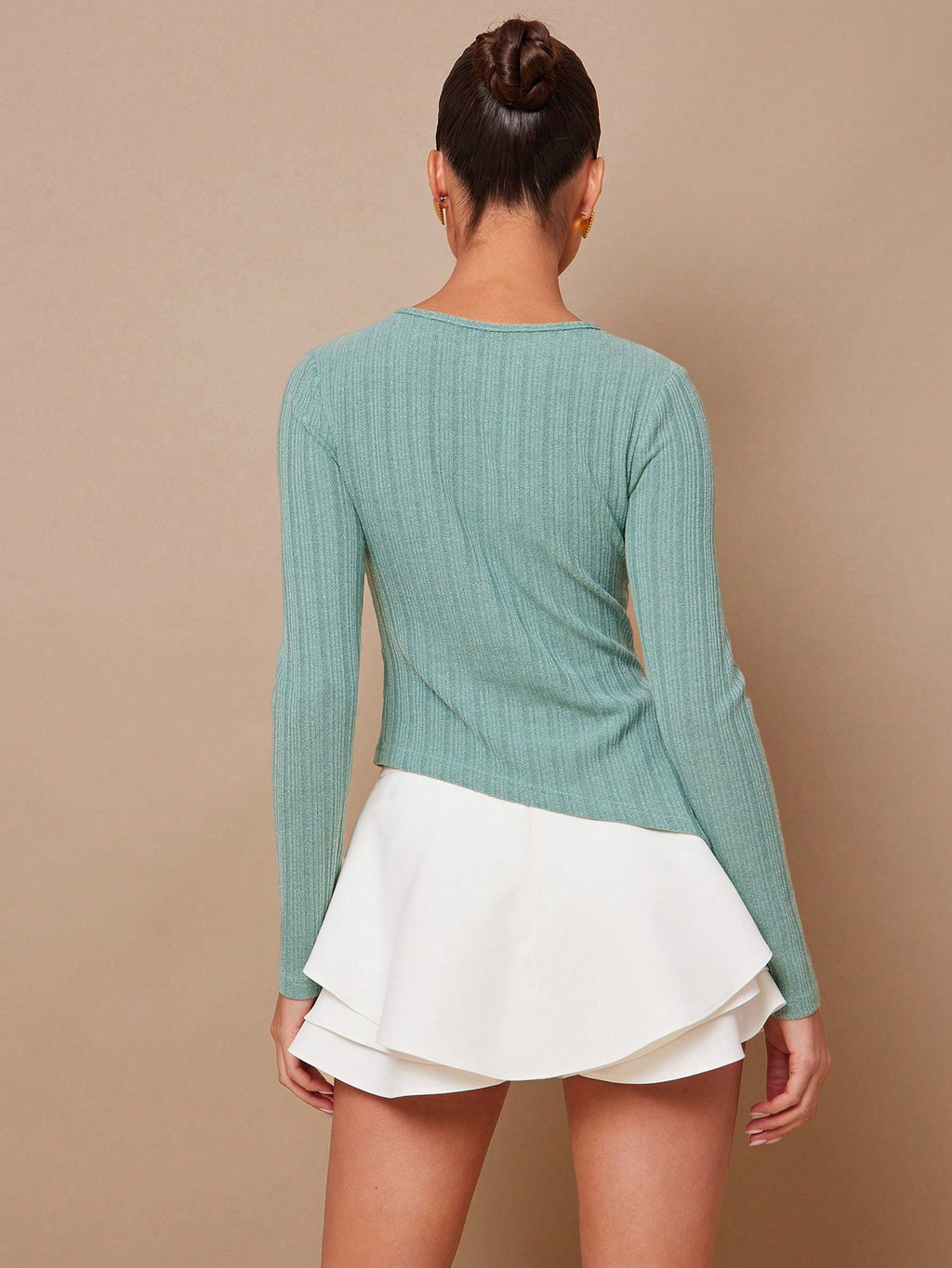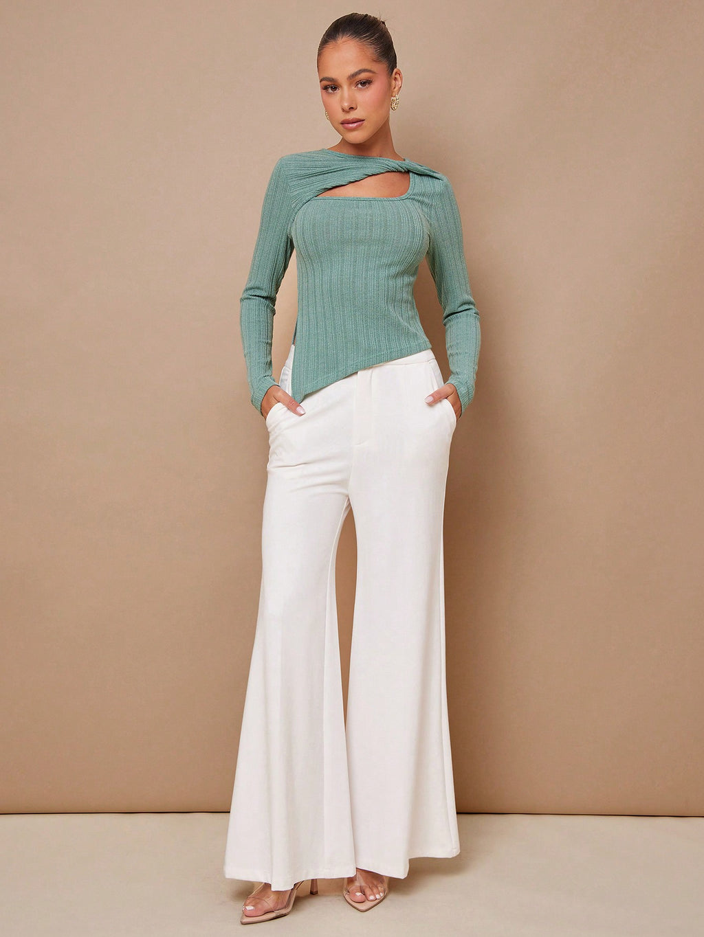 MIU Women Solid Color Hollow Out Casual Slim Fit Long Sleeve Blouse