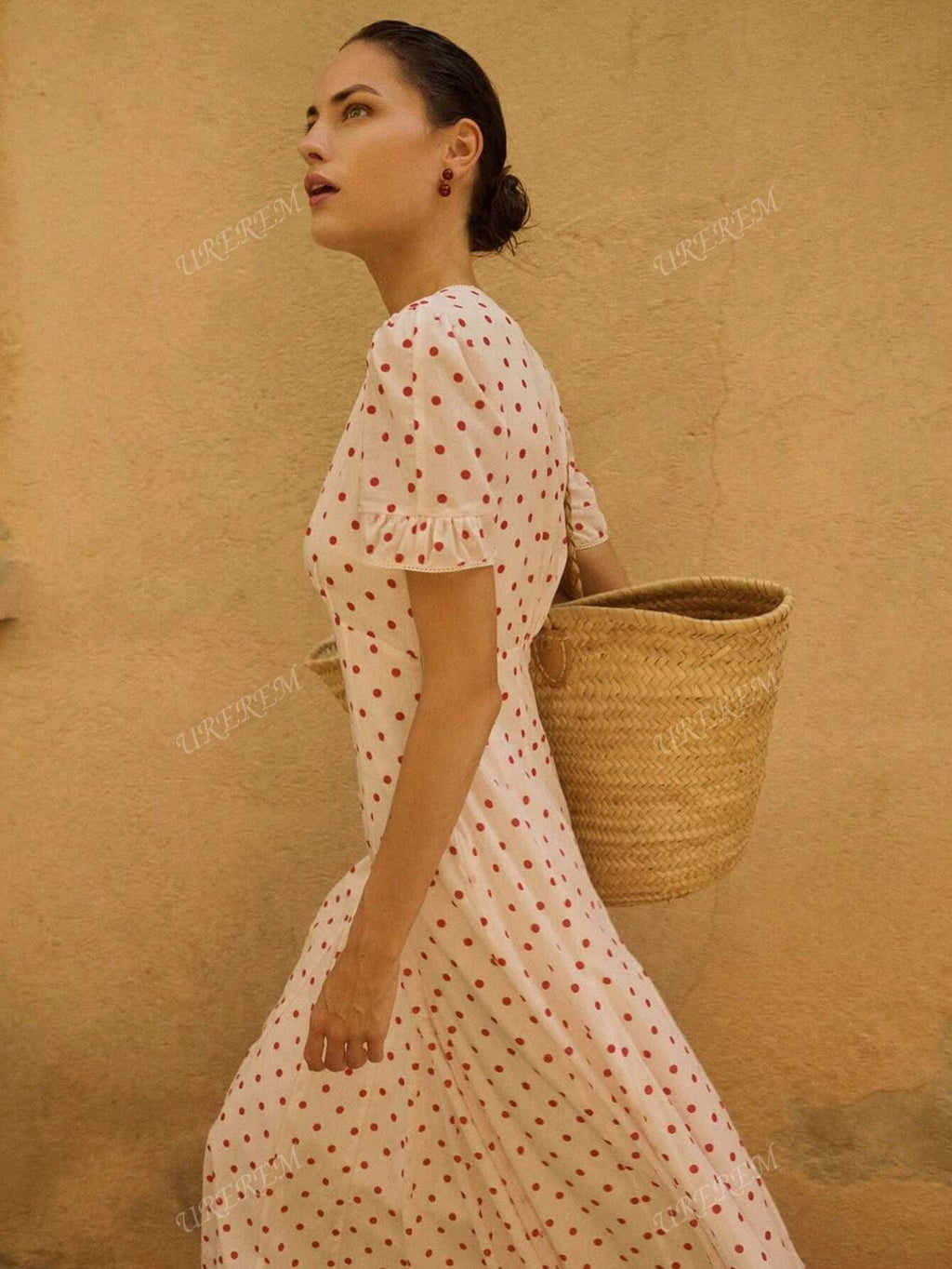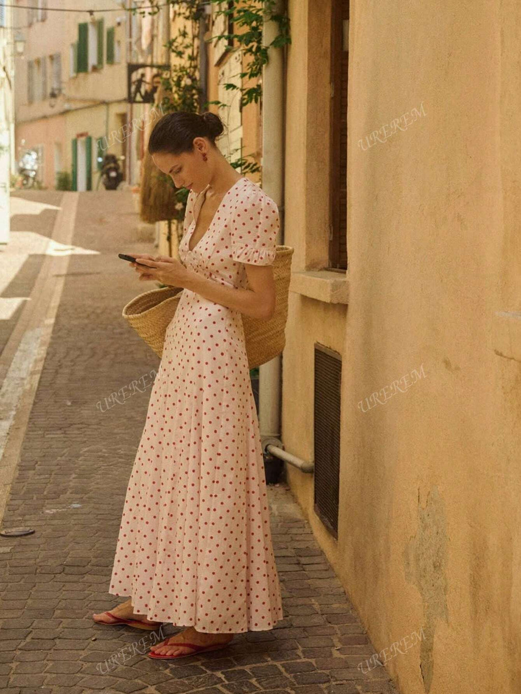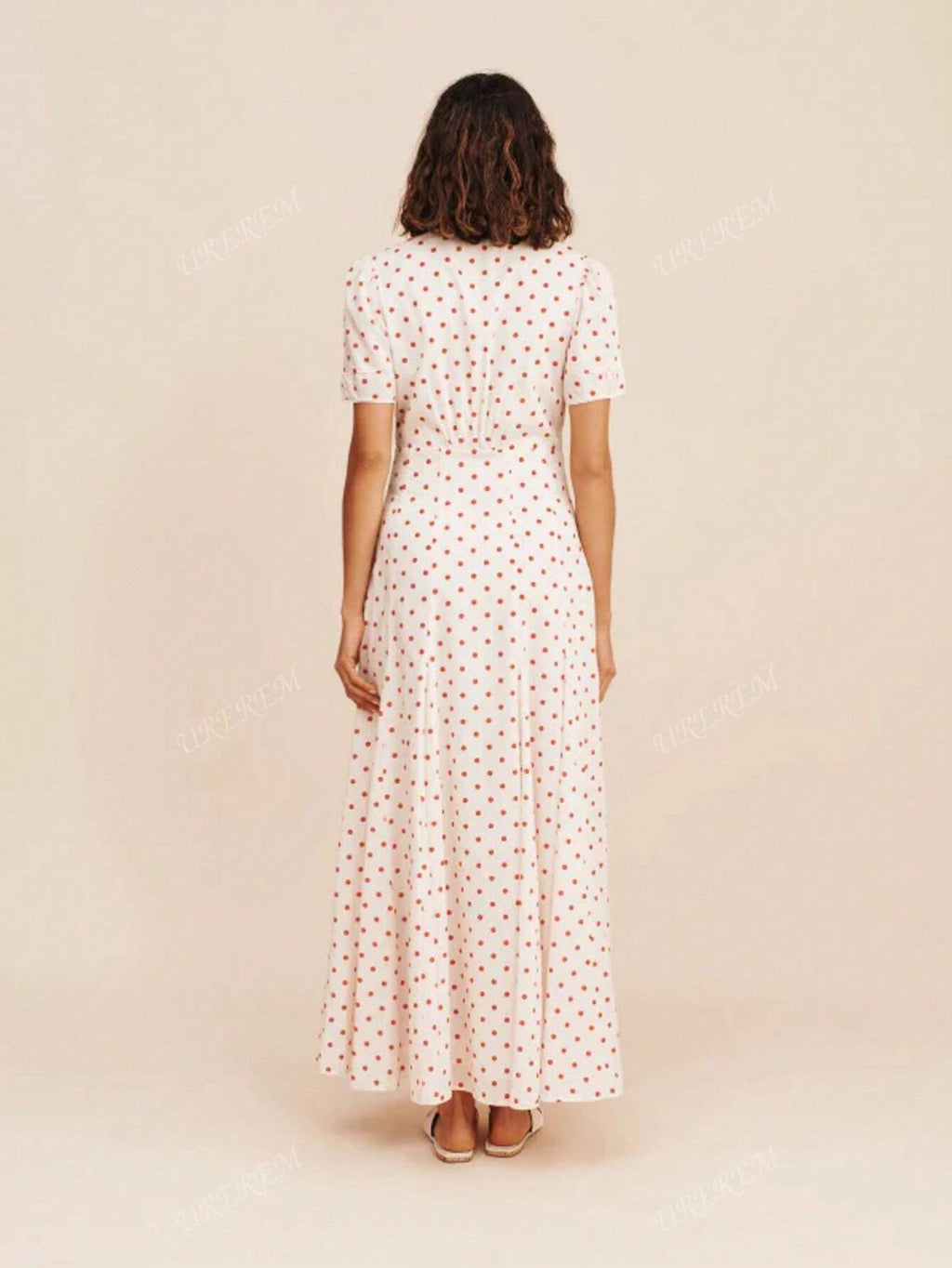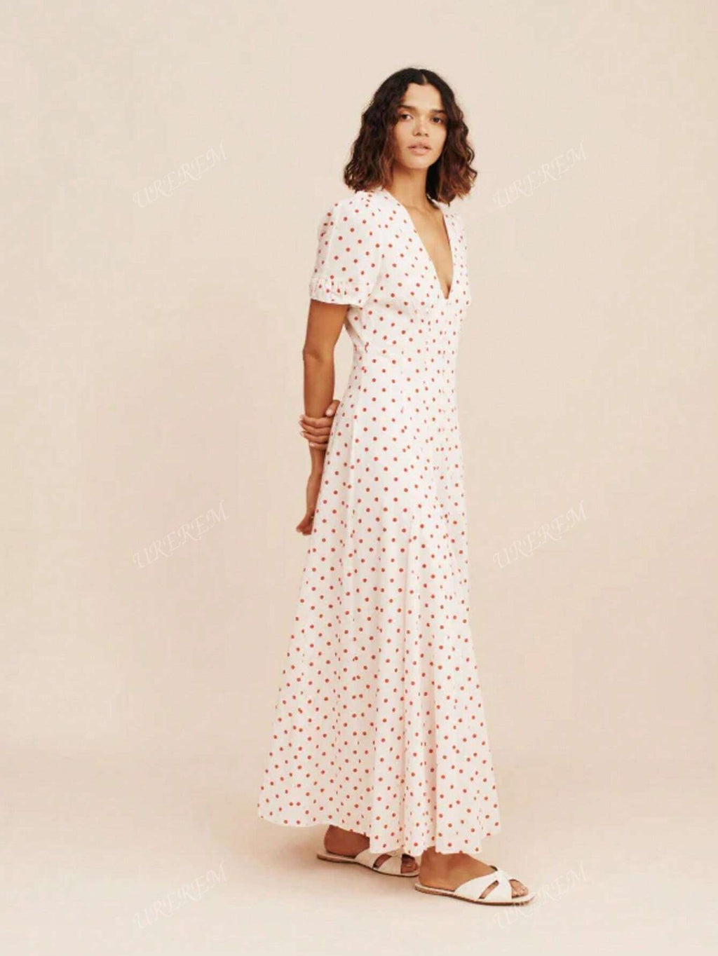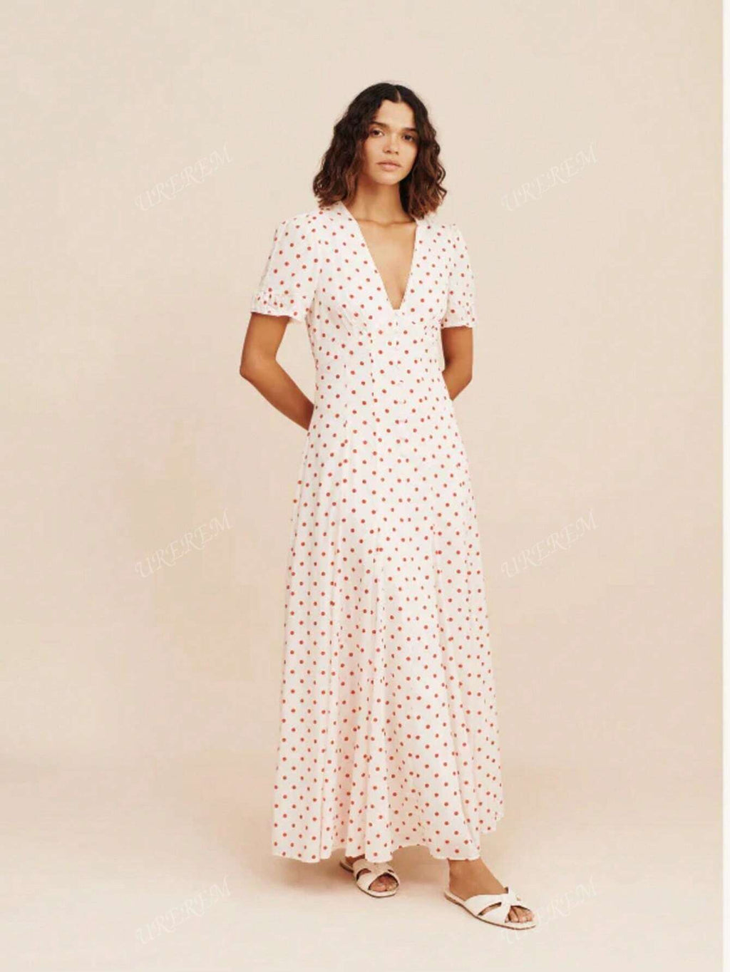 MIU Women Summer V-Neck Fitted Flower Polka Dot Print Lightweight Woven Long Dress, 120g