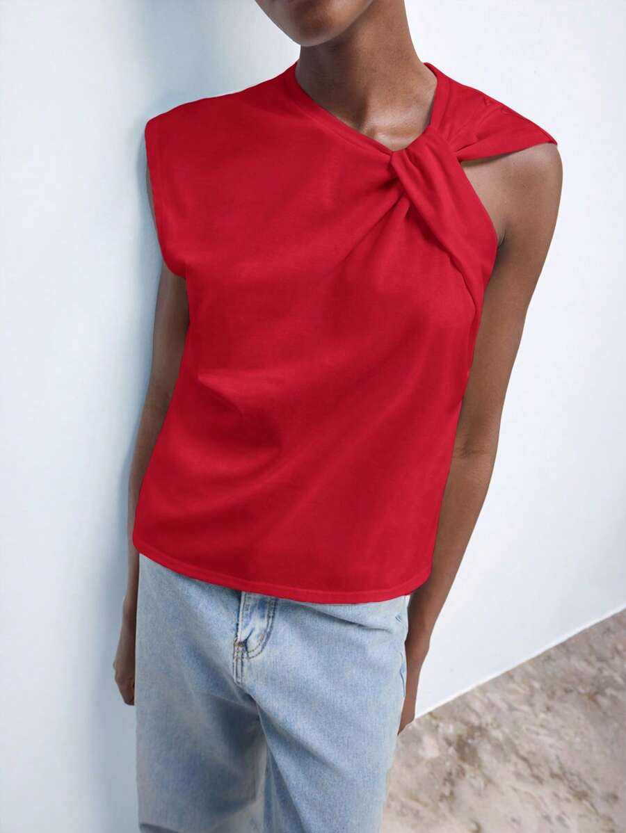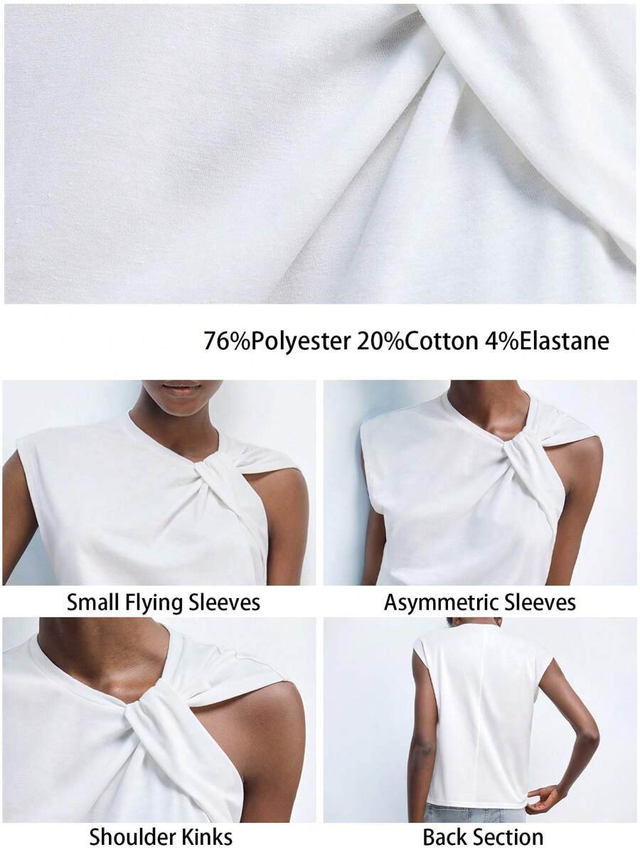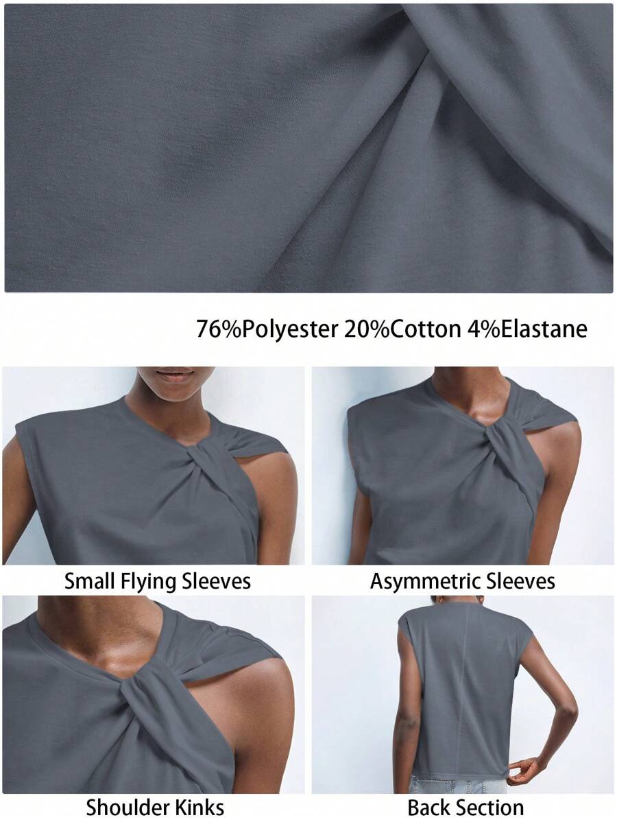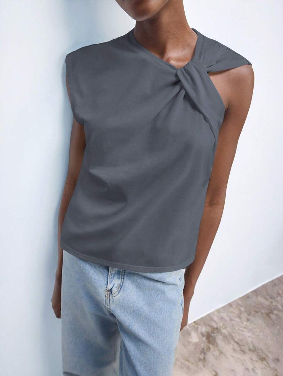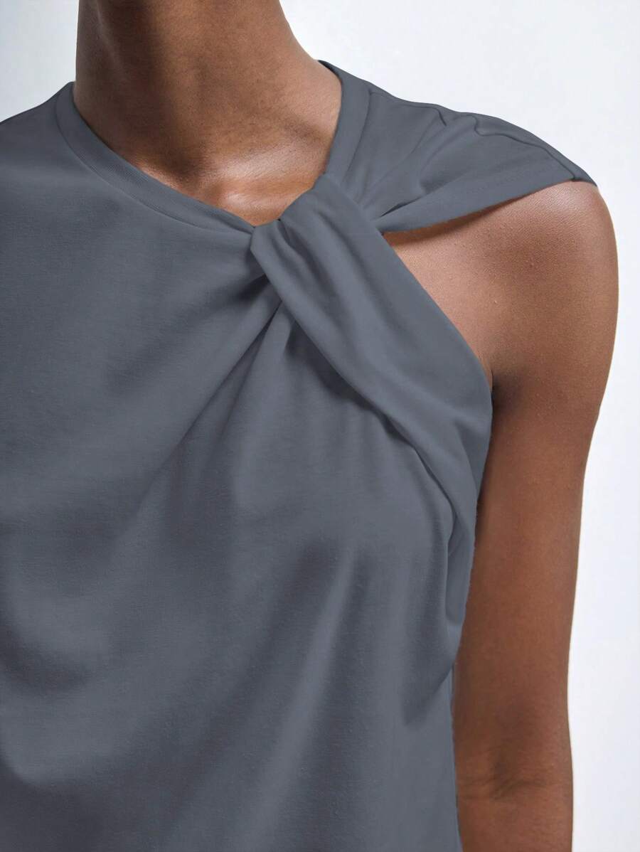MIU Women's 2025 Summer New Arrival Asymmetric Single Shoulder Twist Knot Design Loose Vintage Chic Urban Casual Pullover T-Shirt, Suitable For Party, Music Festival, Graduation, Business Casual, Office Wear