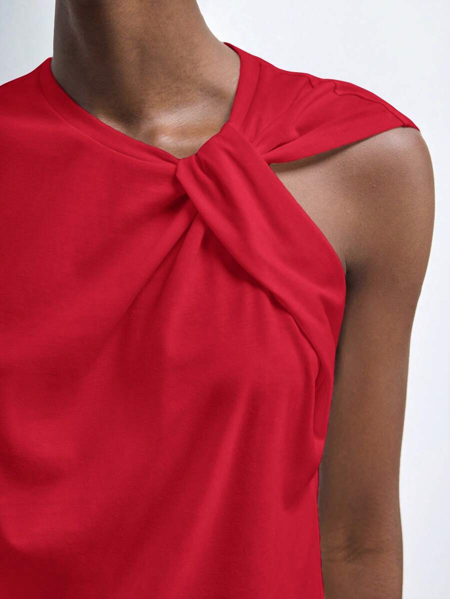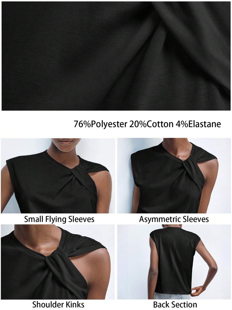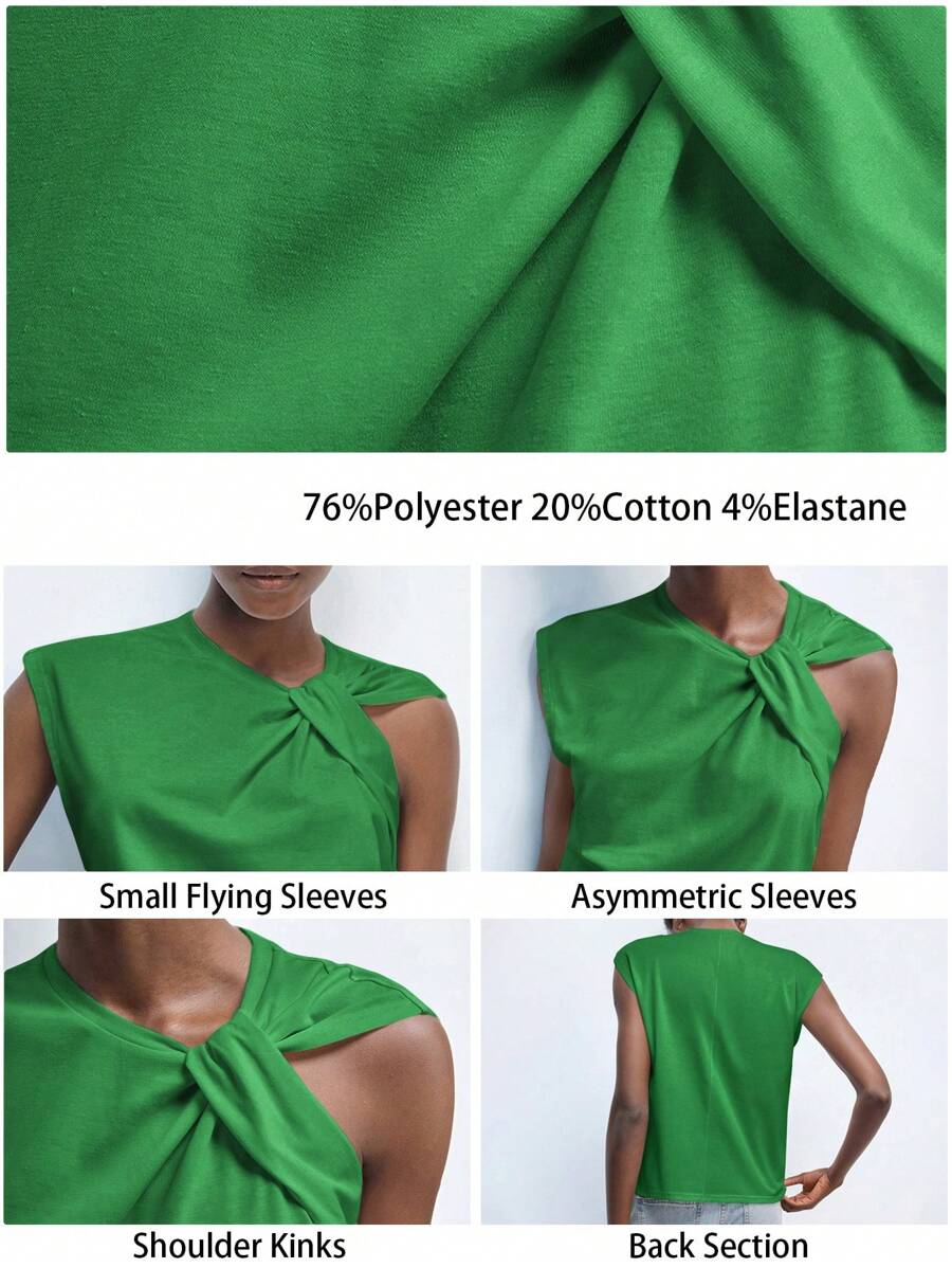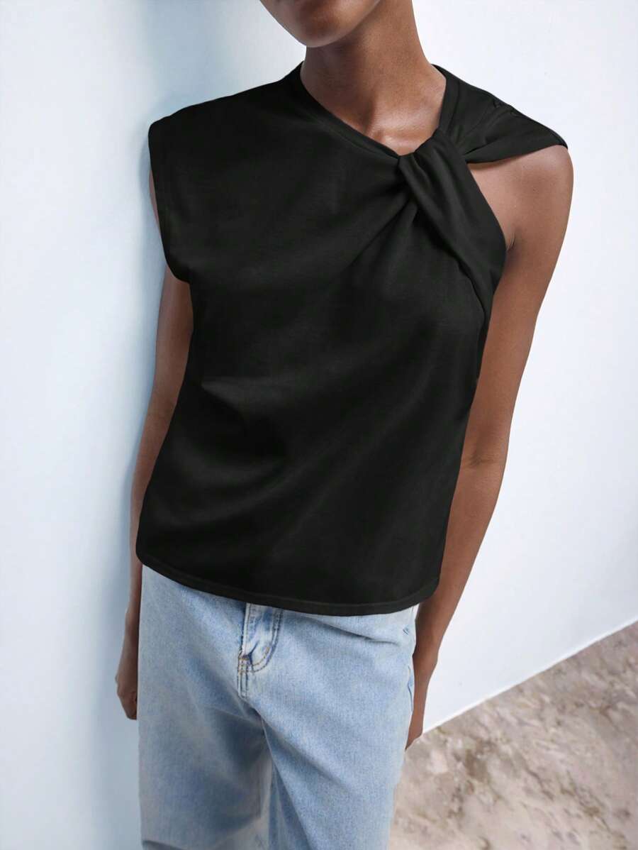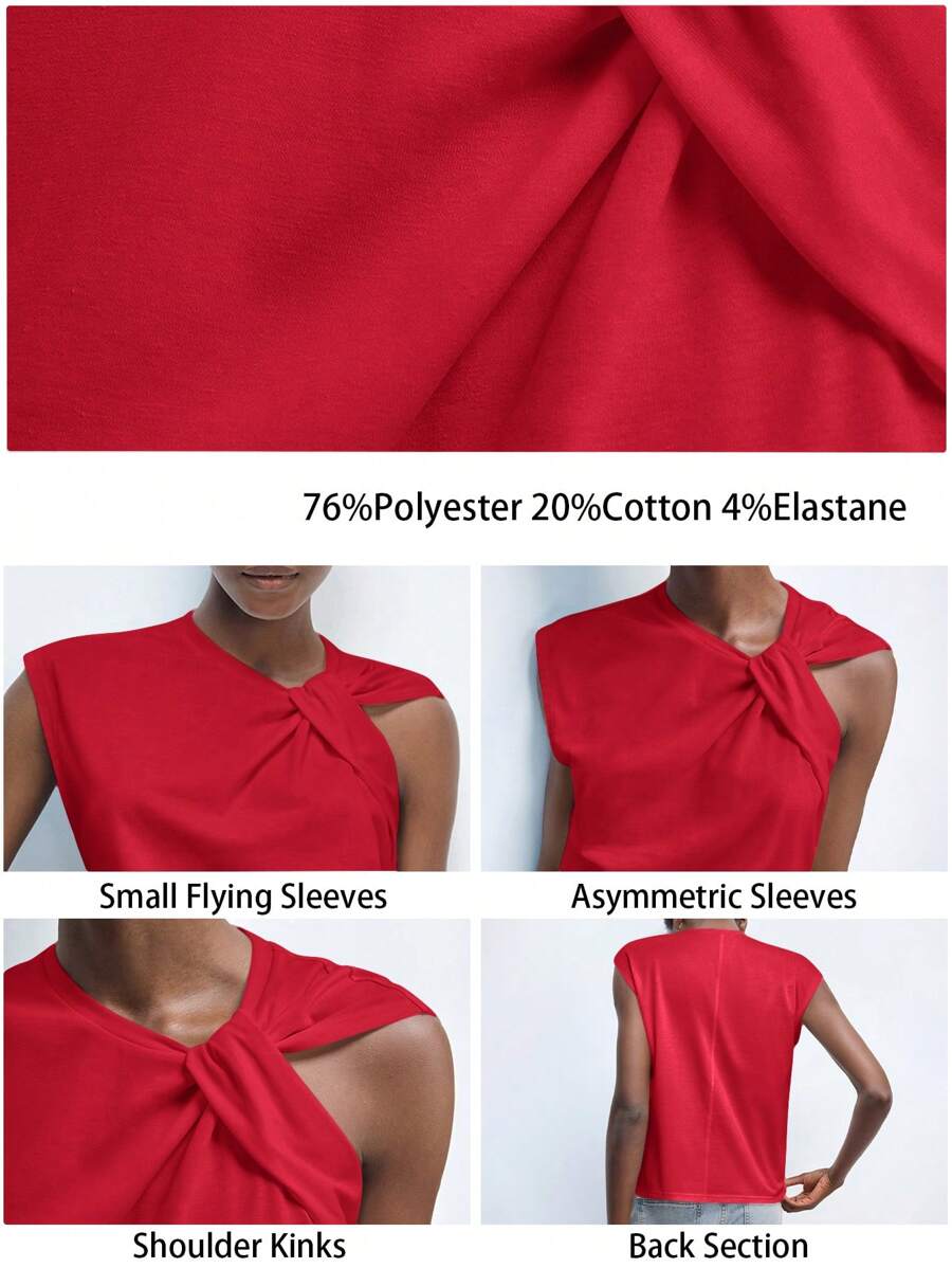 MIU Women's 2025 Summer New Arrival Asymmetric Single Shoulder Twist Knot Design Loose Vintage Chic Urban Casual Pullover T-Shirt, Suitable For Party, Music Festival, Graduation, Business Casual, Office Wear