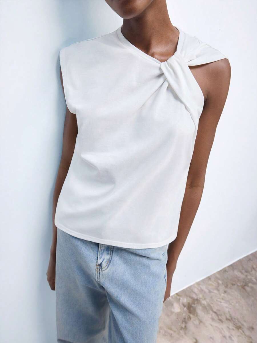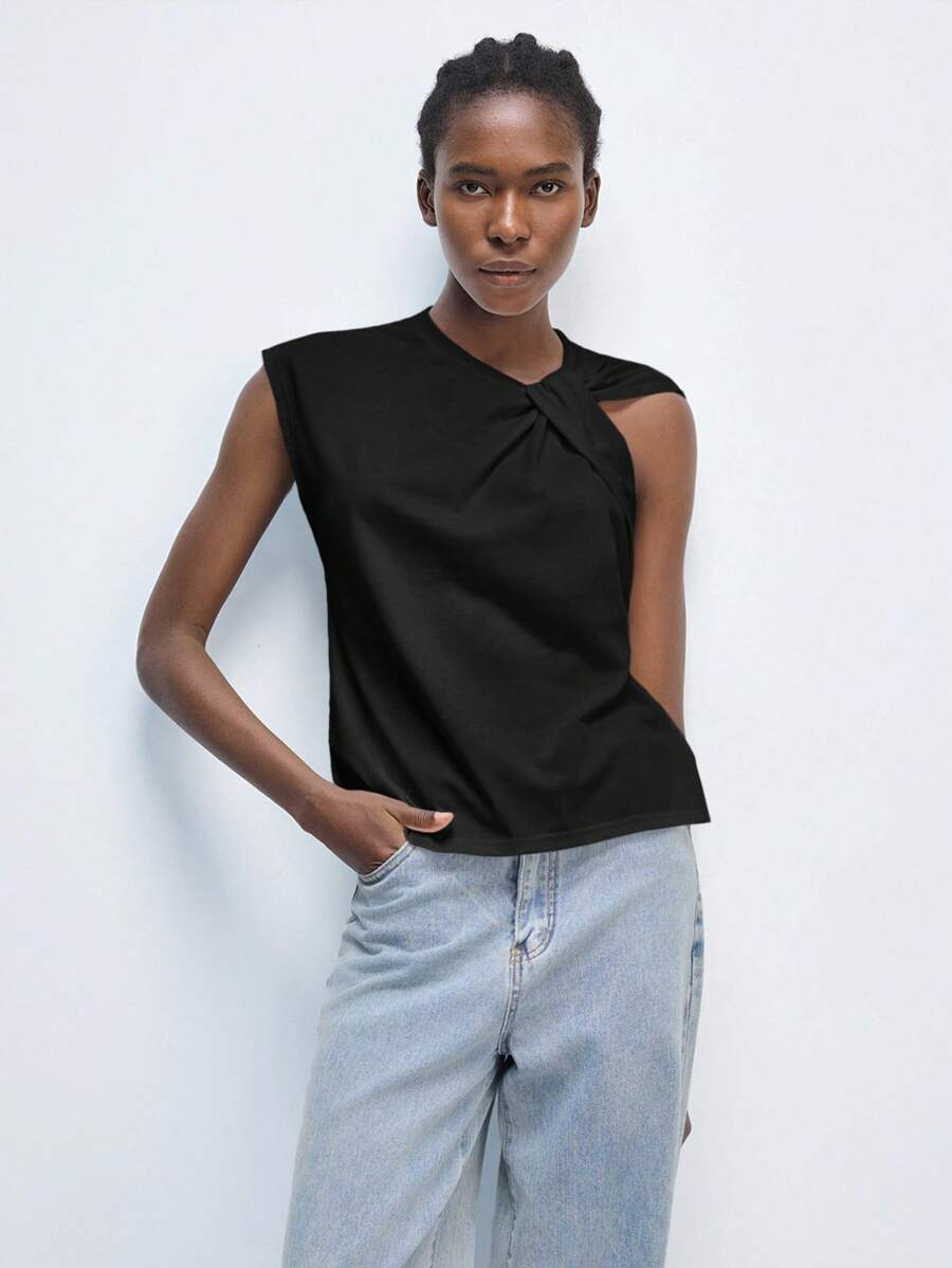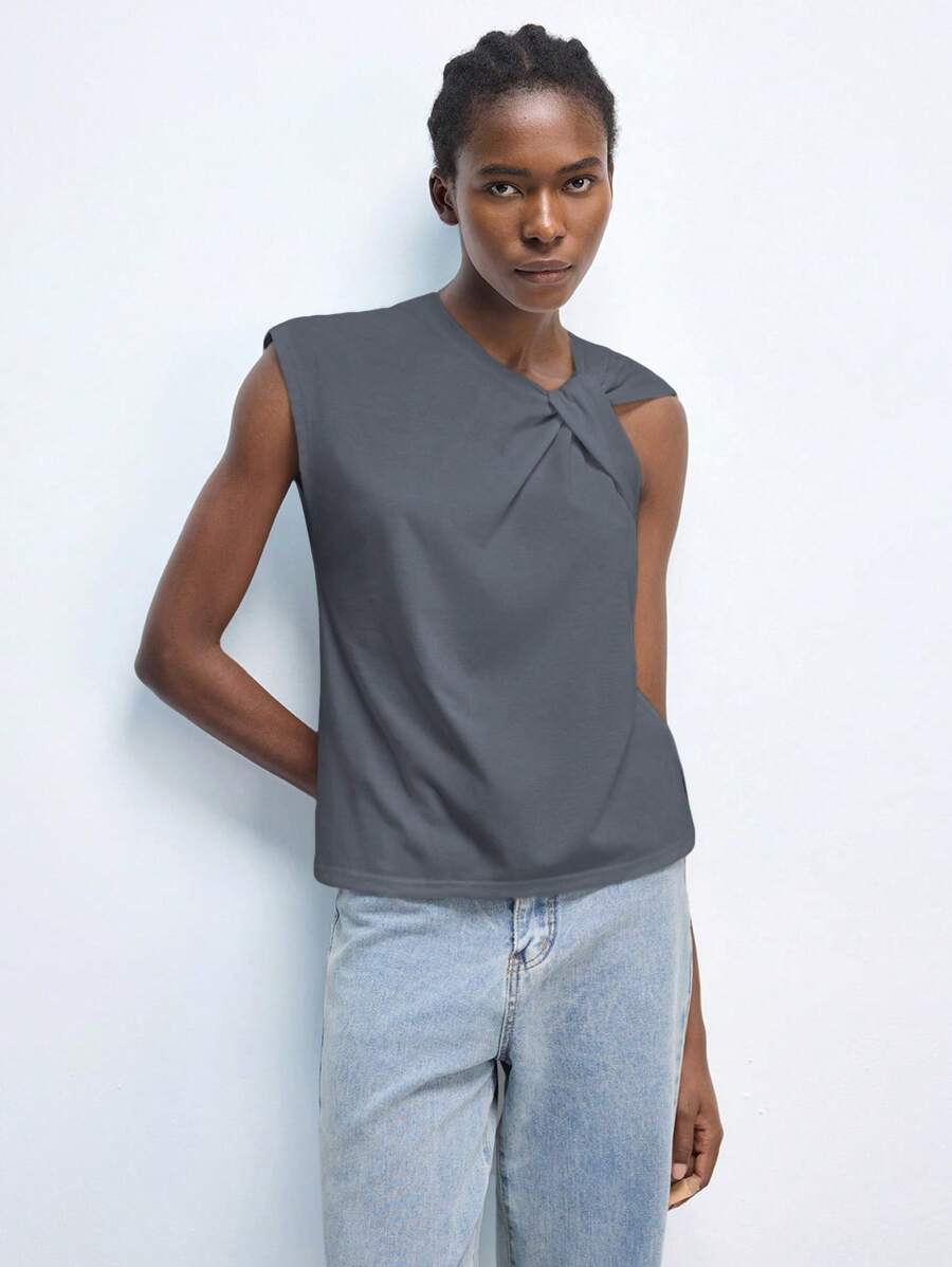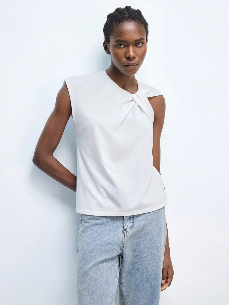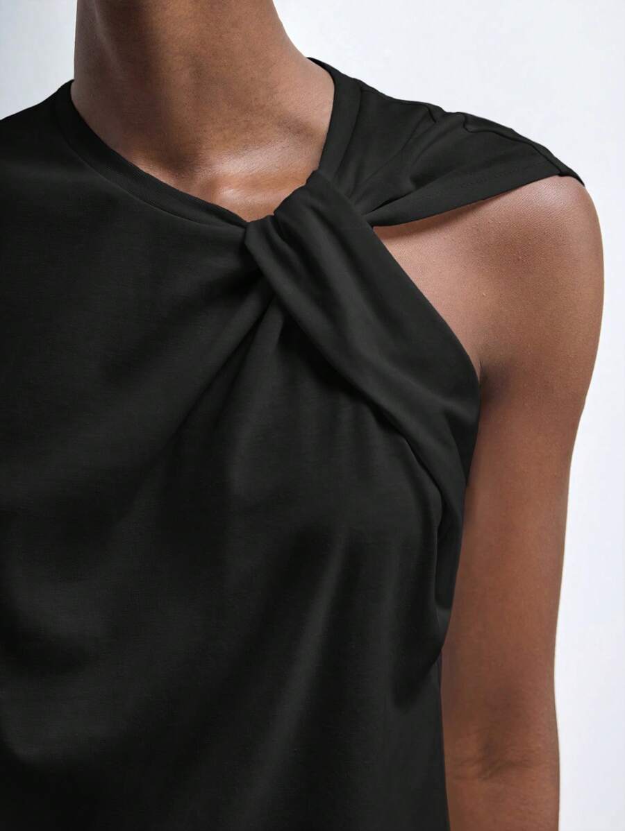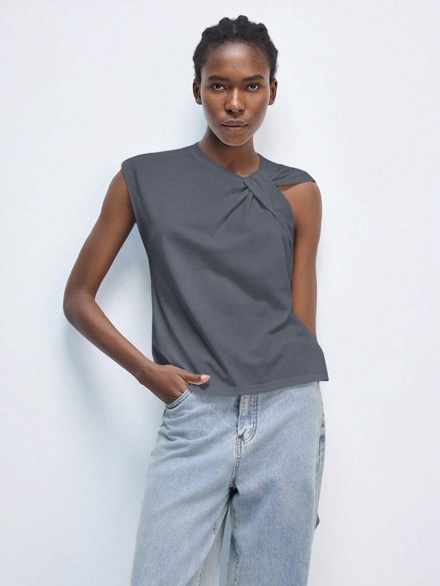 MIU Women's 2025 Summer New Arrival Asymmetric Single Shoulder Twist Knot Design Loose Vintage Chic Urban Casual Pullover T-Shirt, Suitable For Party, Music Festival, Graduation, Business Casual, Office Wear