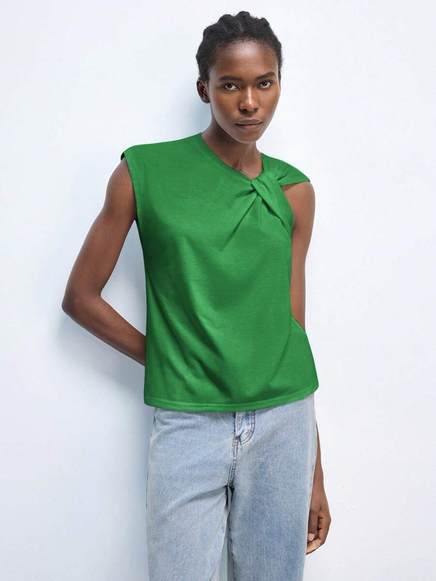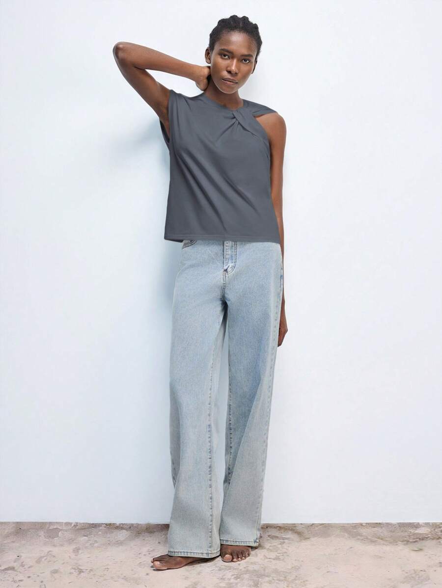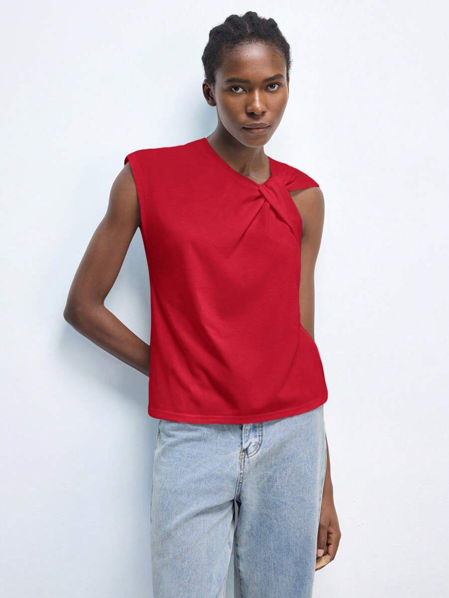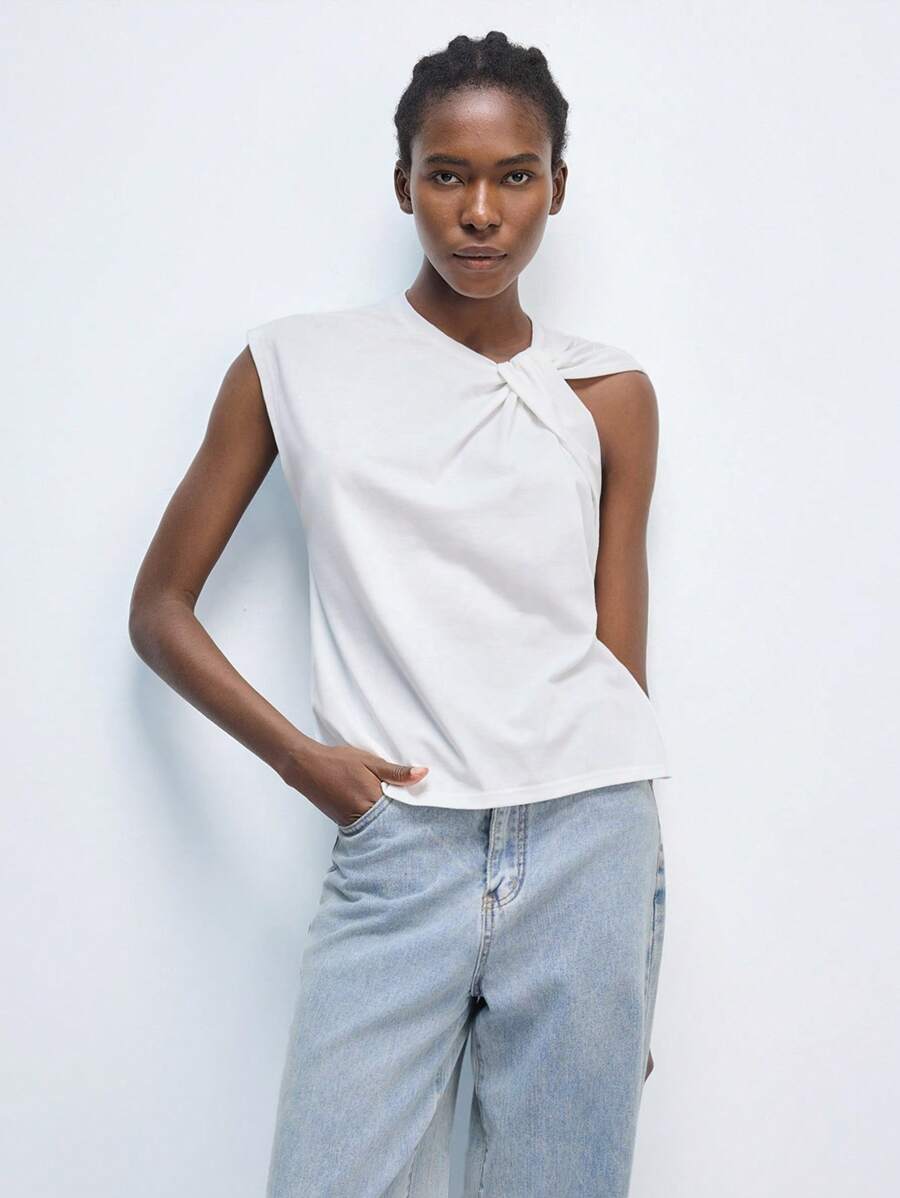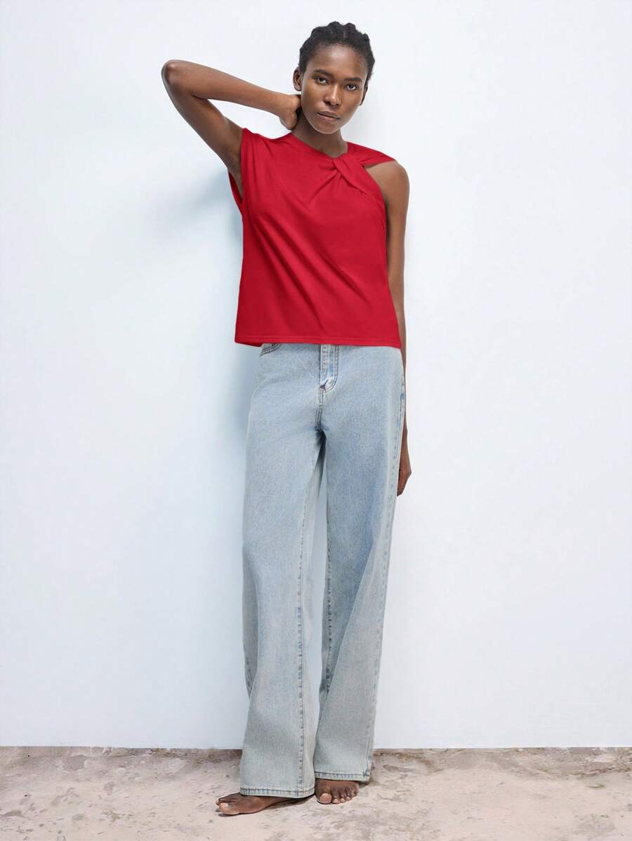 MIU Women's 2025 Summer New Arrival Asymmetric Single Shoulder Twist Knot Design Loose Vintage Chic Urban Casual Pullover T-Shirt, Suitable For Party, Music Festival, Graduation, Business Casual, Office Wear