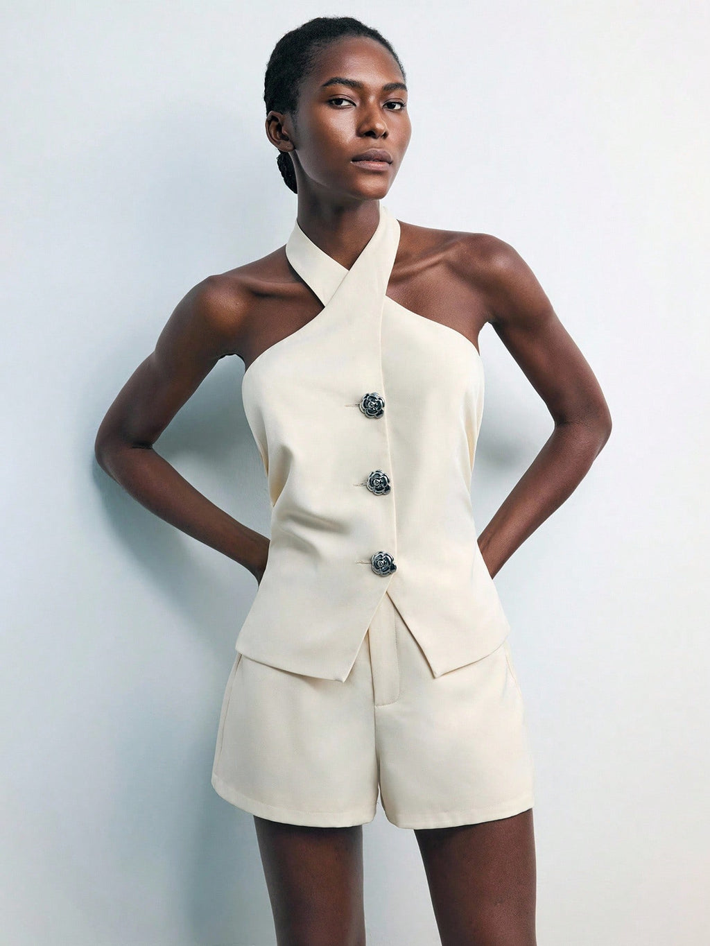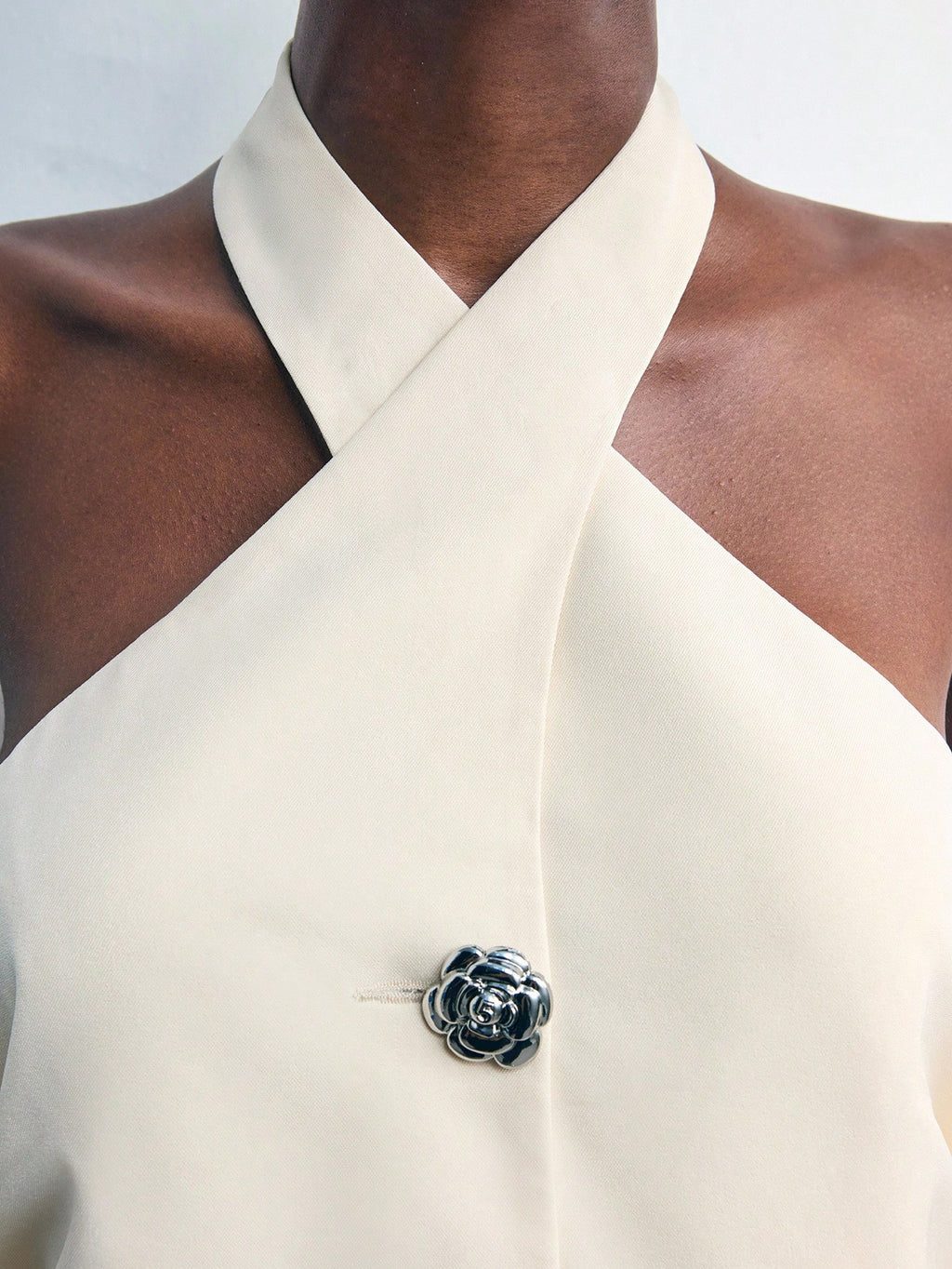 MIU Women's Apricot Sleeveless Vest Top With Metal Flower Decor, Elegant