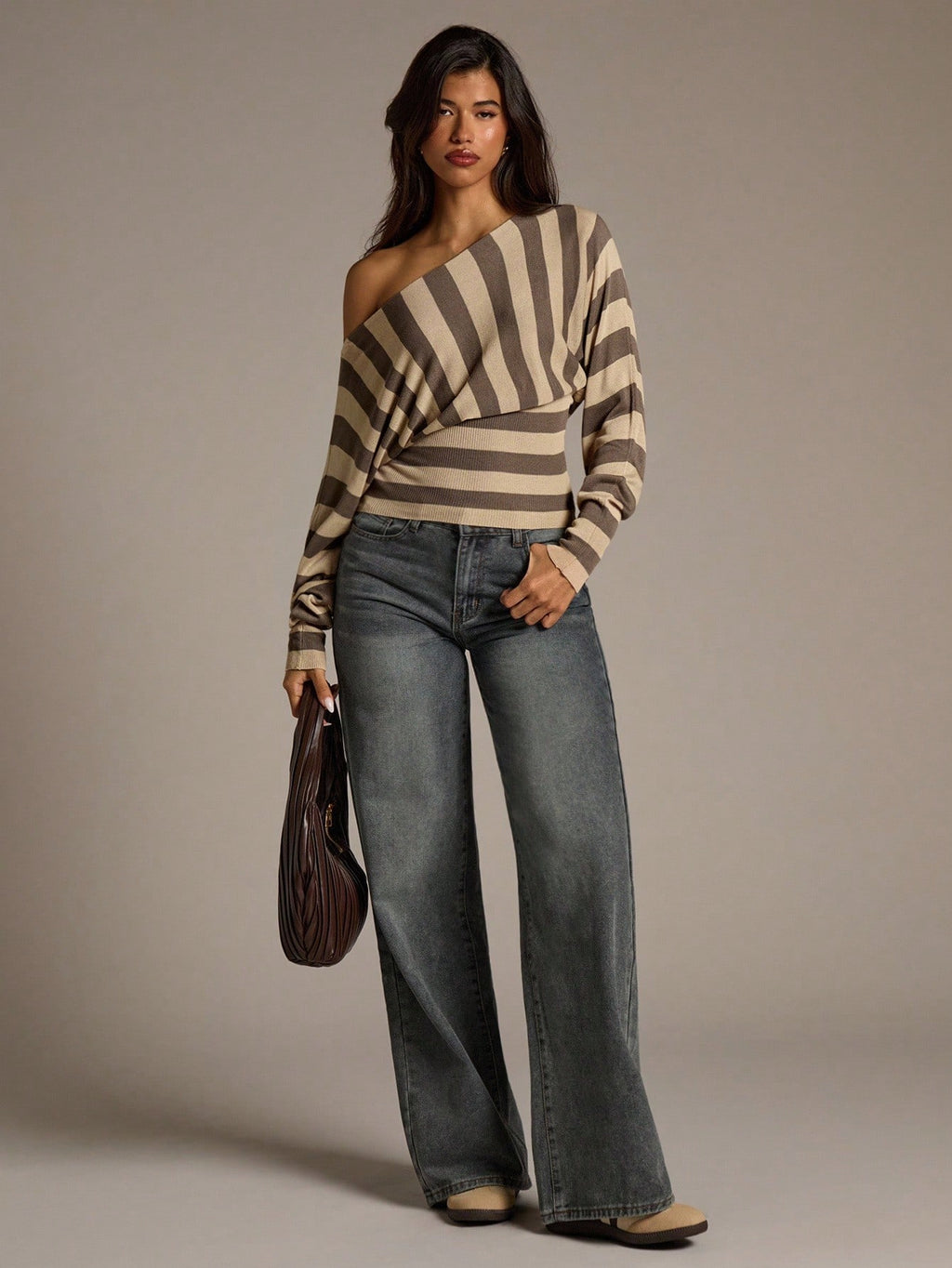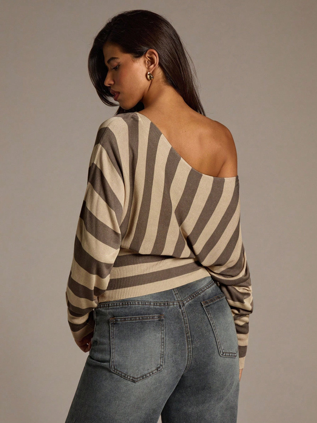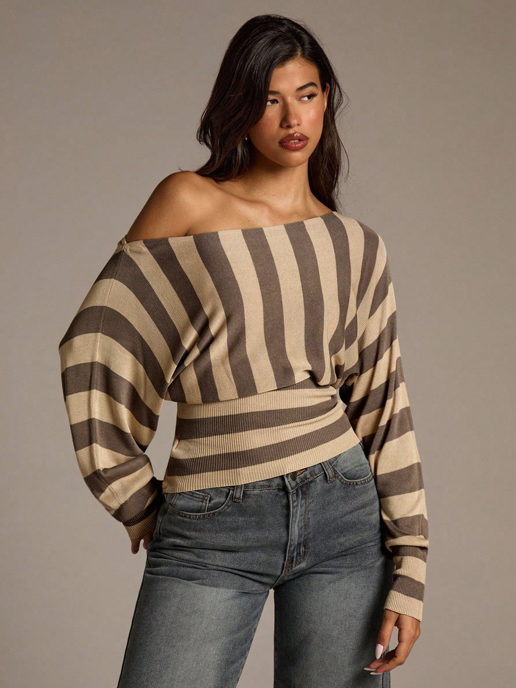 MIU Women's Autumn/Winter New Wide Stripe Yellow And Gray Crew Neck Long Sleeve Sweater,Fall