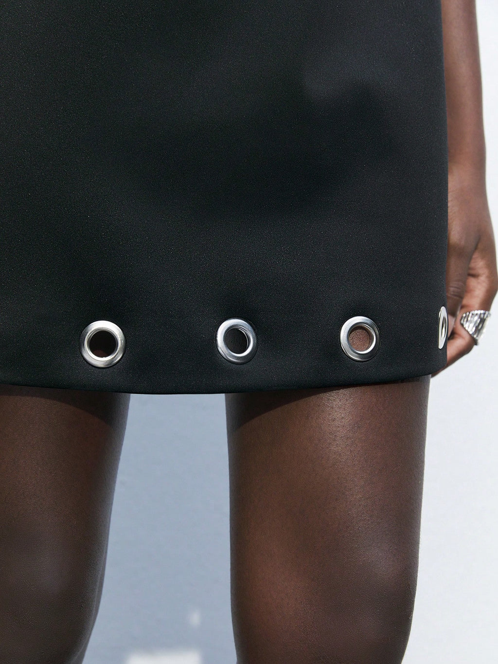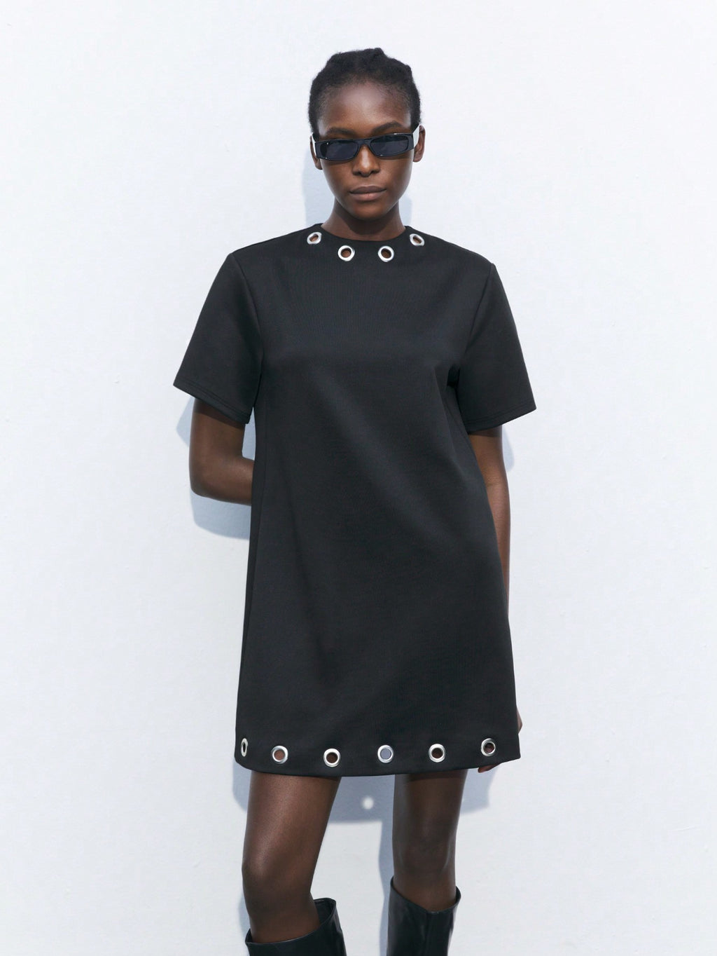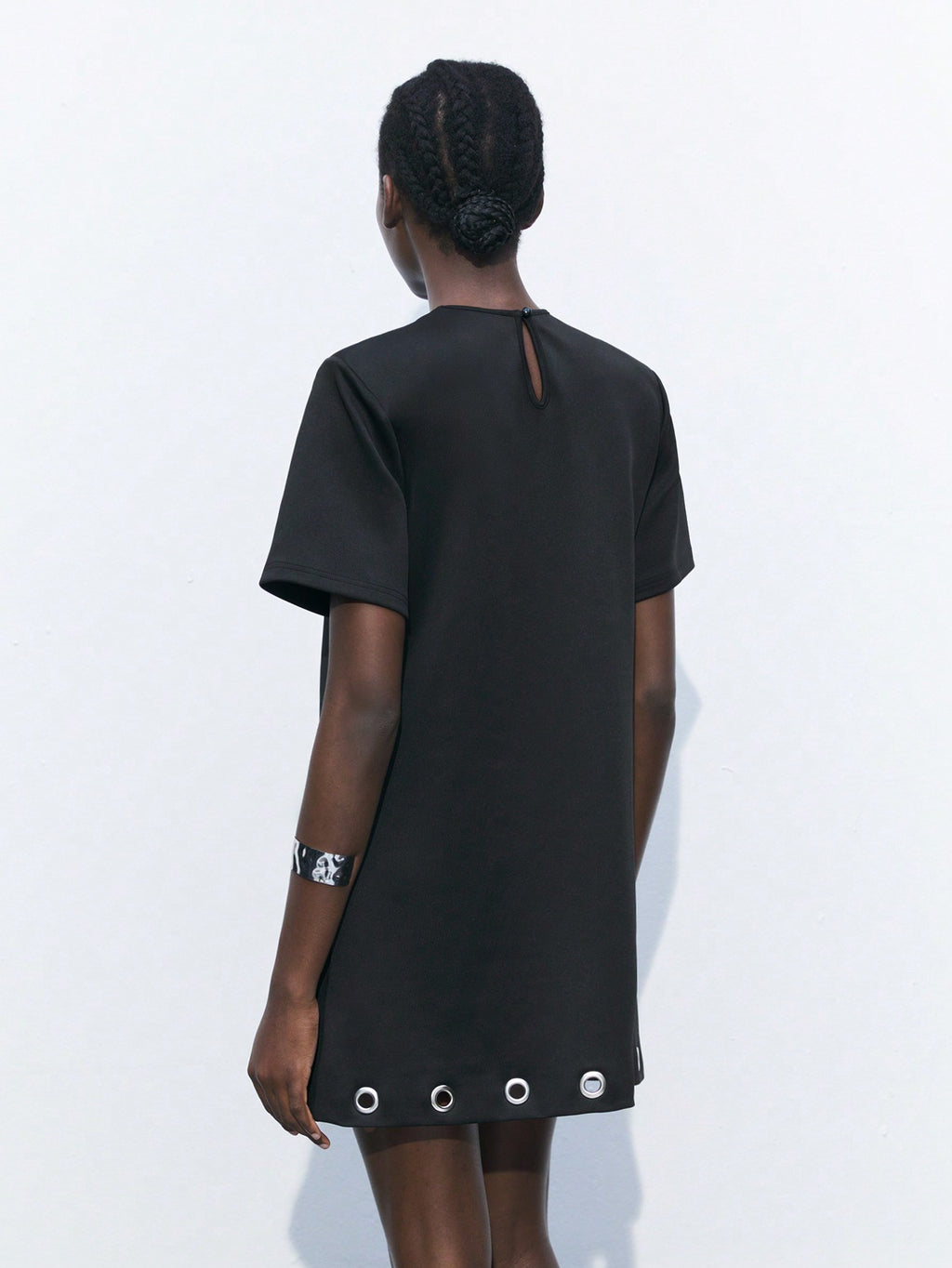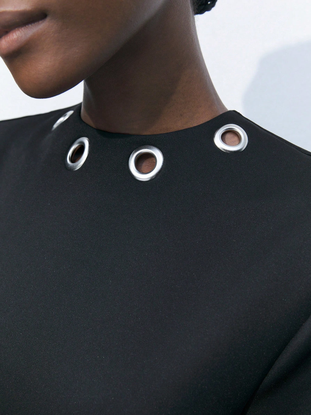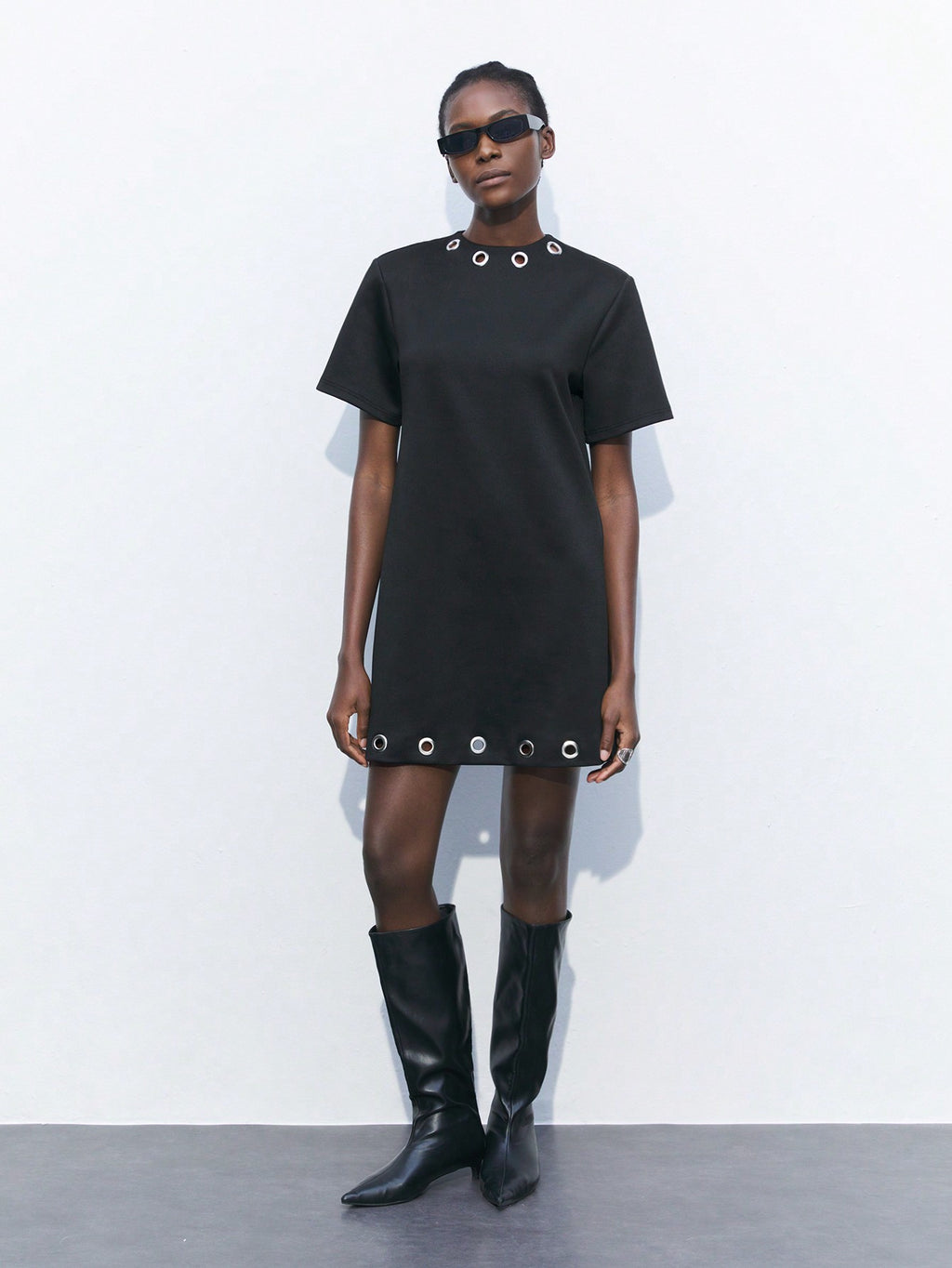 MIU Women's Black Metal Grommet Decor Round Neck Casual Short Sleeve Straight Dress, Metal Hem Decor, Fashion