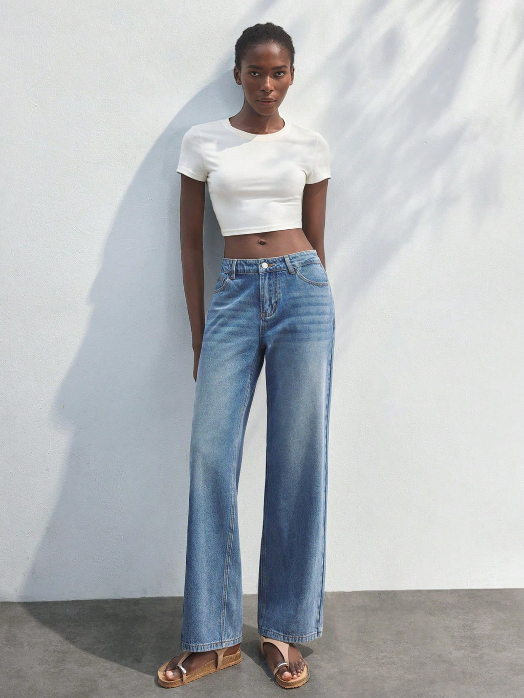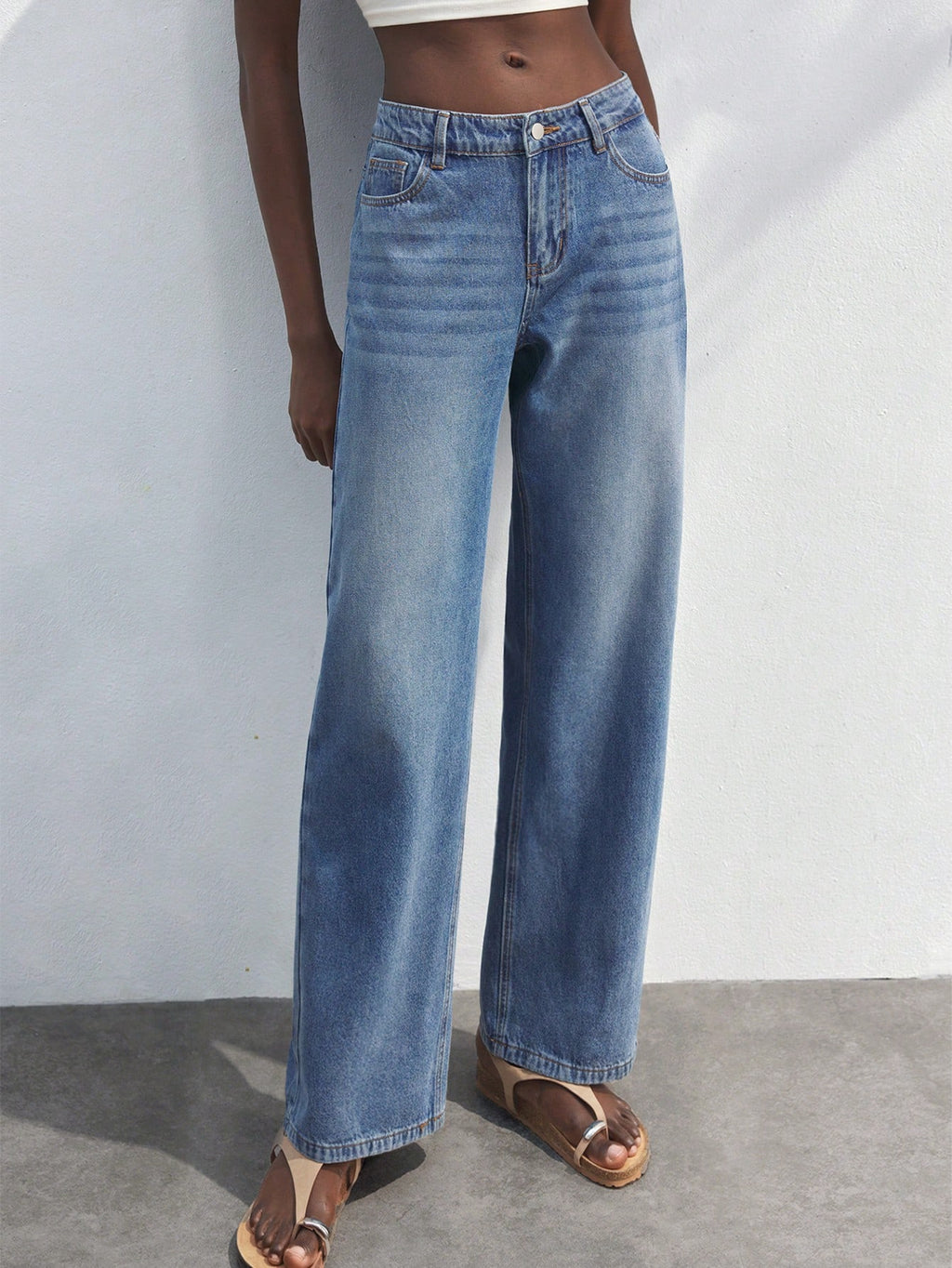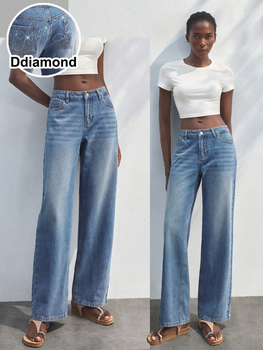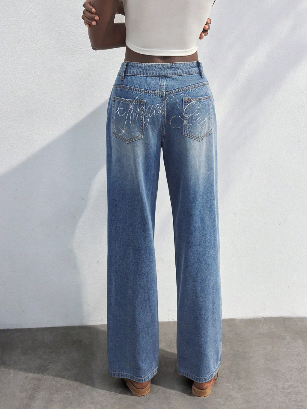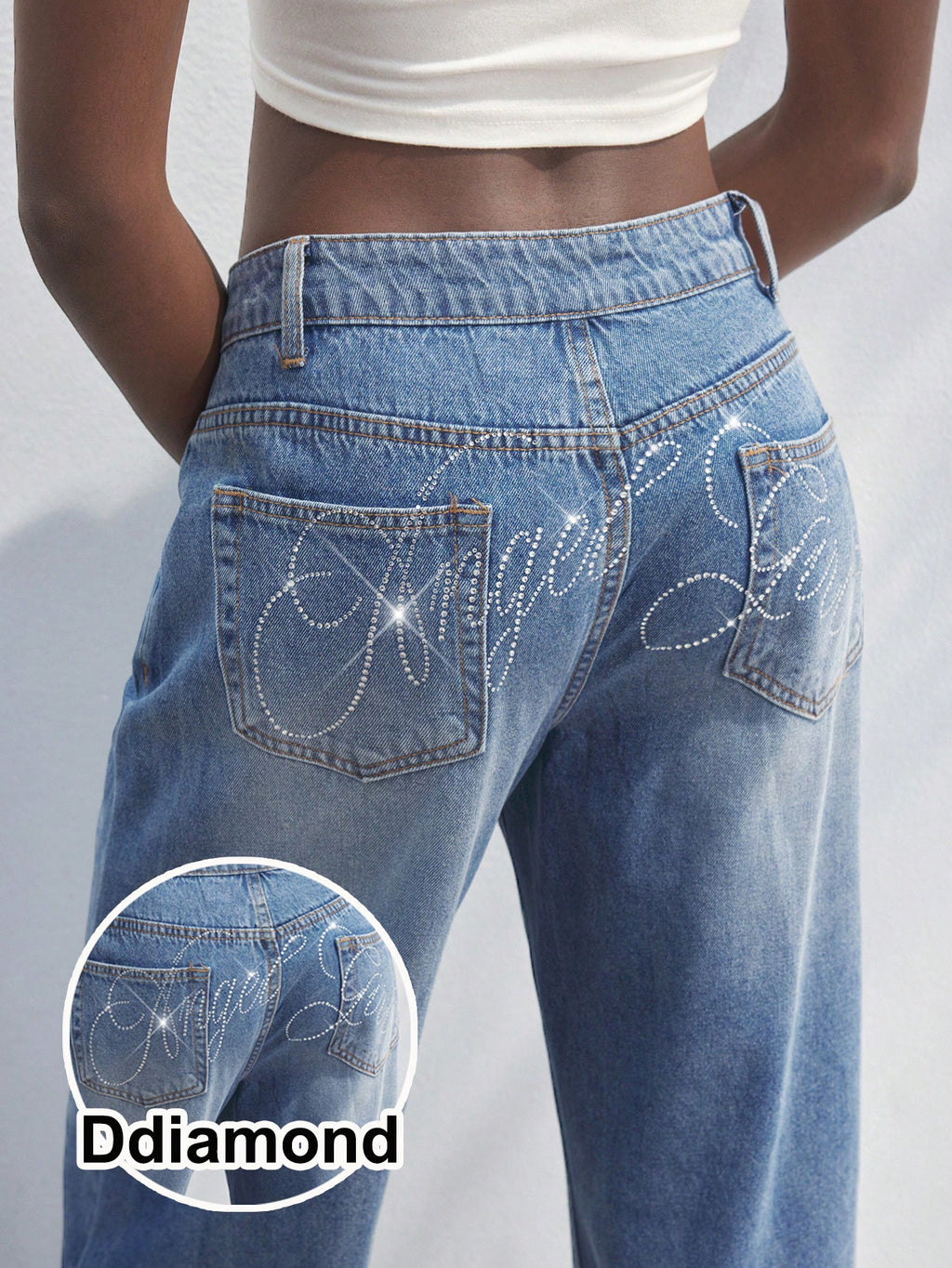 MIU Women's Blue Jeans Blingbling Diamond Low Waist Wide Leg Pants Casual Y2K Wear