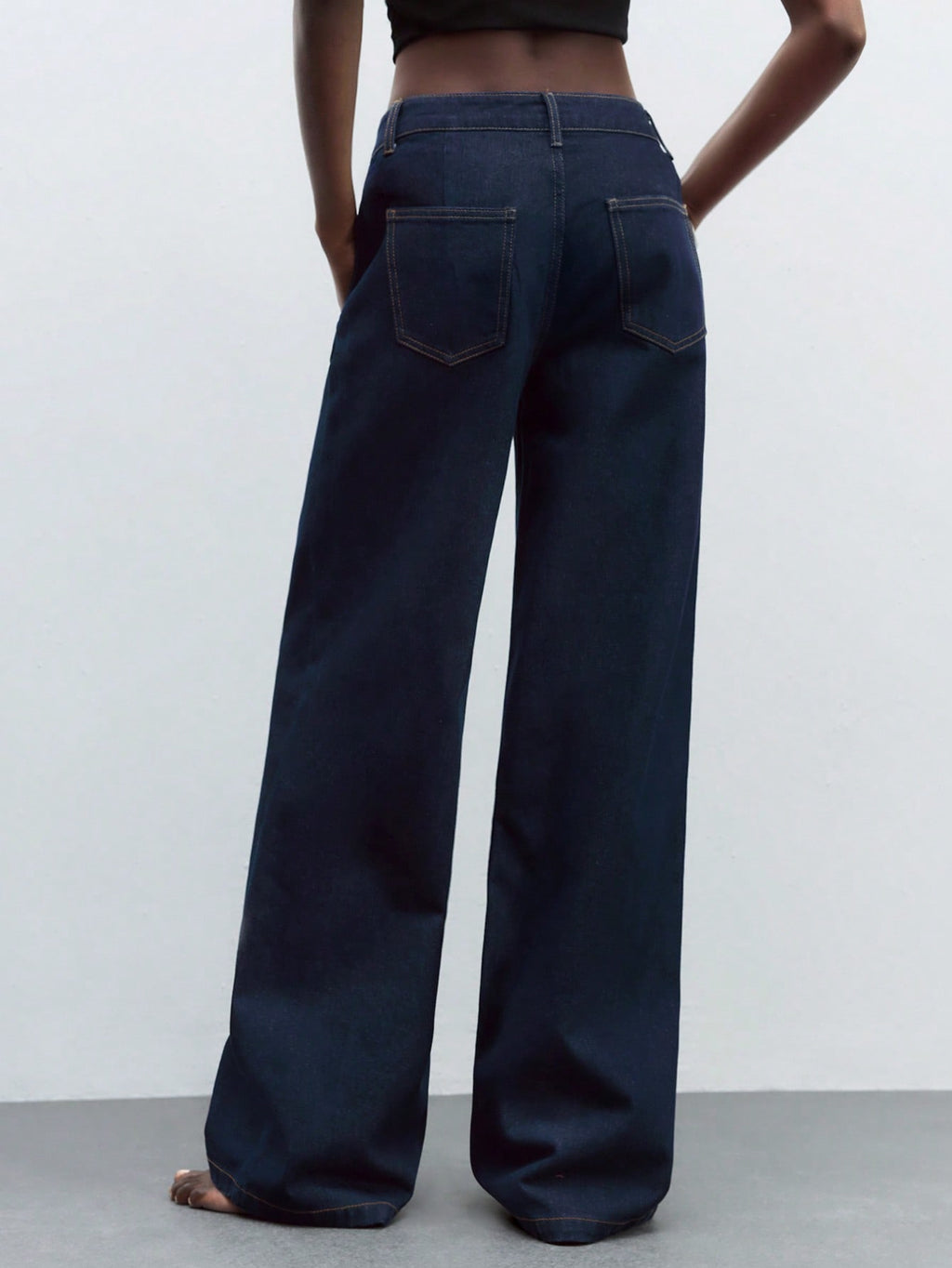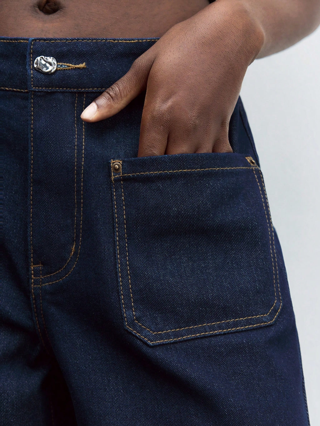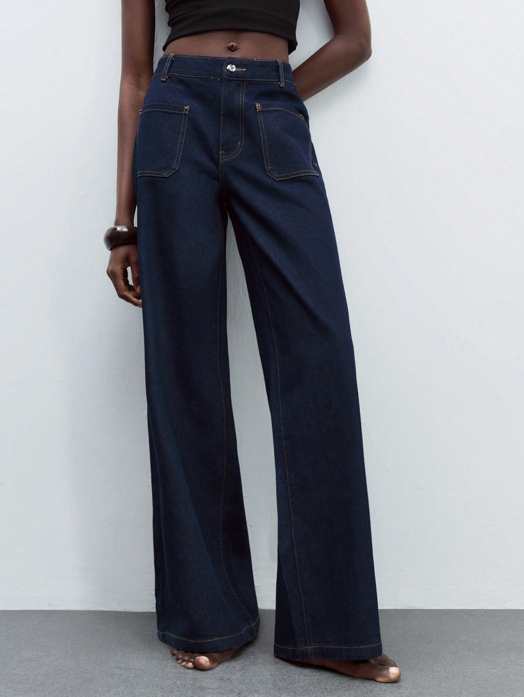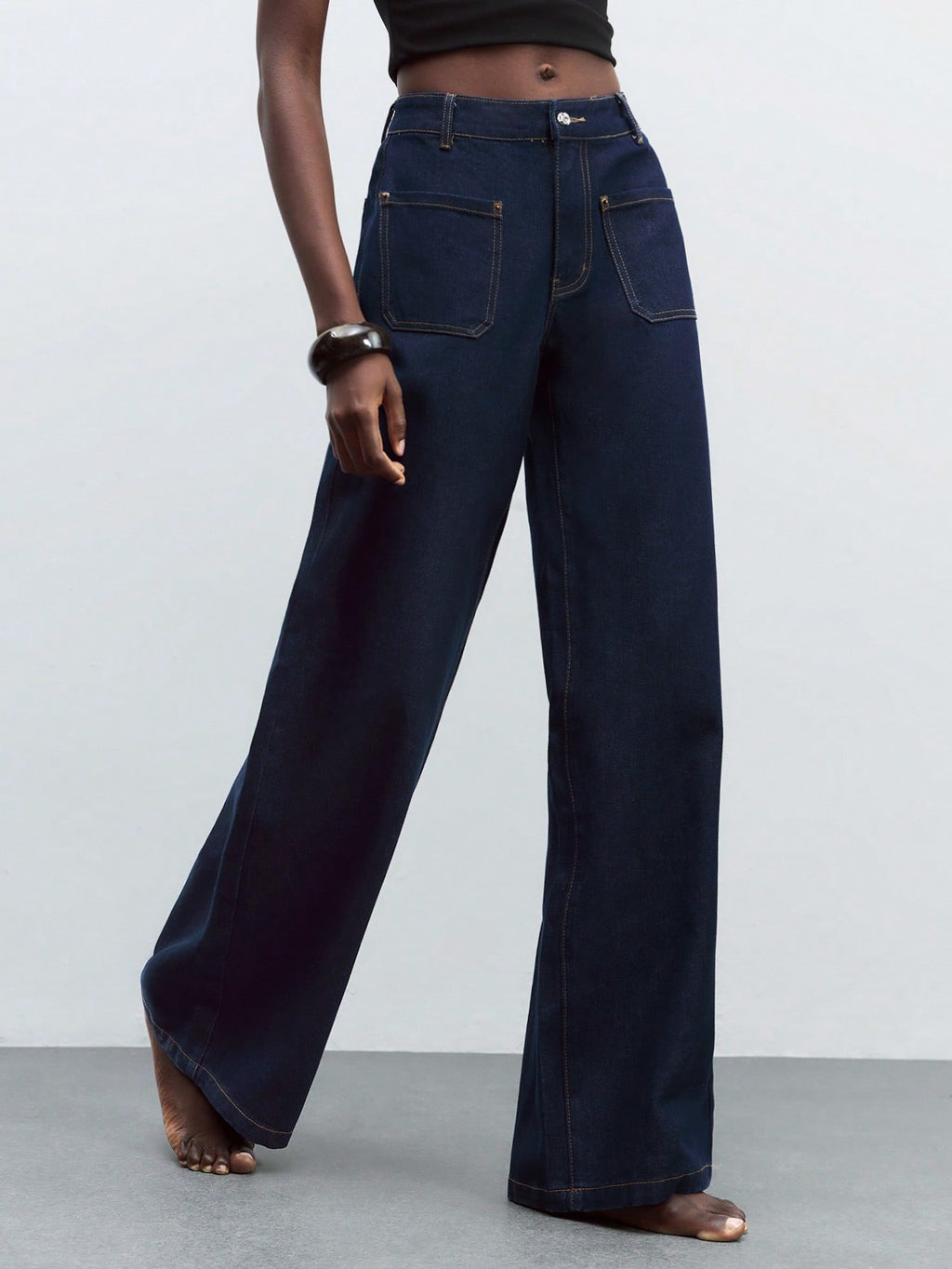 MIU Women's Blue Jeans French Elegant Jeans Retro Double Pocket Straight Slim Trousers Old Money Style Office Wear, Going Out