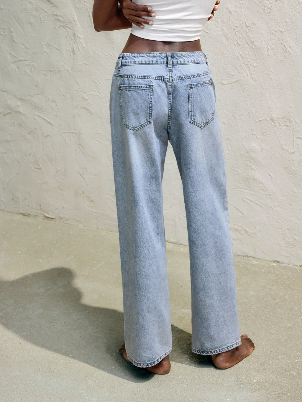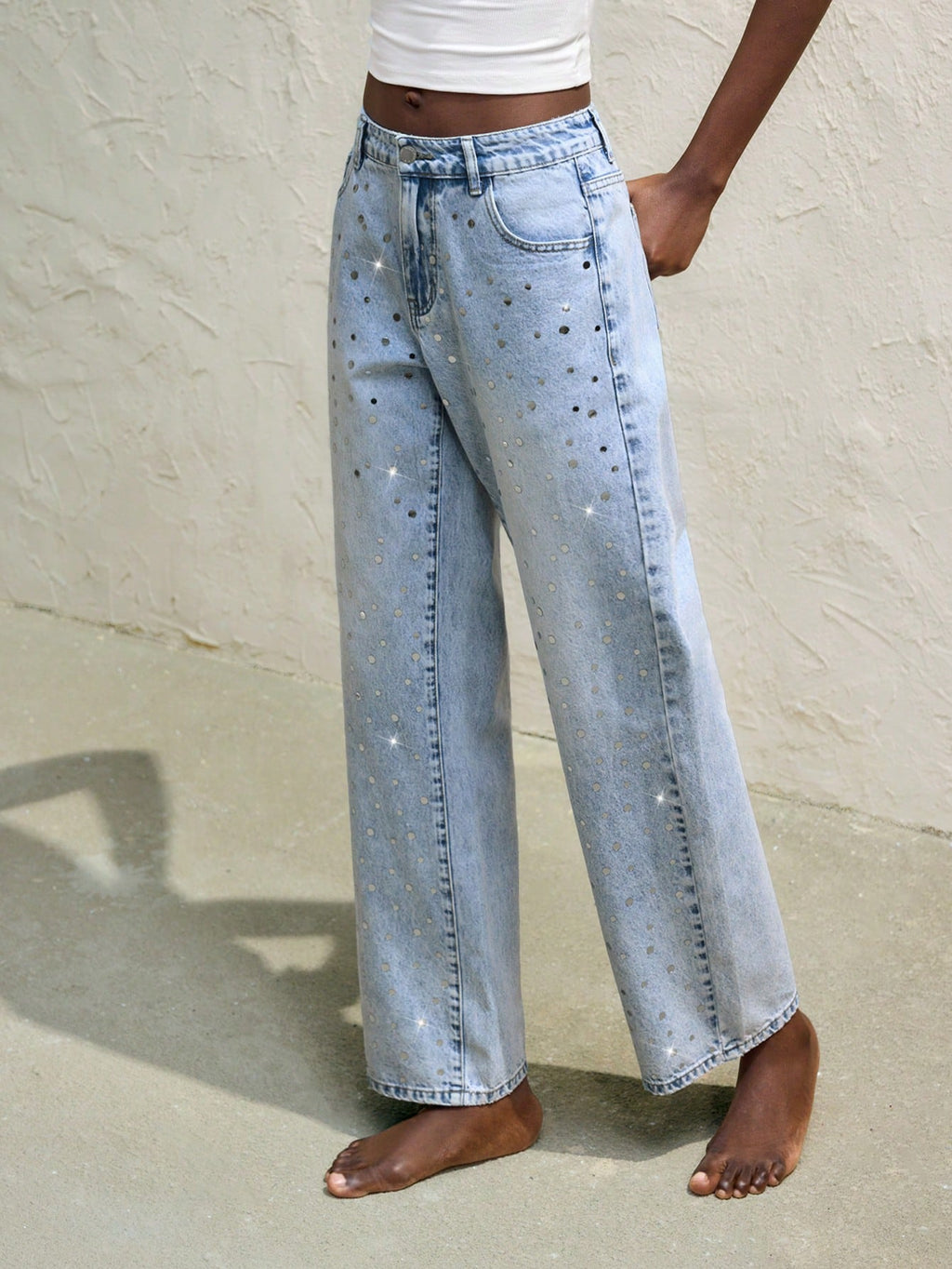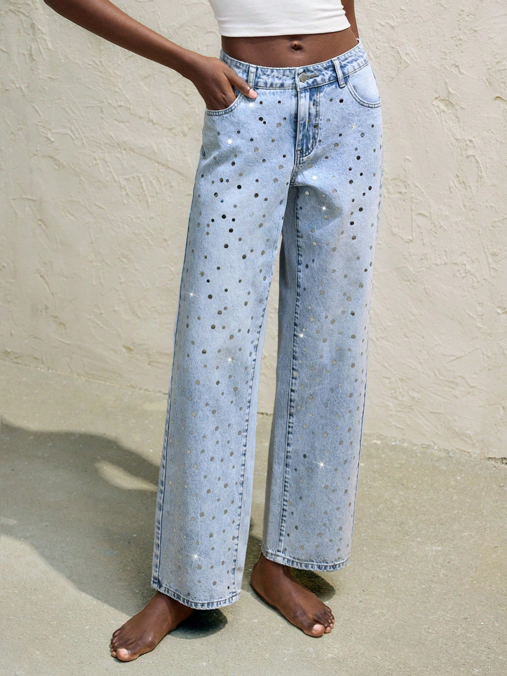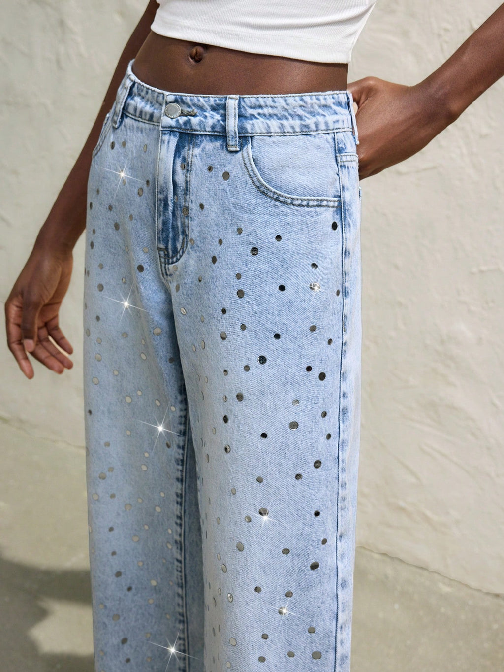 MIU Women's Blue Jeans Low Rise Straight Leg Pants Sparkling Sequins Spring And Summer Jeans