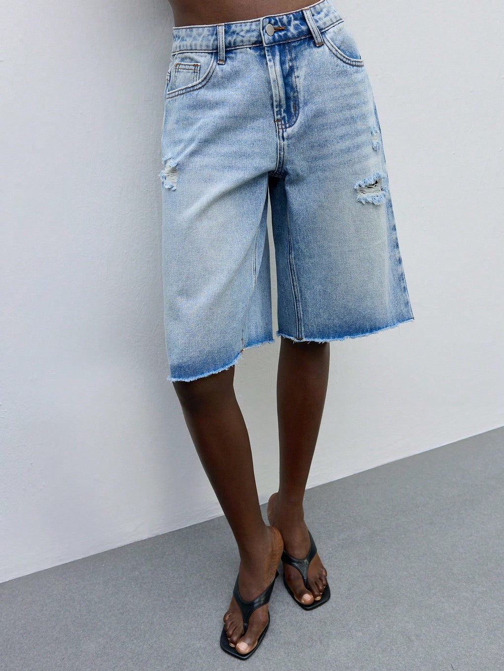 MIU Women's Blue Jeans Low Waist Bermuda Shorts Wide Leg Pants Suitable For Summer Holiday Casual Wear, Going Out