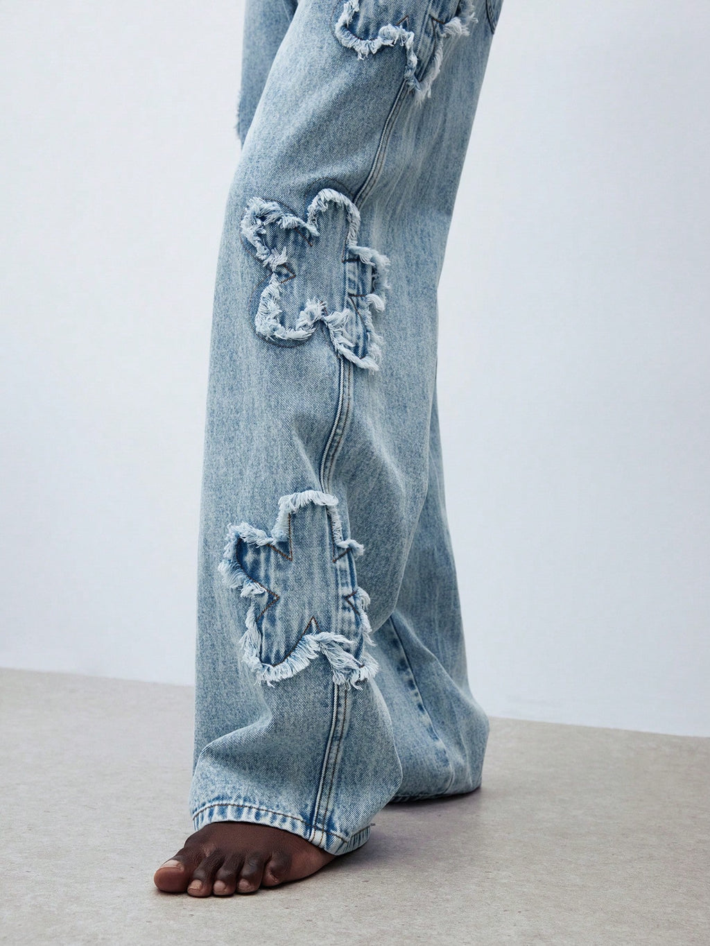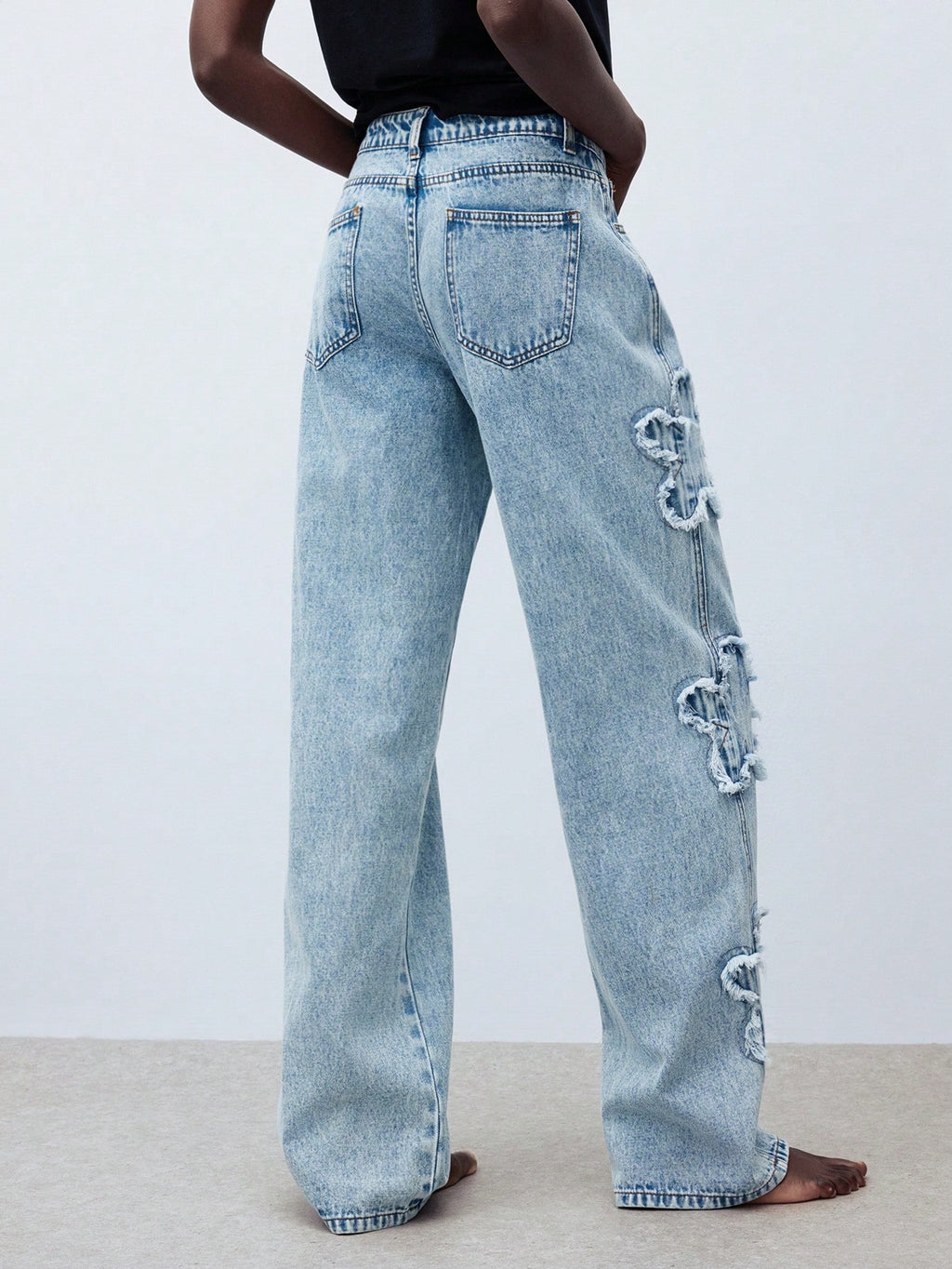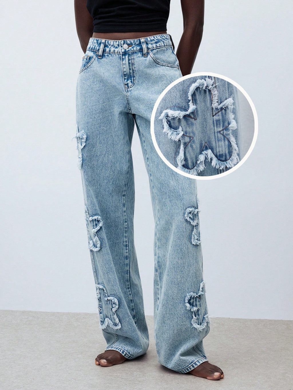 MIU Women's Blue Jeans Low Waist Wide Leg Pants Beautiful Flower Embroidery Straight Pants Summer Casual Wear
