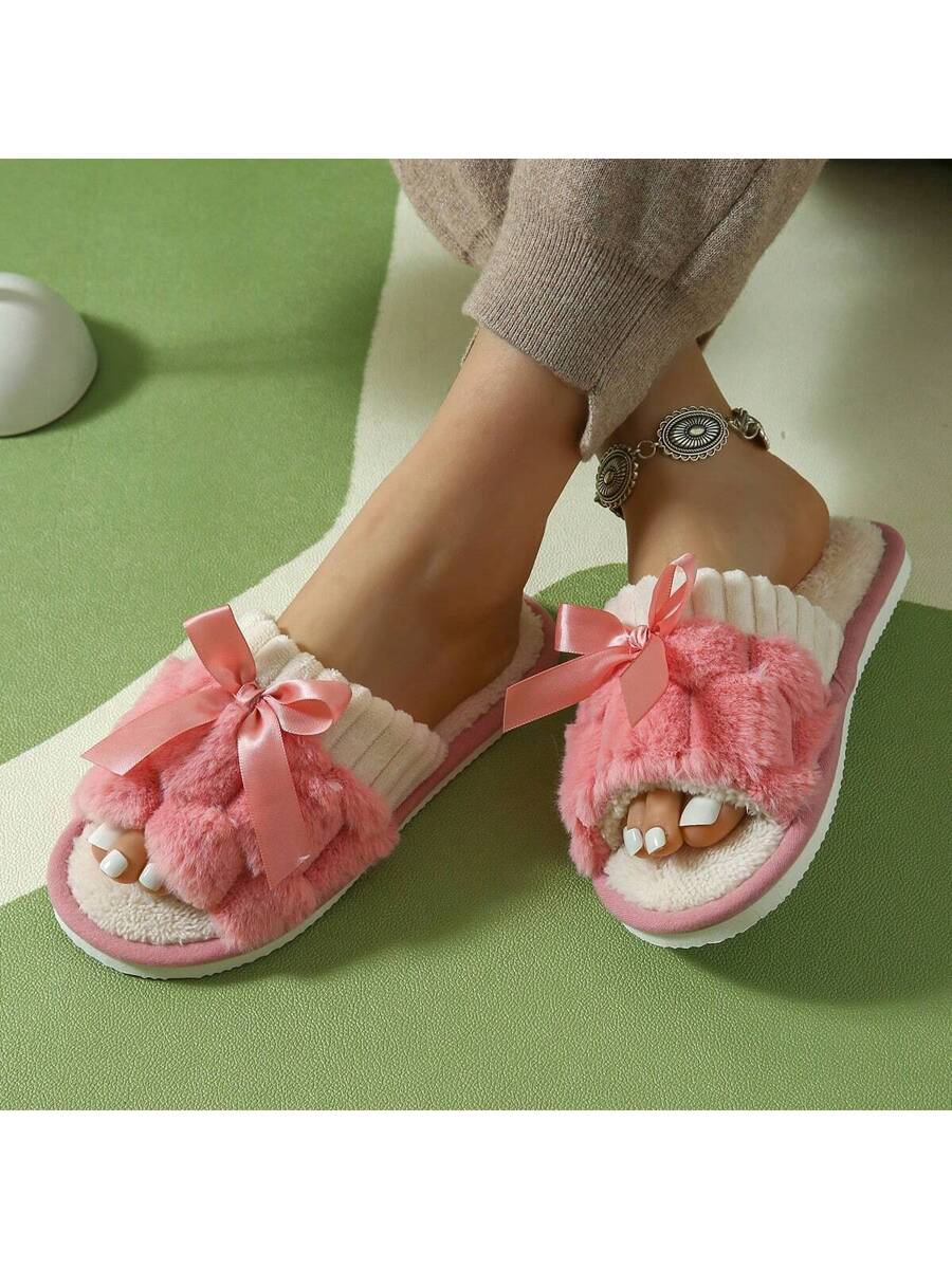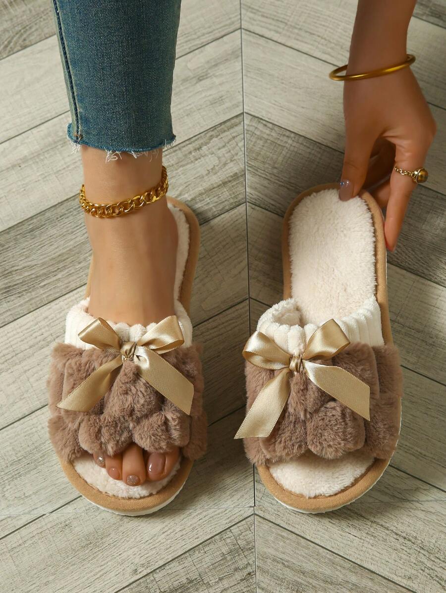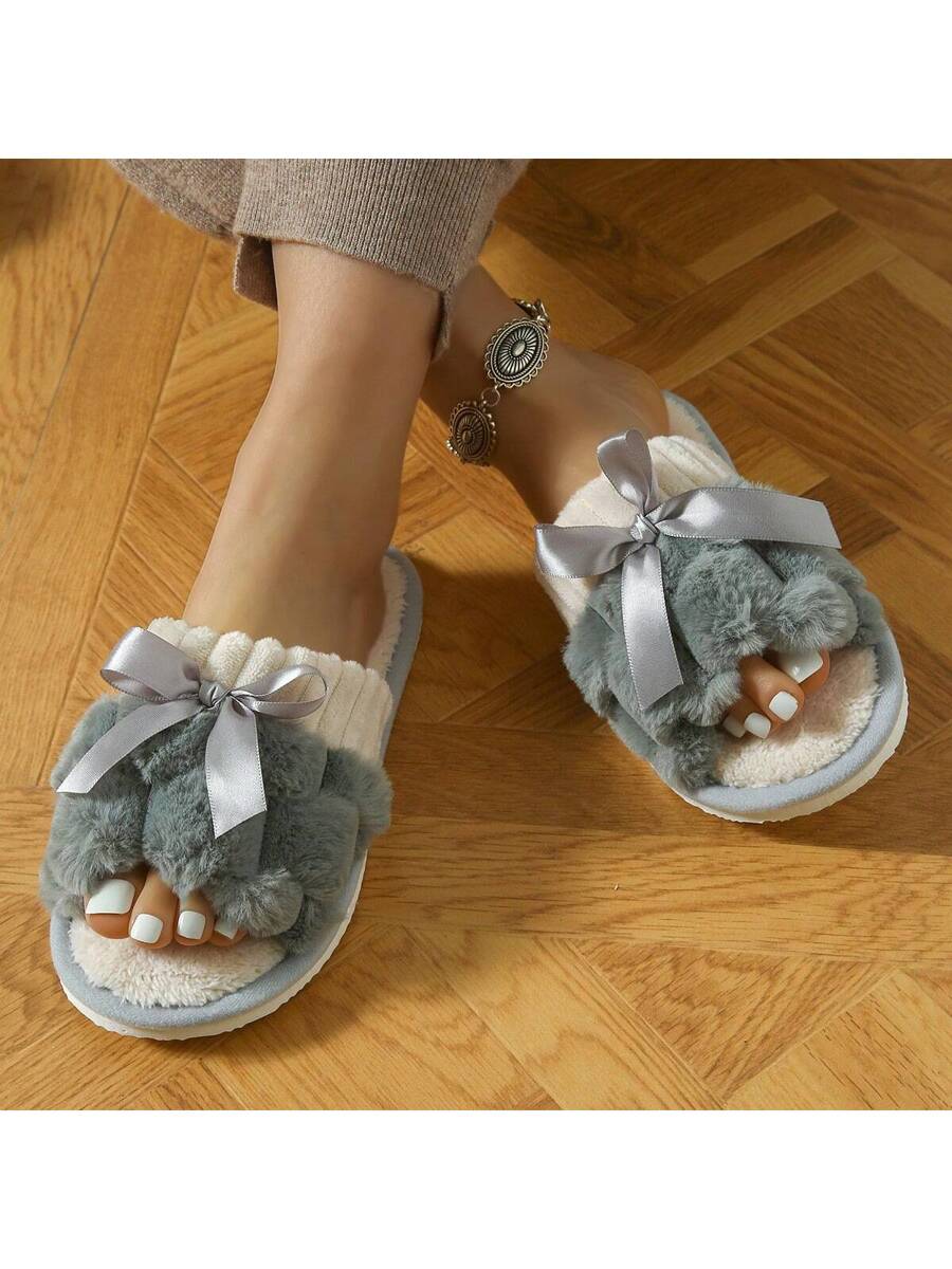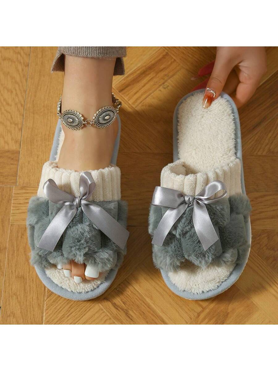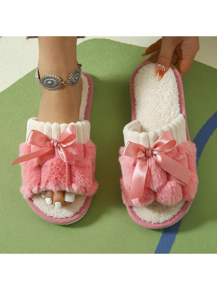 MIU Women's Bunny Fur Bowknot Design Slipper, Comfortable Open Toe, Solid Color House Plush Shoes For Bedroom And Floor Cleaning