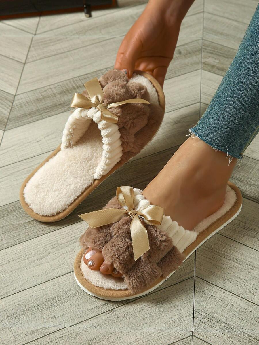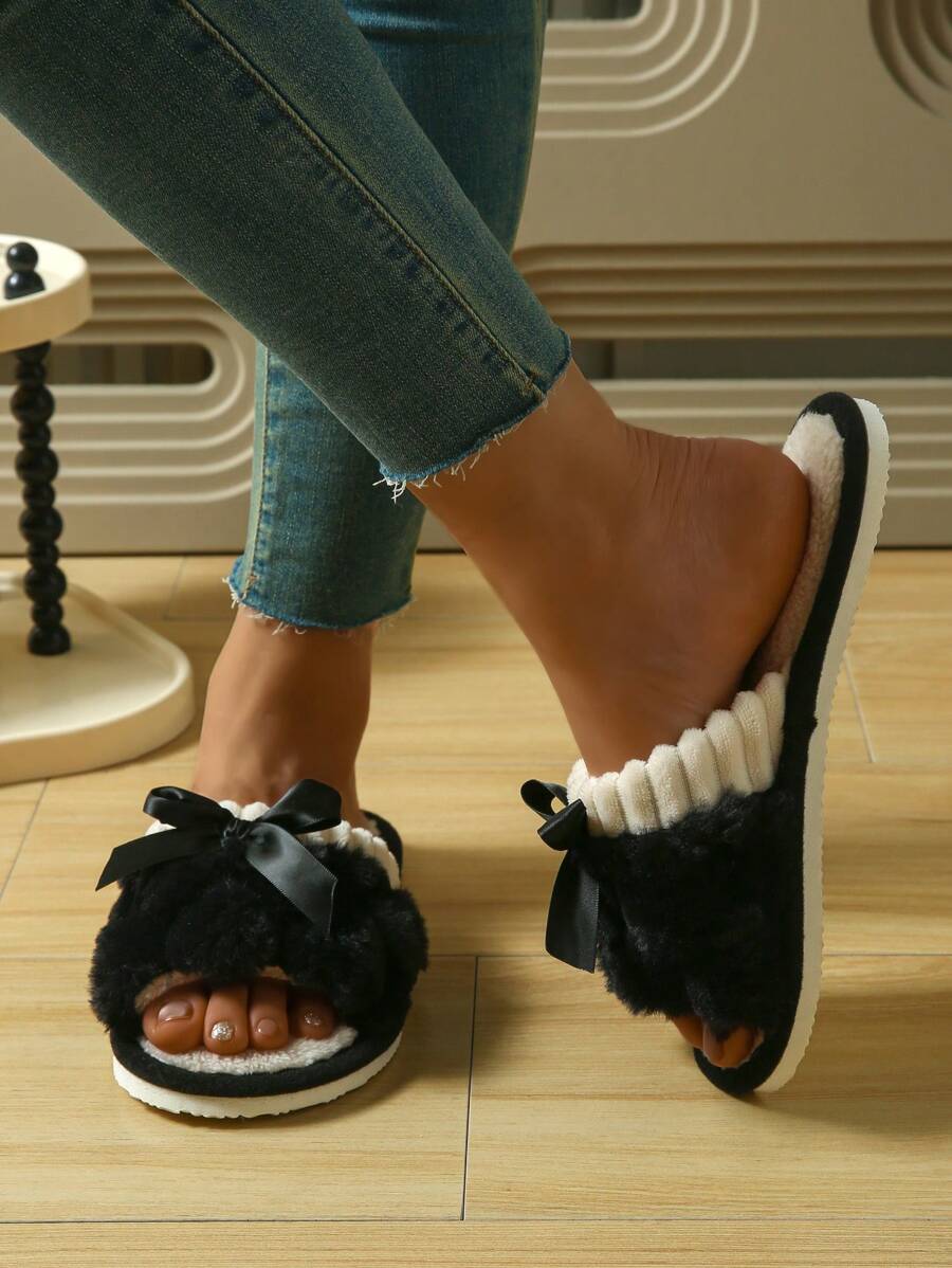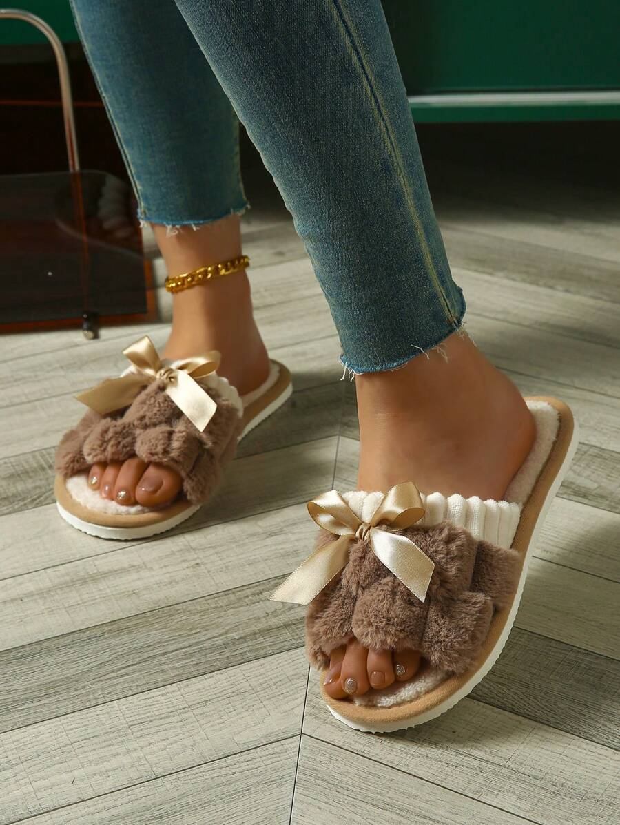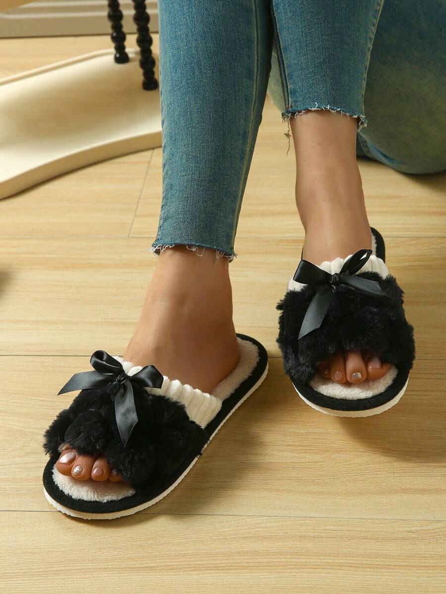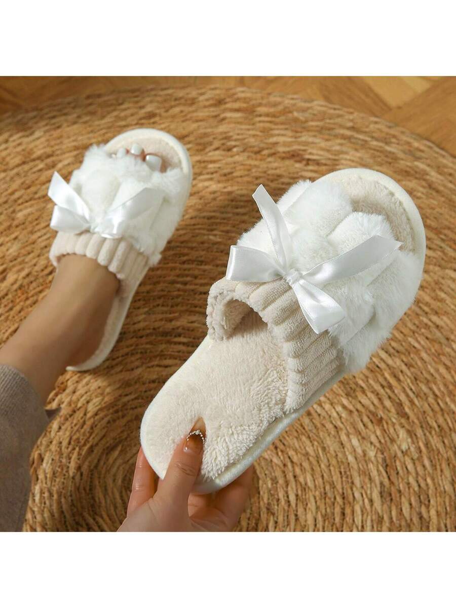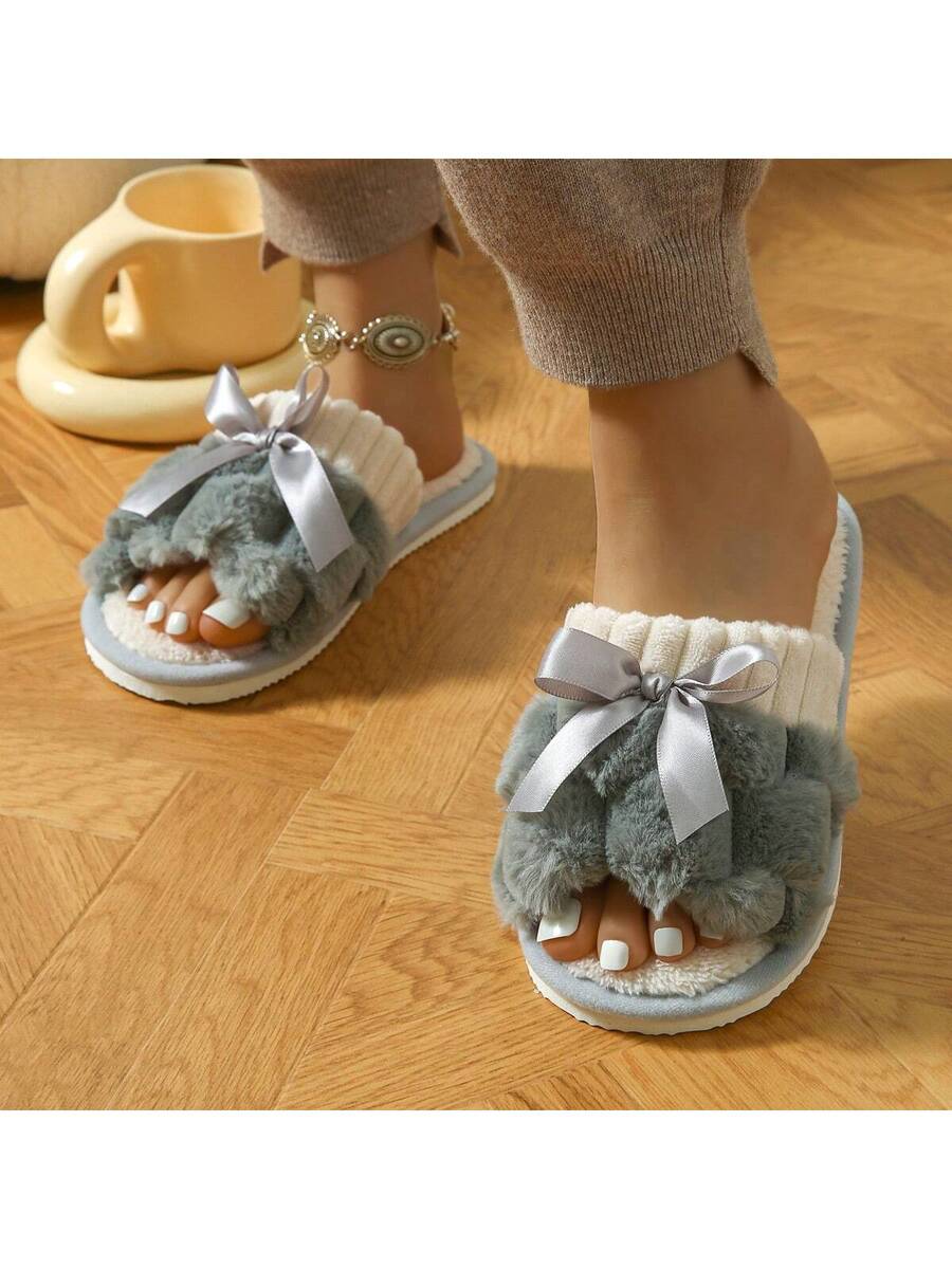 MIU Women's Bunny Fur Bowknot Design Slipper, Comfortable Open Toe, Solid Color House Plush Shoes For Bedroom And Floor Cleaning
