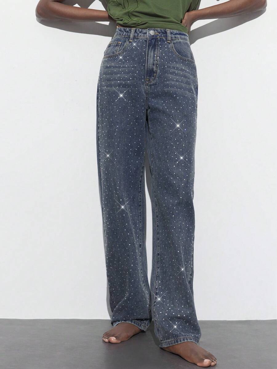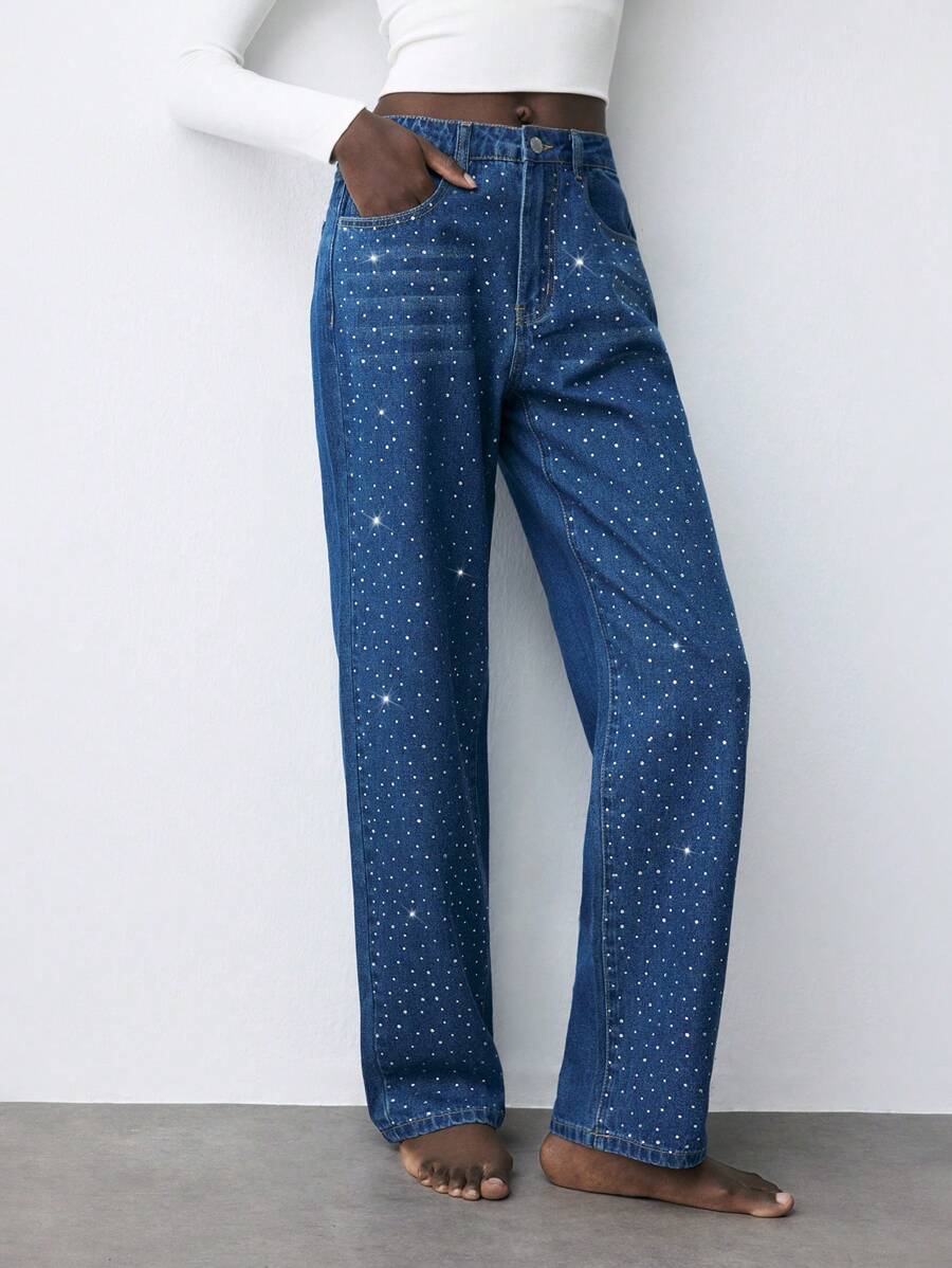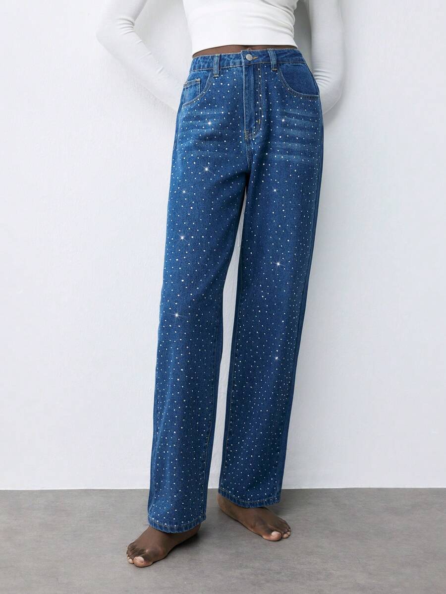 MIU Women's Casual Rhinestone Embellished Slim Straight Leg Jeans, Blue
