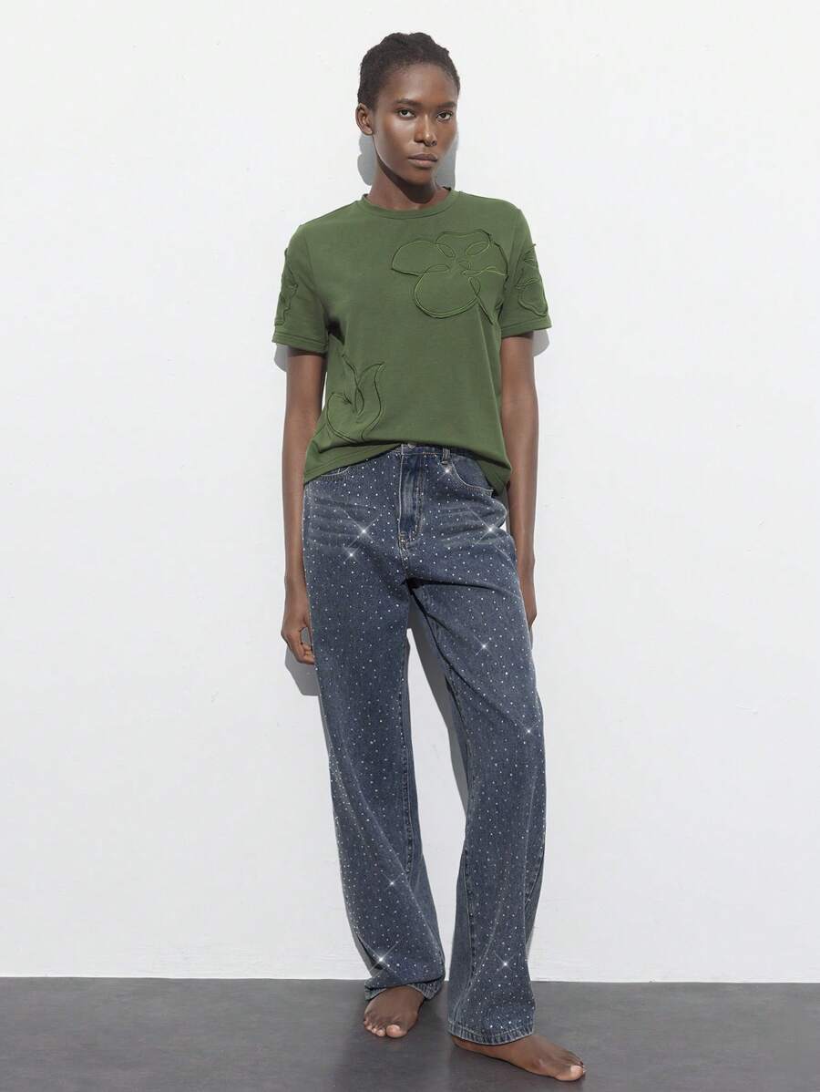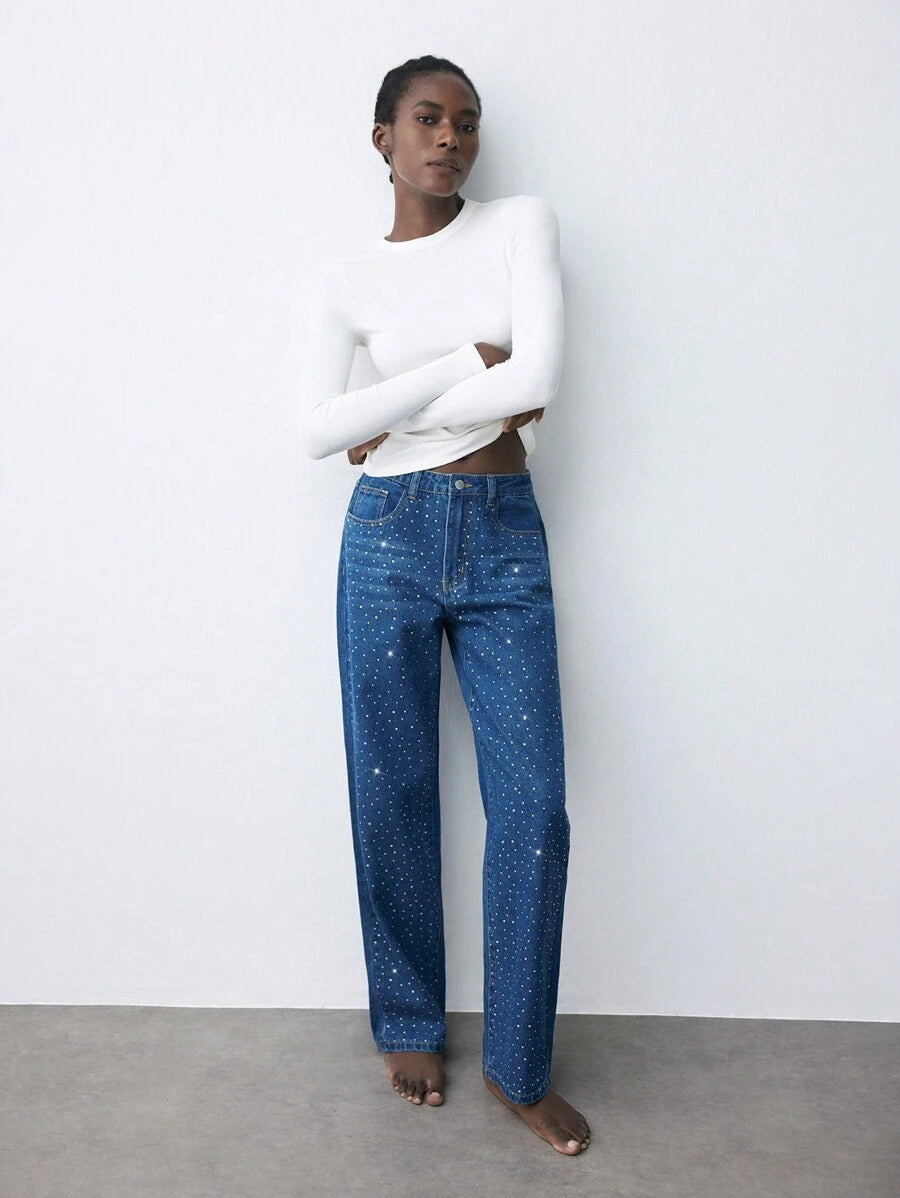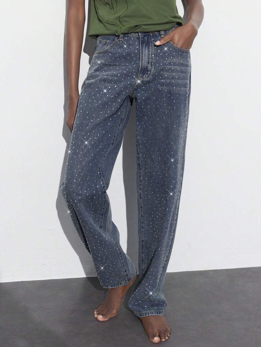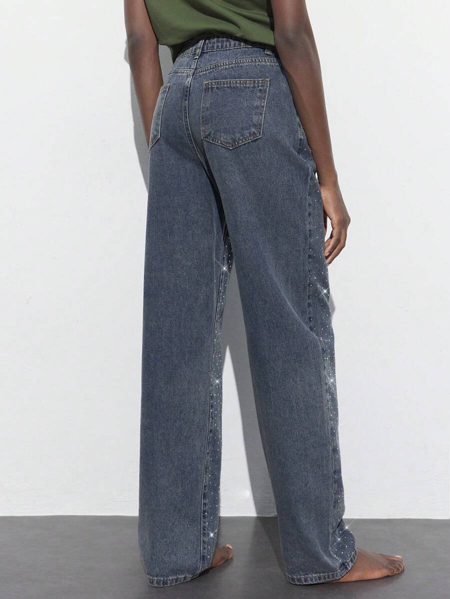 MIU Women's Casual Rhinestone Embellished Slim Straight Leg Jeans, Blue