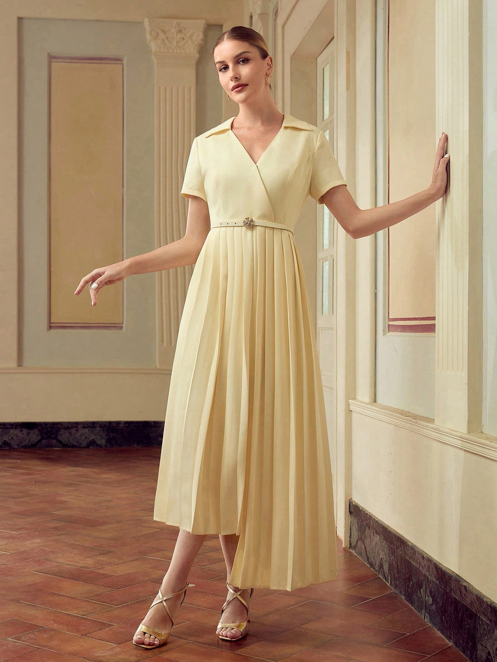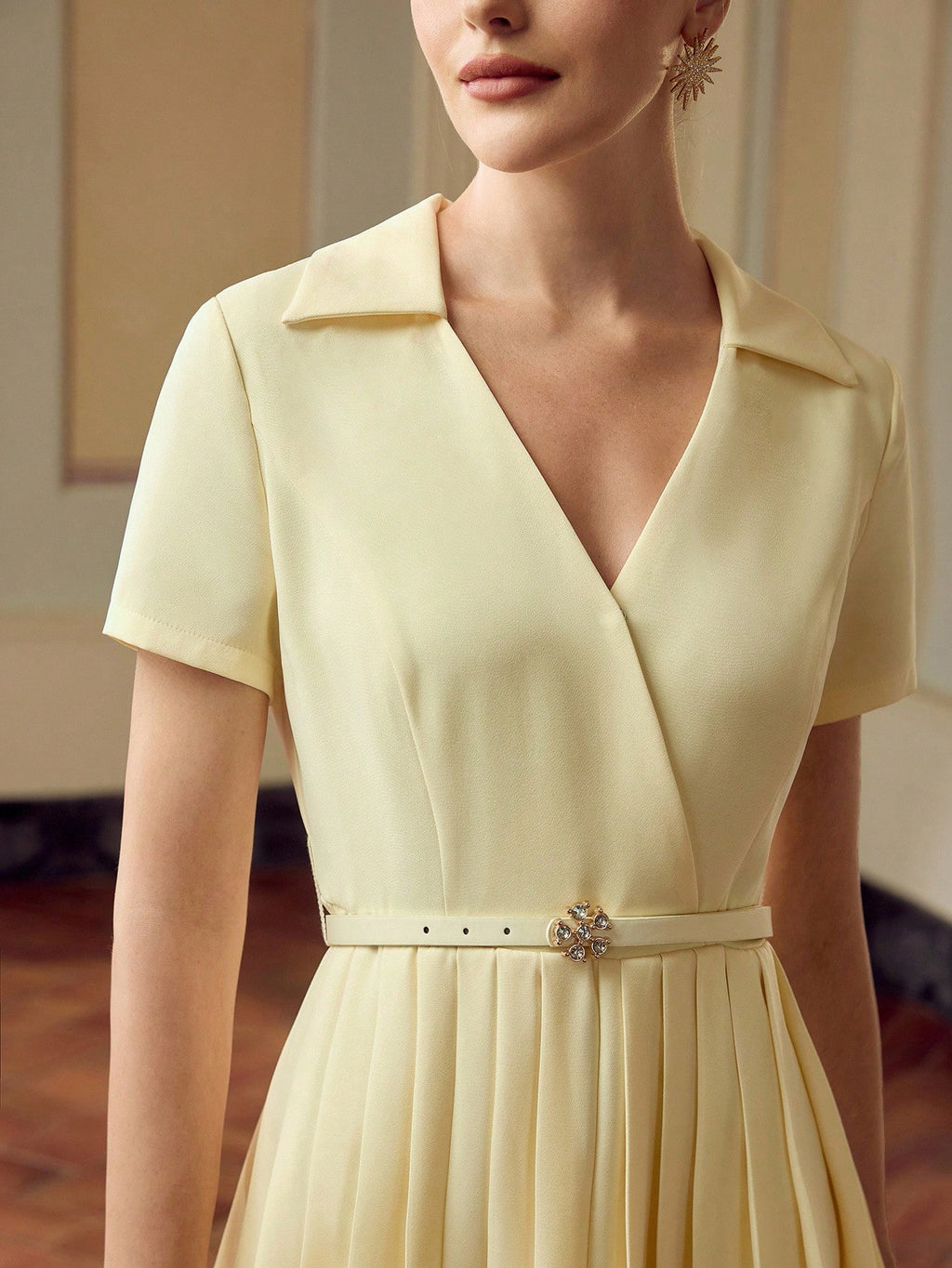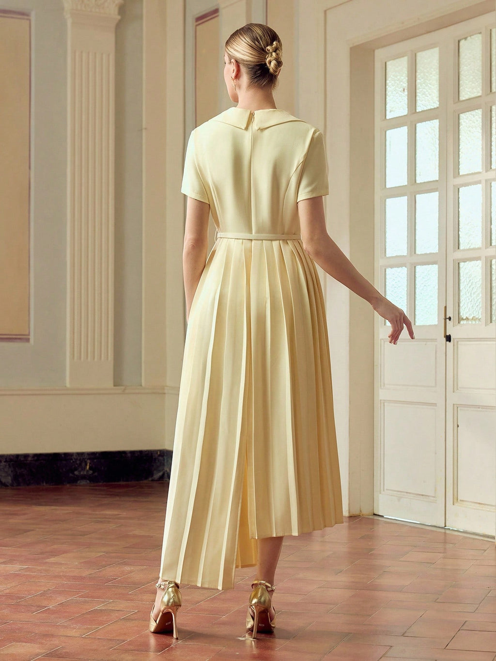 MIU Women's Collared Short Sleeve Asymmetric Pleated Hem Elegant Dress