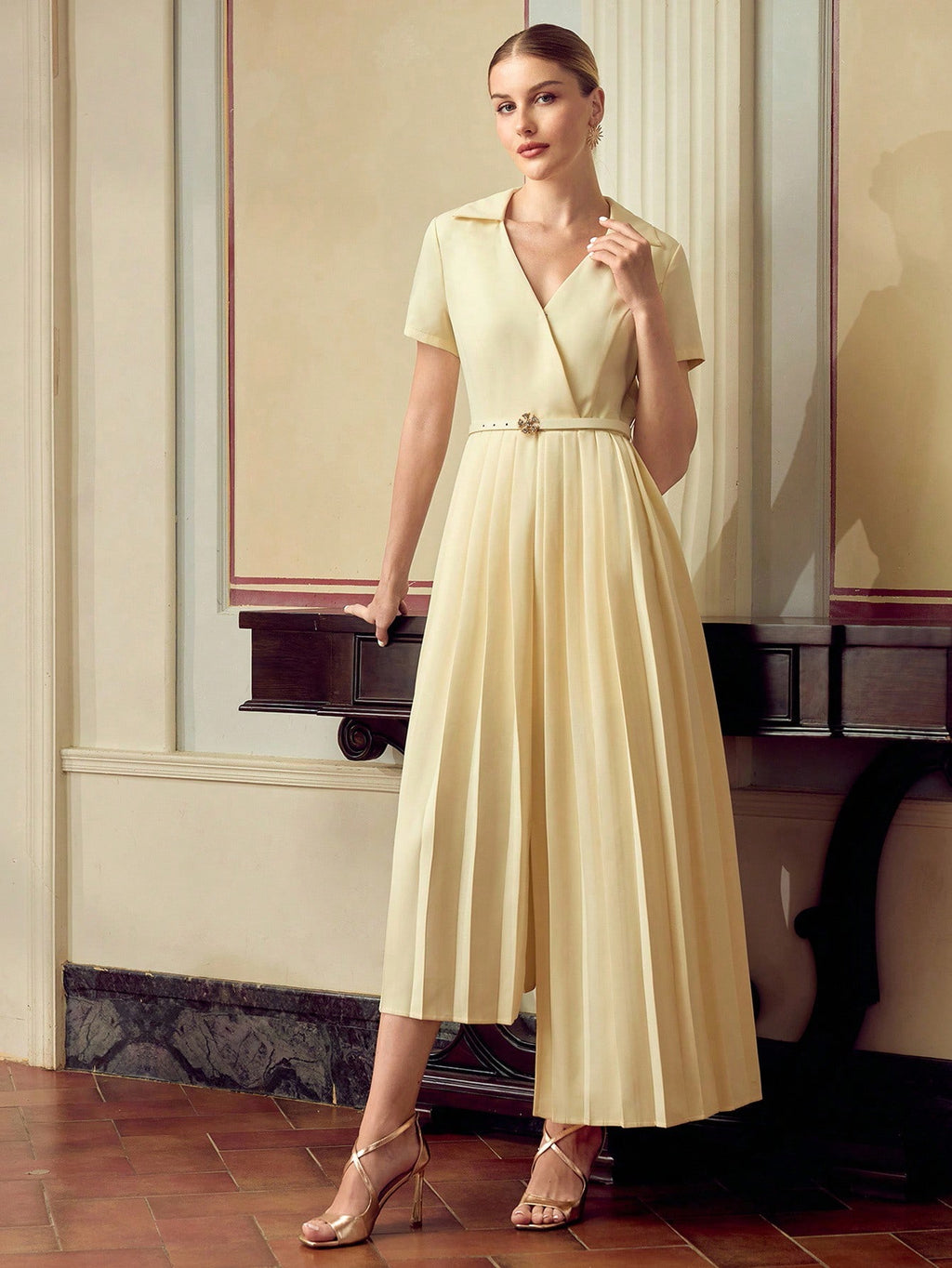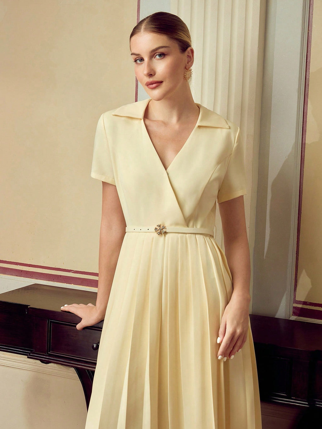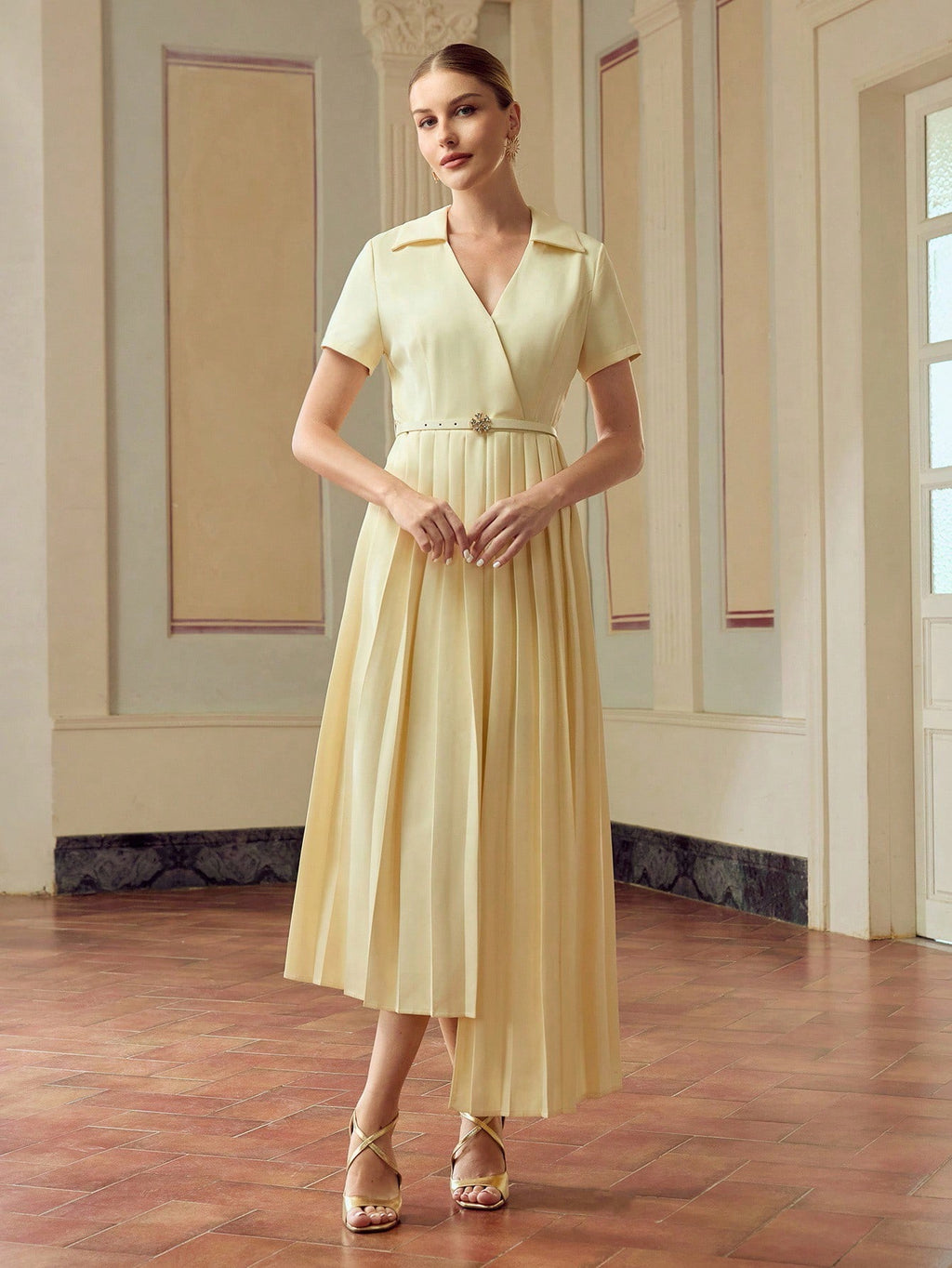 MIU Women's Collared Short Sleeve Asymmetric Pleated Hem Elegant Dress