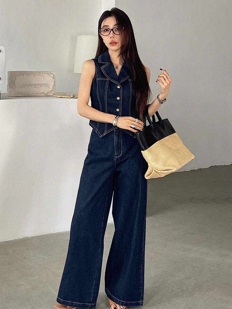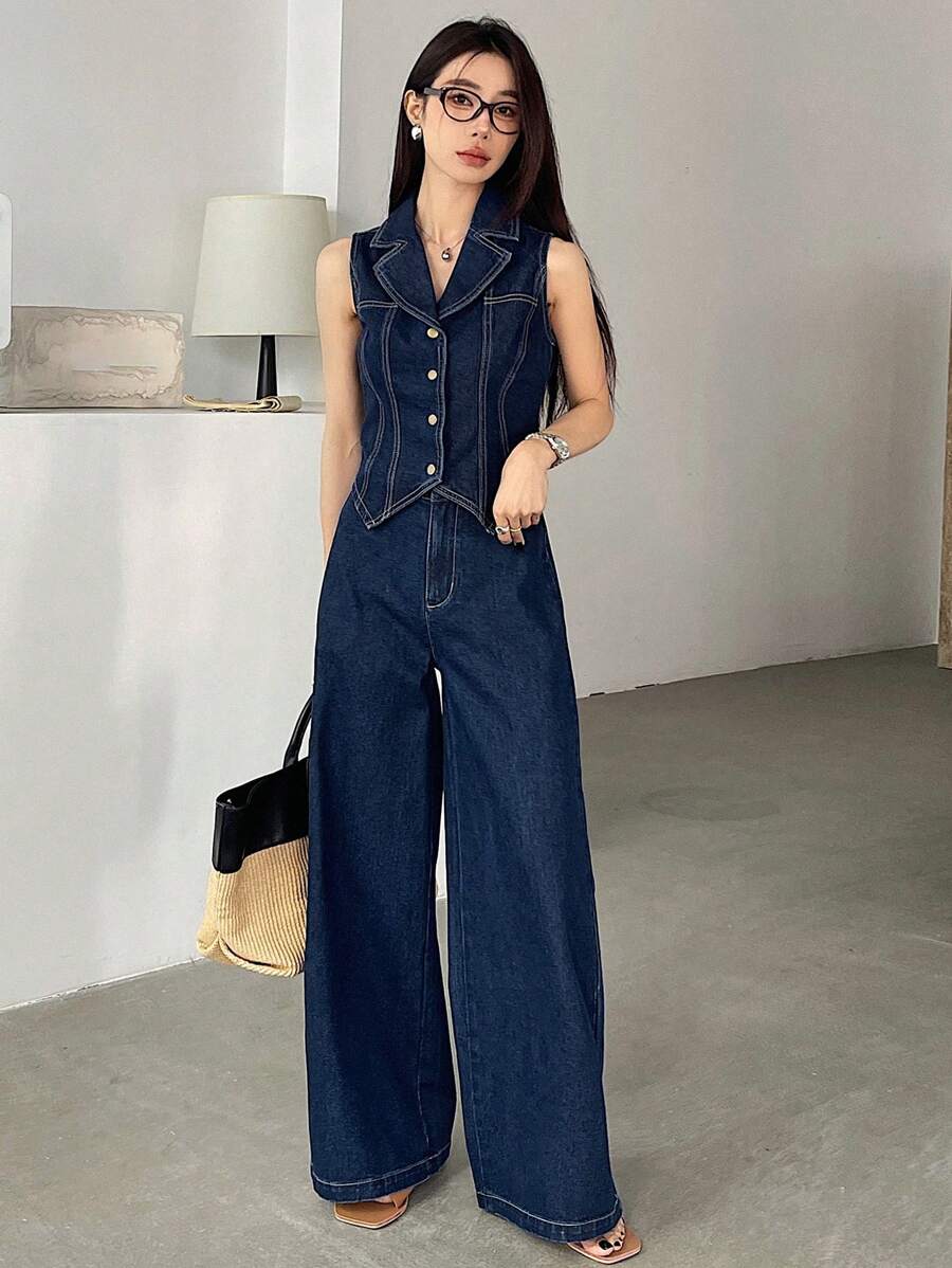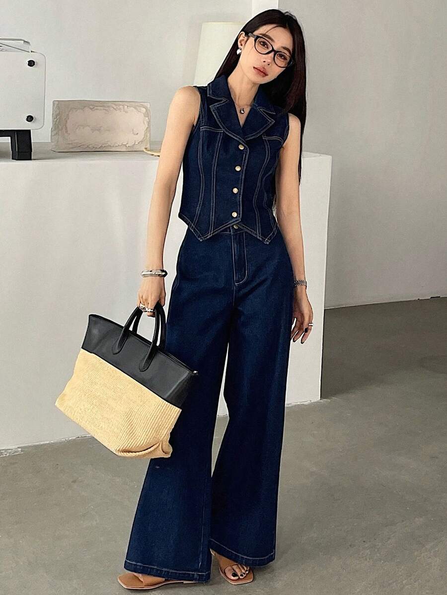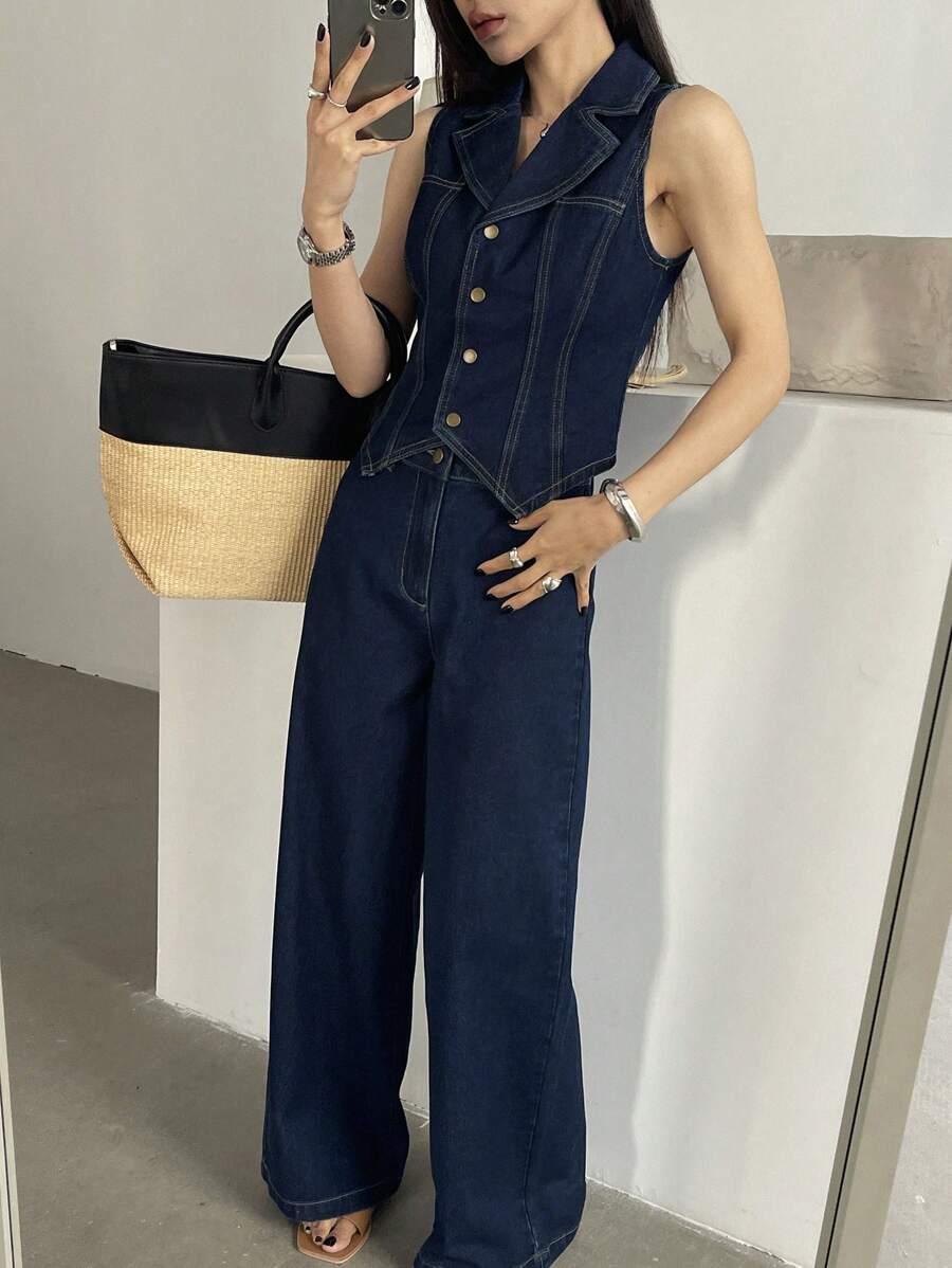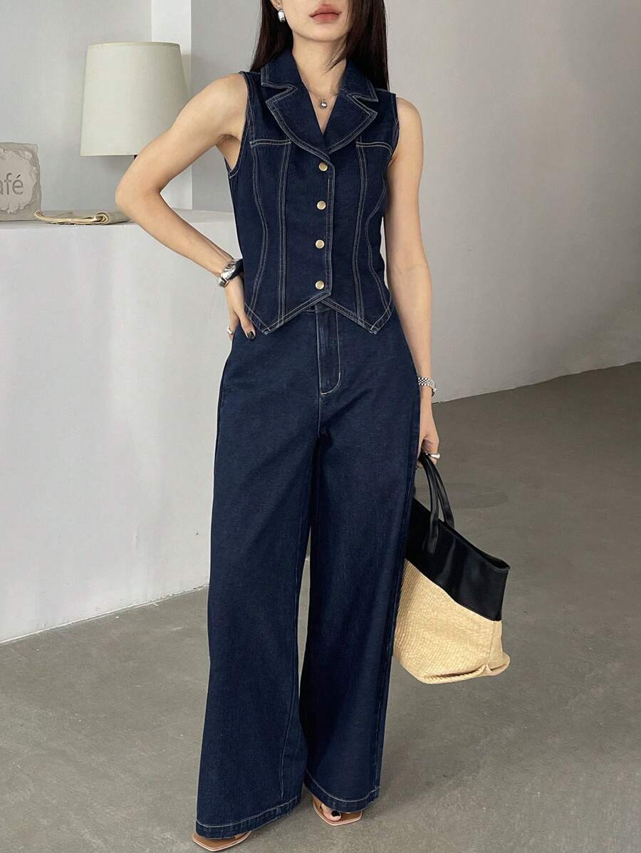 MIU Women's Contrast Piping Blazer Vest And Wide-Leg Jeans 2-Piece Suit Set