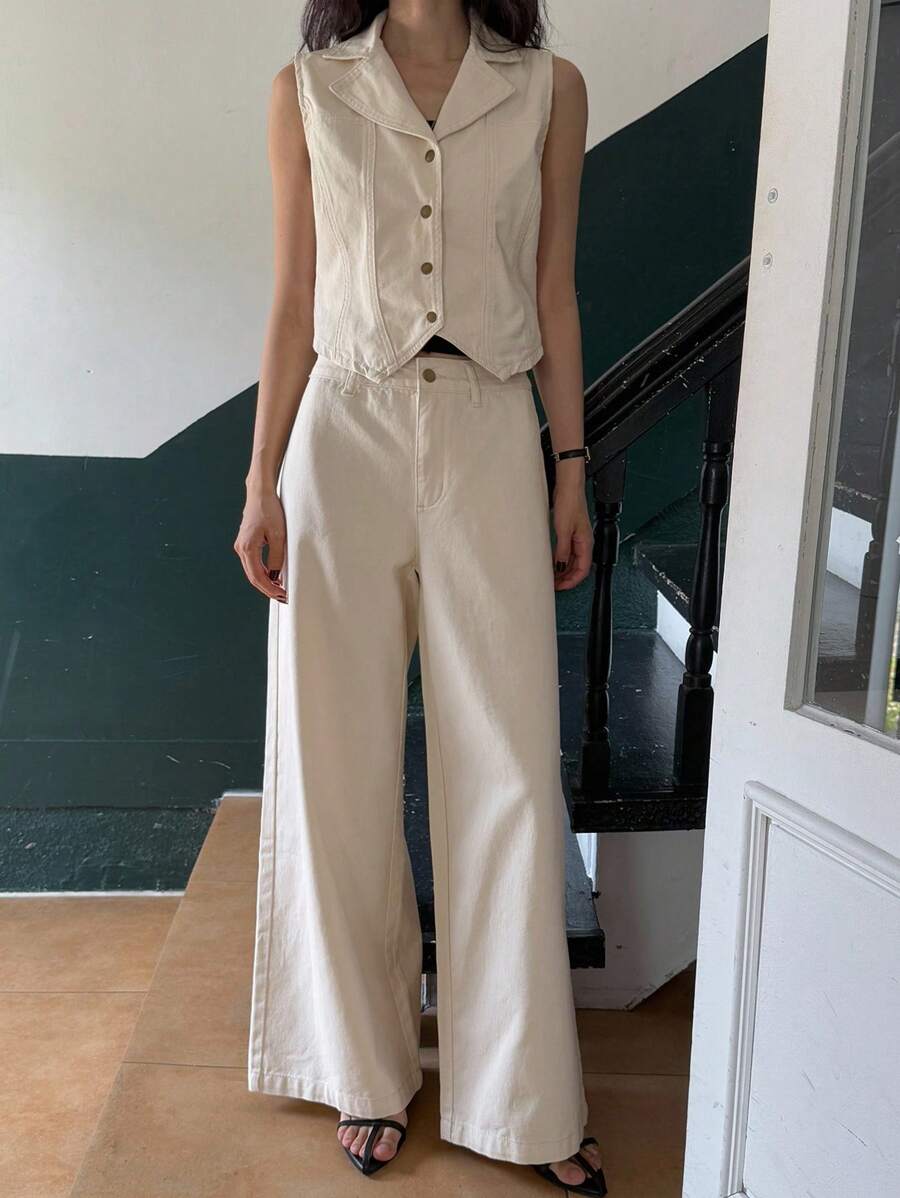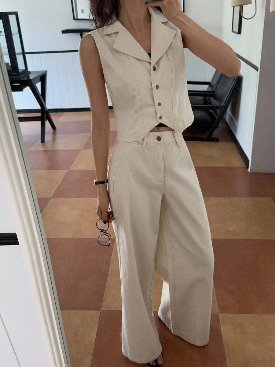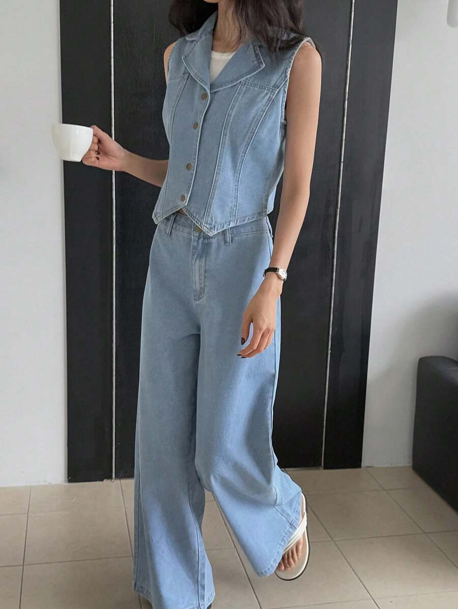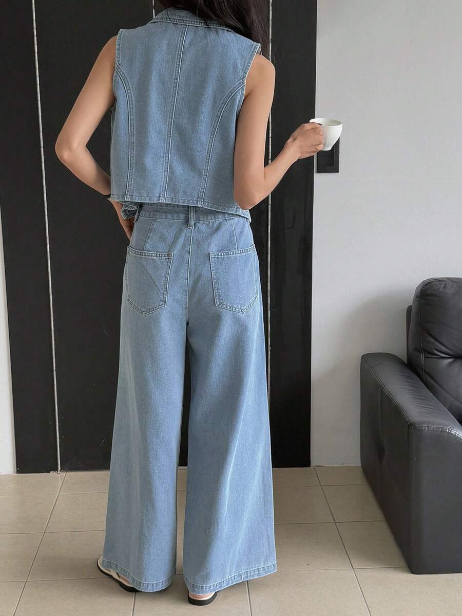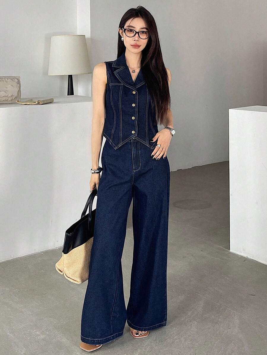 MIU Women's Contrast Piping Blazer Vest And Wide-Leg Jeans 2-Piece Suit Set