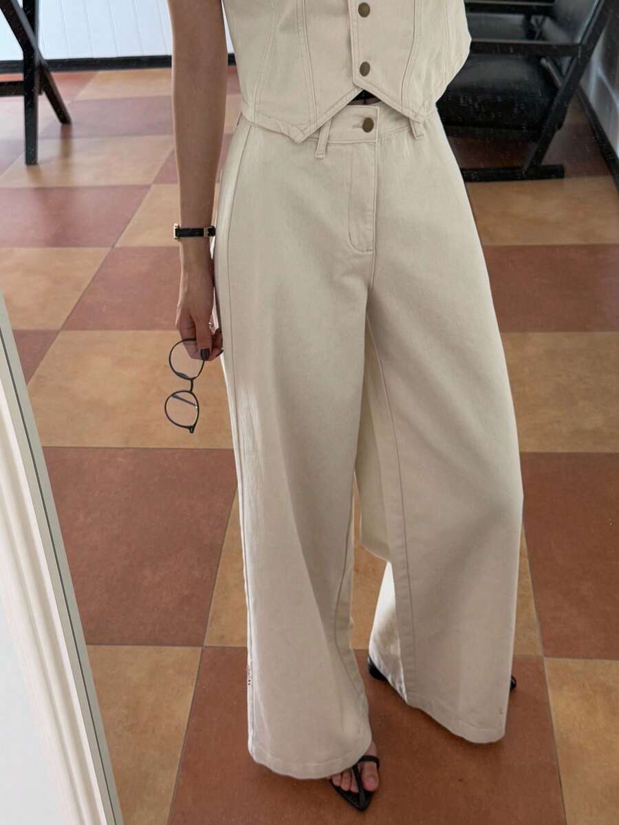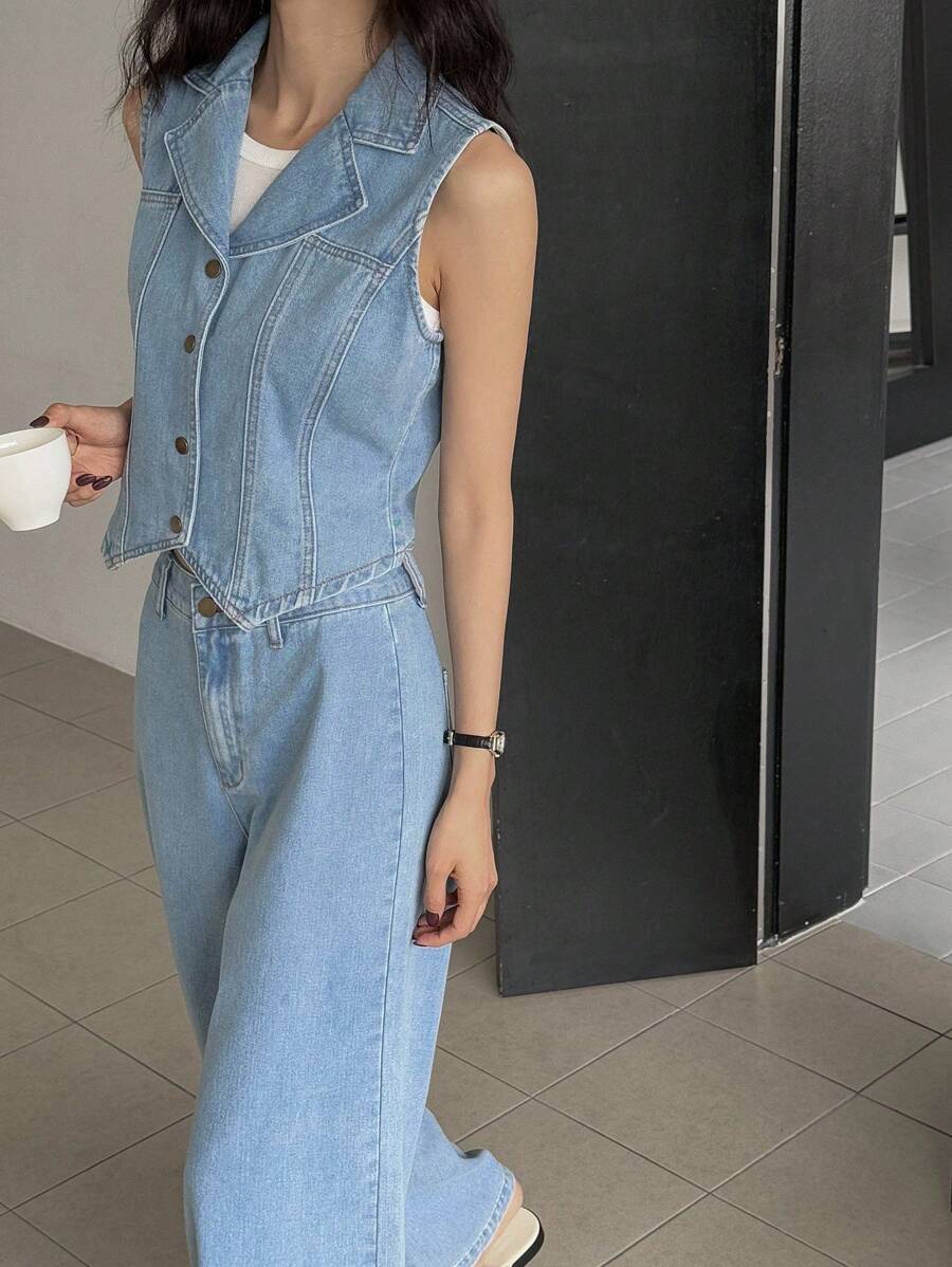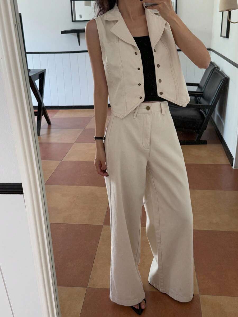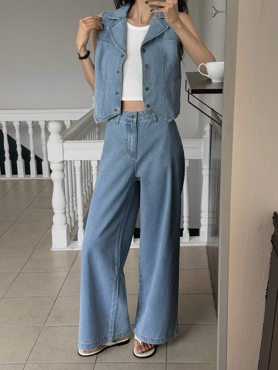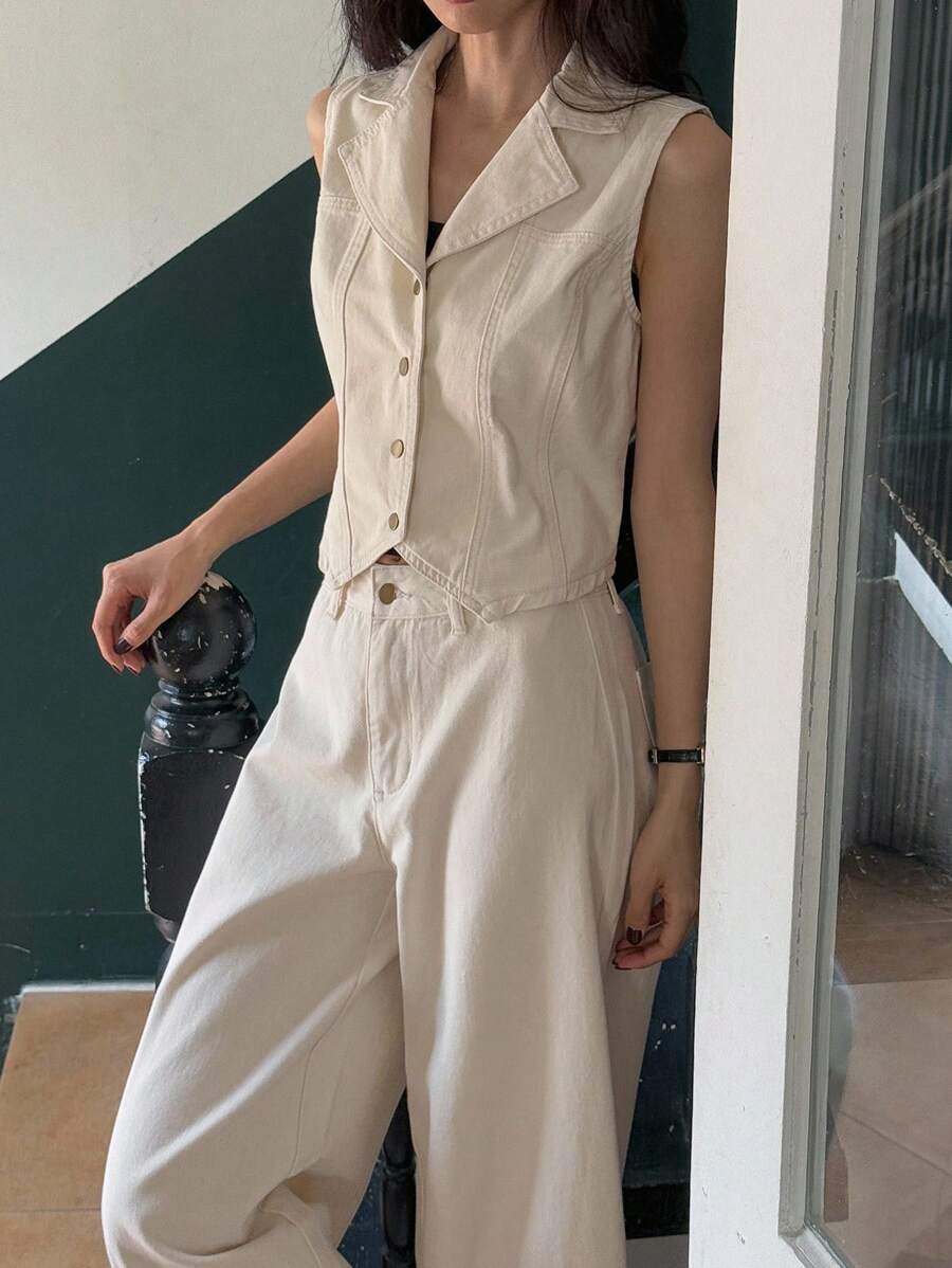 MIU Women's Contrast Piping Blazer Vest And Wide-Leg Jeans 2-Piece Suit Set