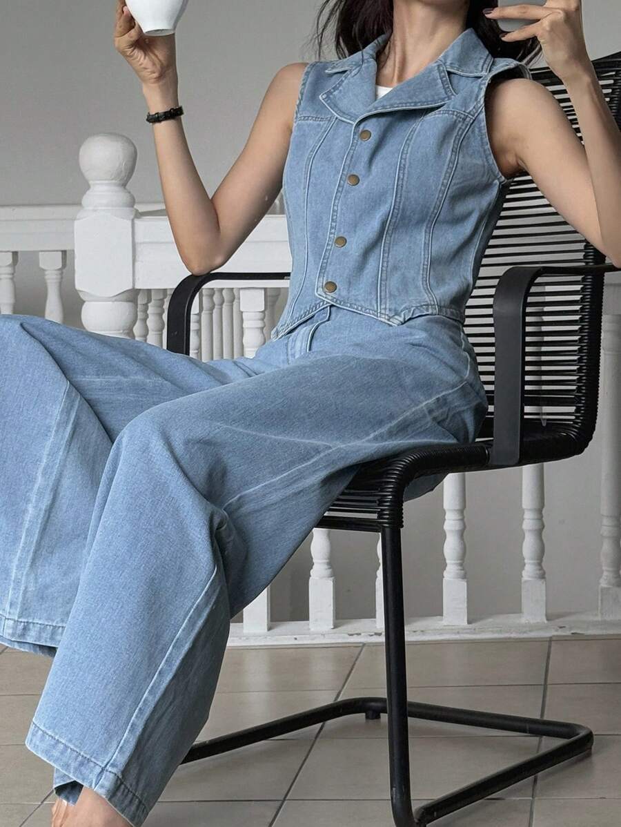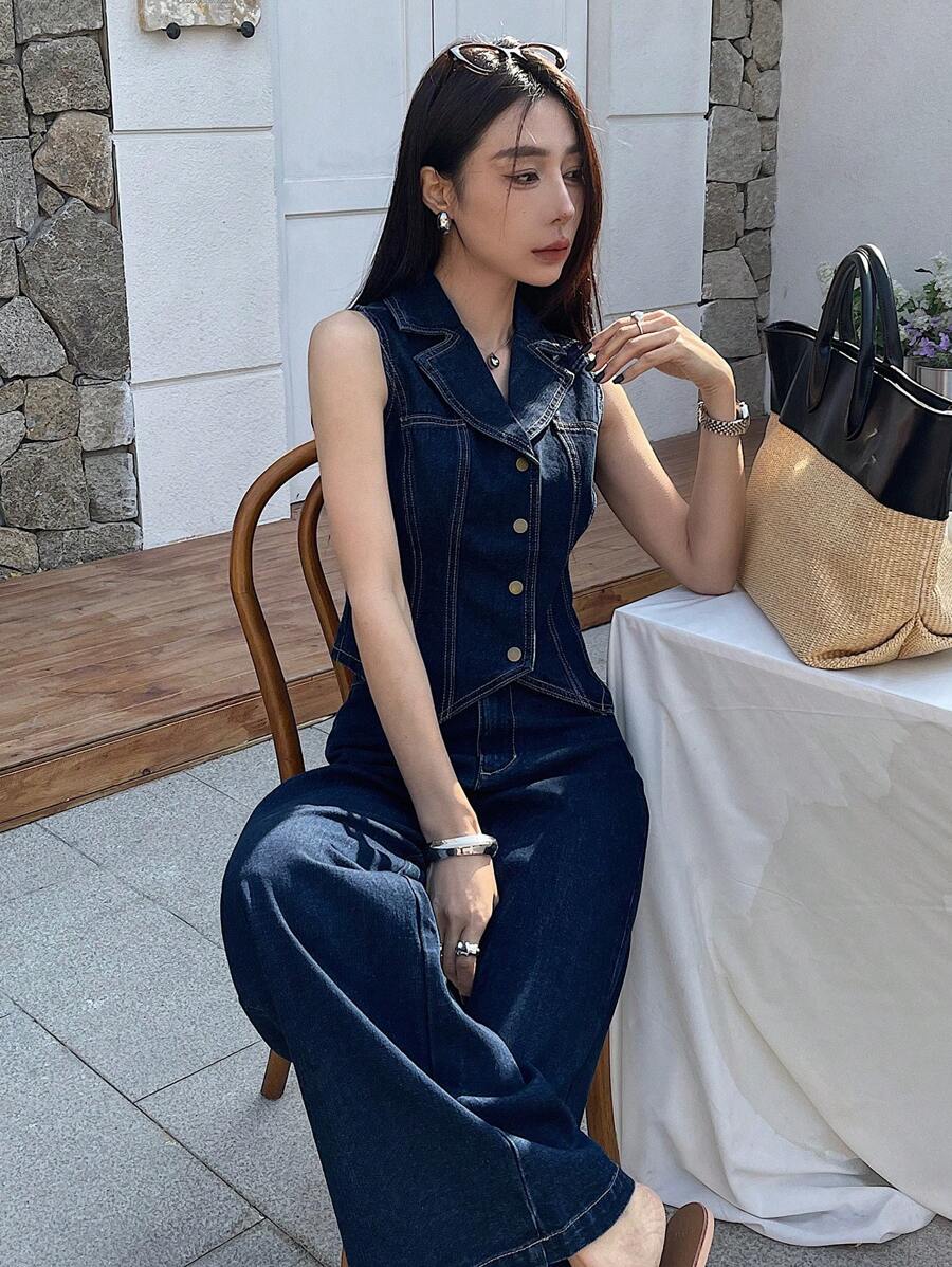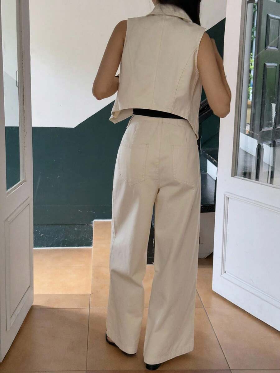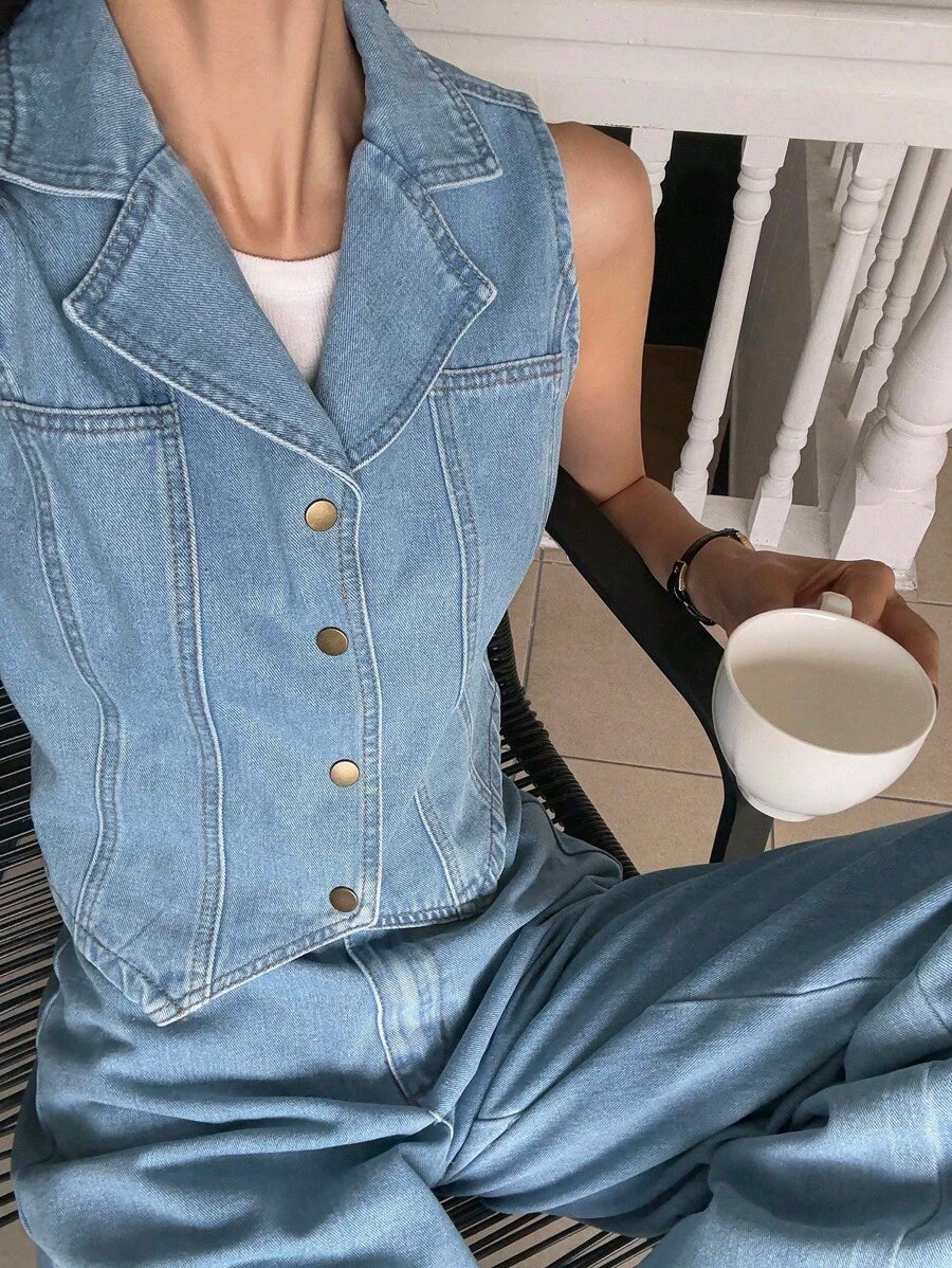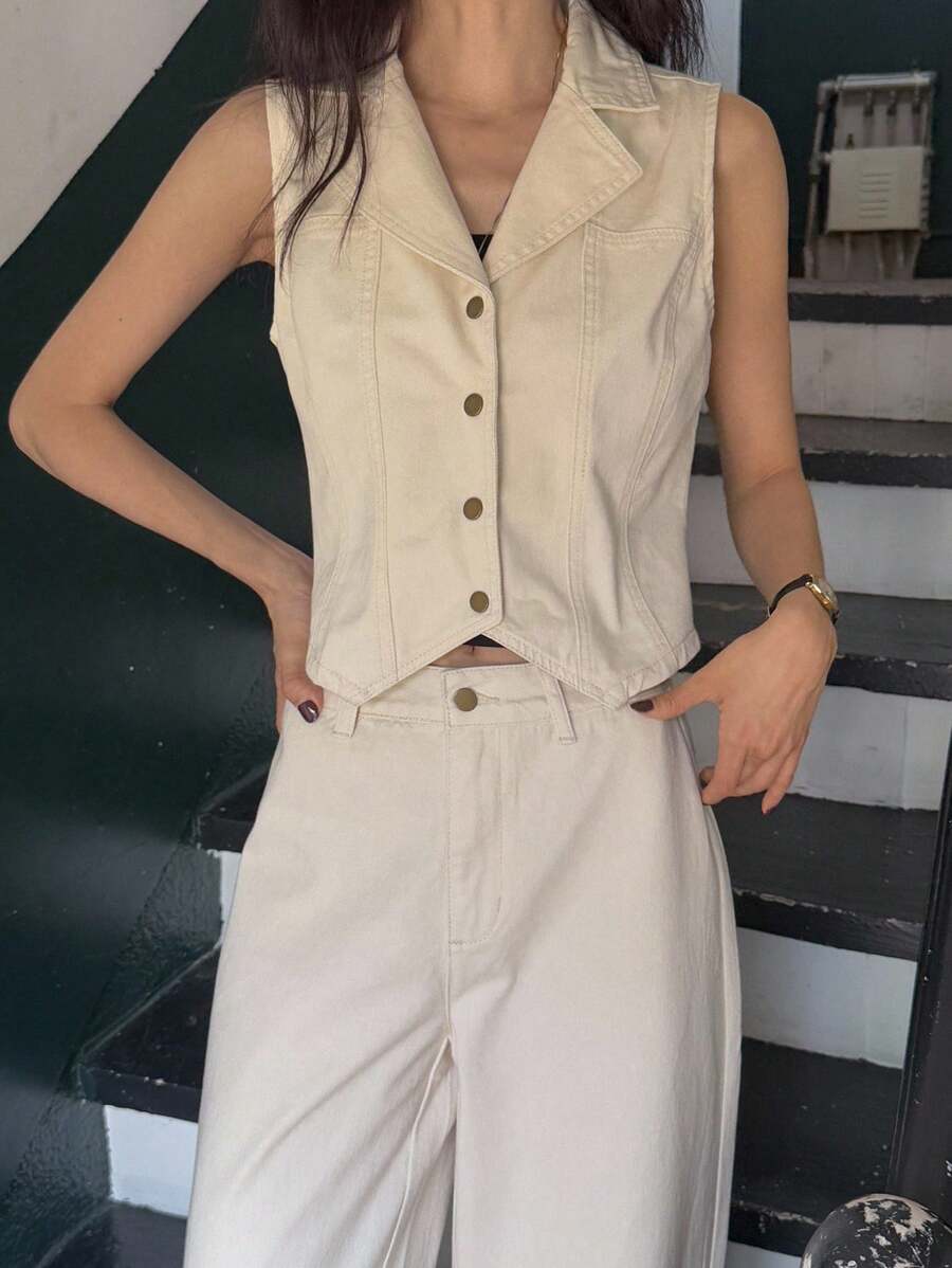 MIU Women's Contrast Piping Blazer Vest And Wide-Leg Jeans 2-Piece Suit Set