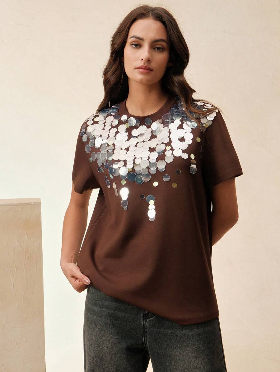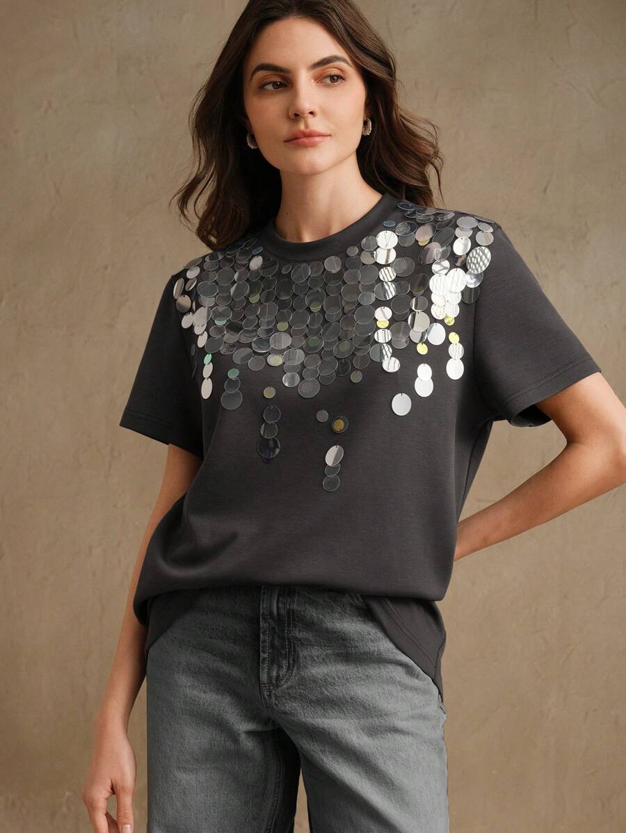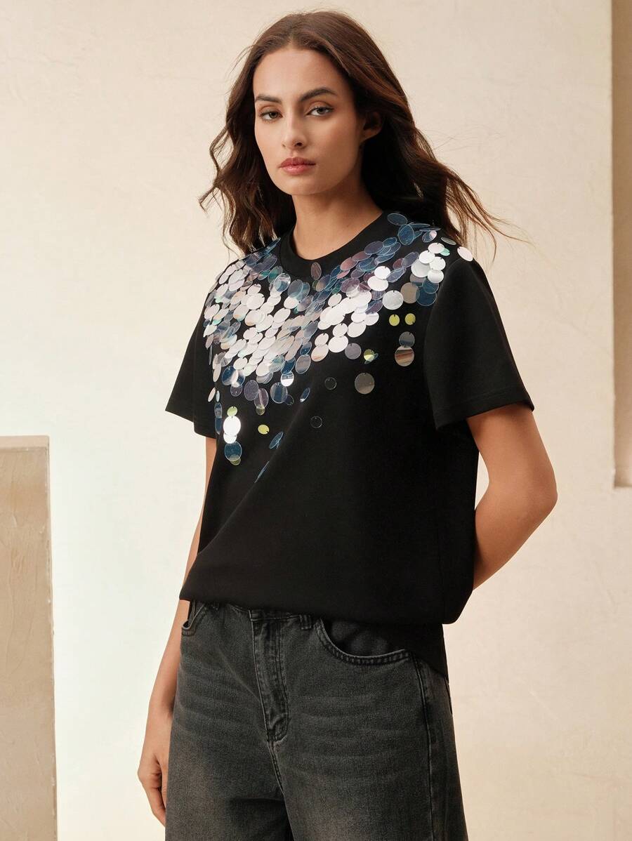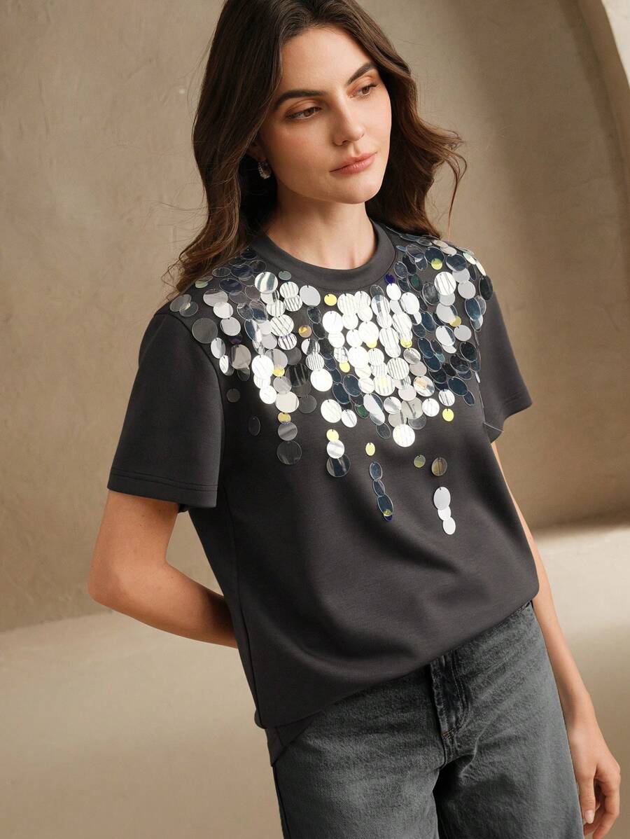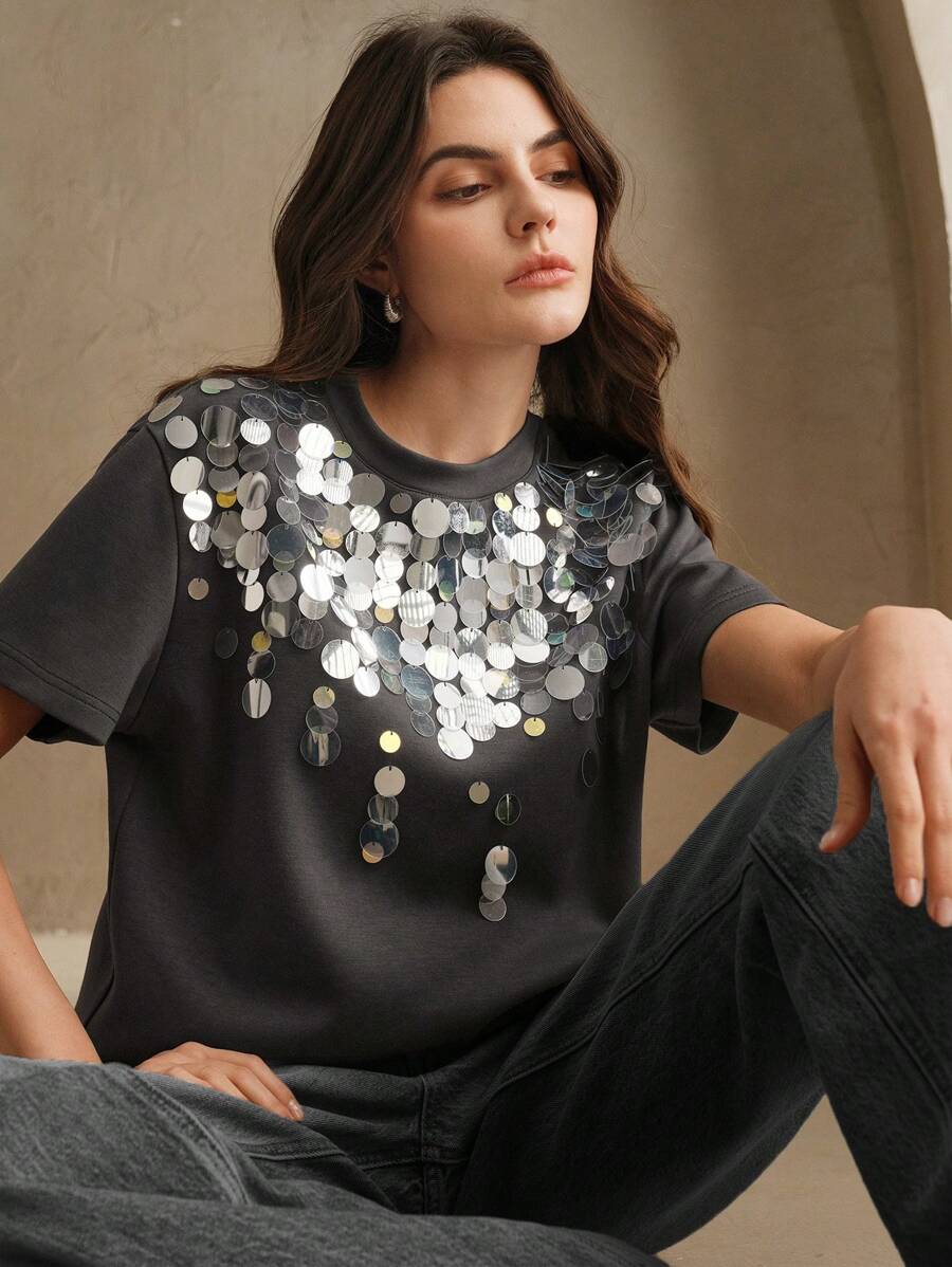 MIU Women's Crew Neck Short Sleeve Regular Length Elegant Sequin T-Shirt, Spring/Summer Outfits For Women, Festival