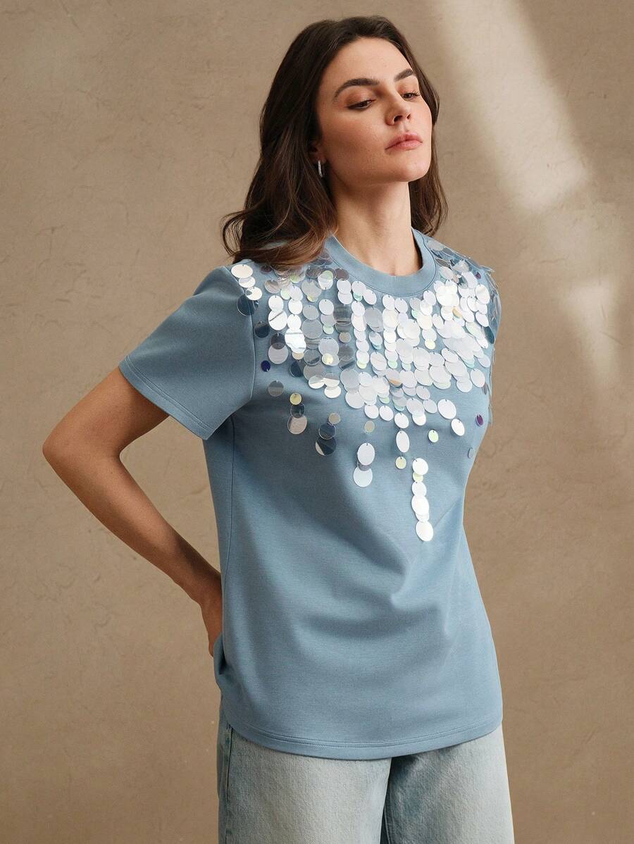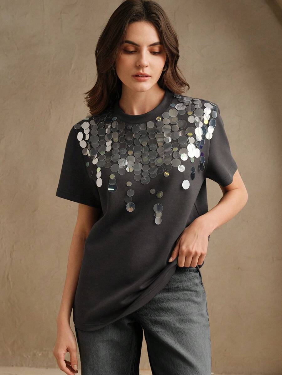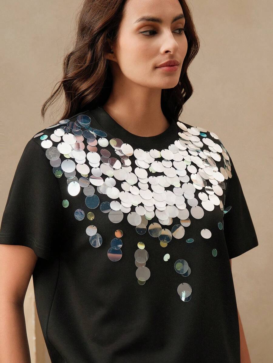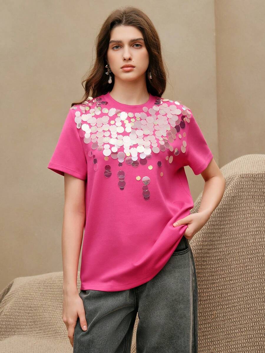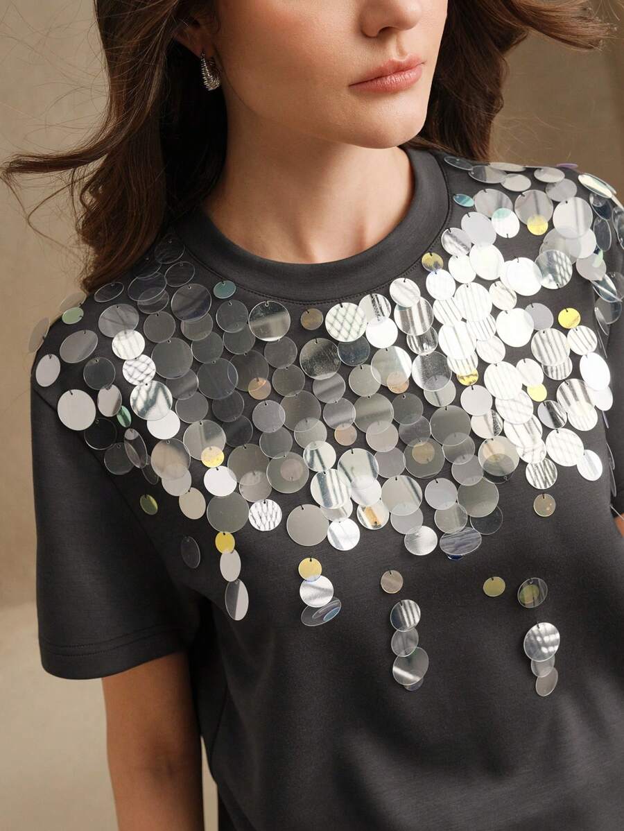 MIU Women's Crew Neck Short Sleeve Regular Length Elegant Sequin T-Shirt, Spring/Summer Outfits For Women, Festival