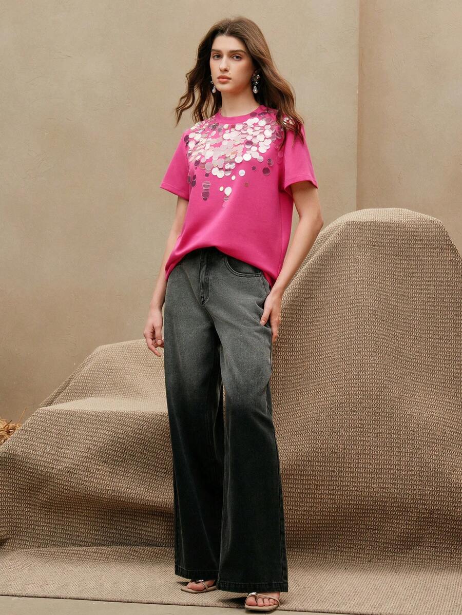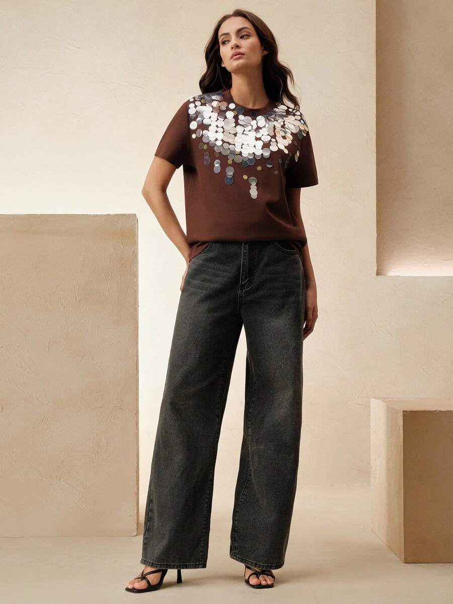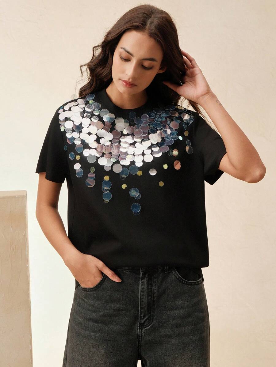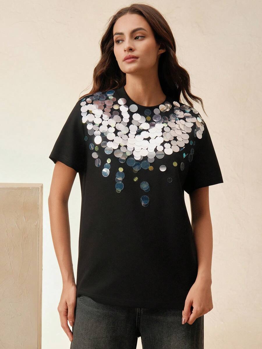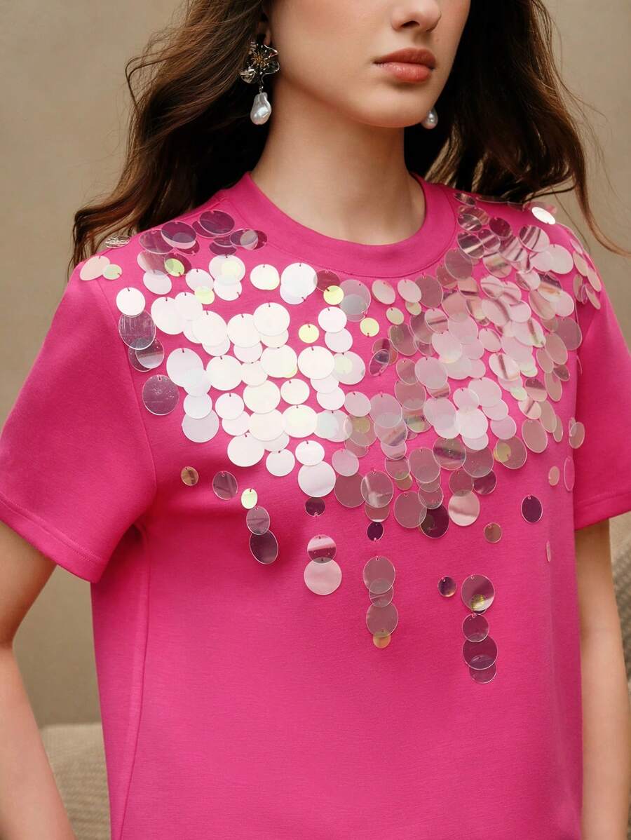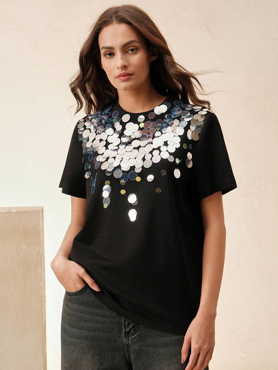 MIU Women's Crew Neck Short Sleeve Regular Length Elegant Sequin T-Shirt, Spring/Summer Outfits For Women, Festival