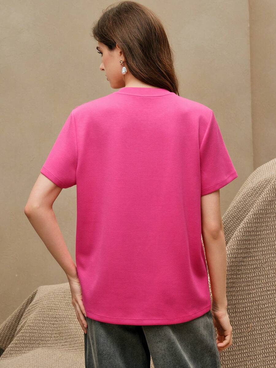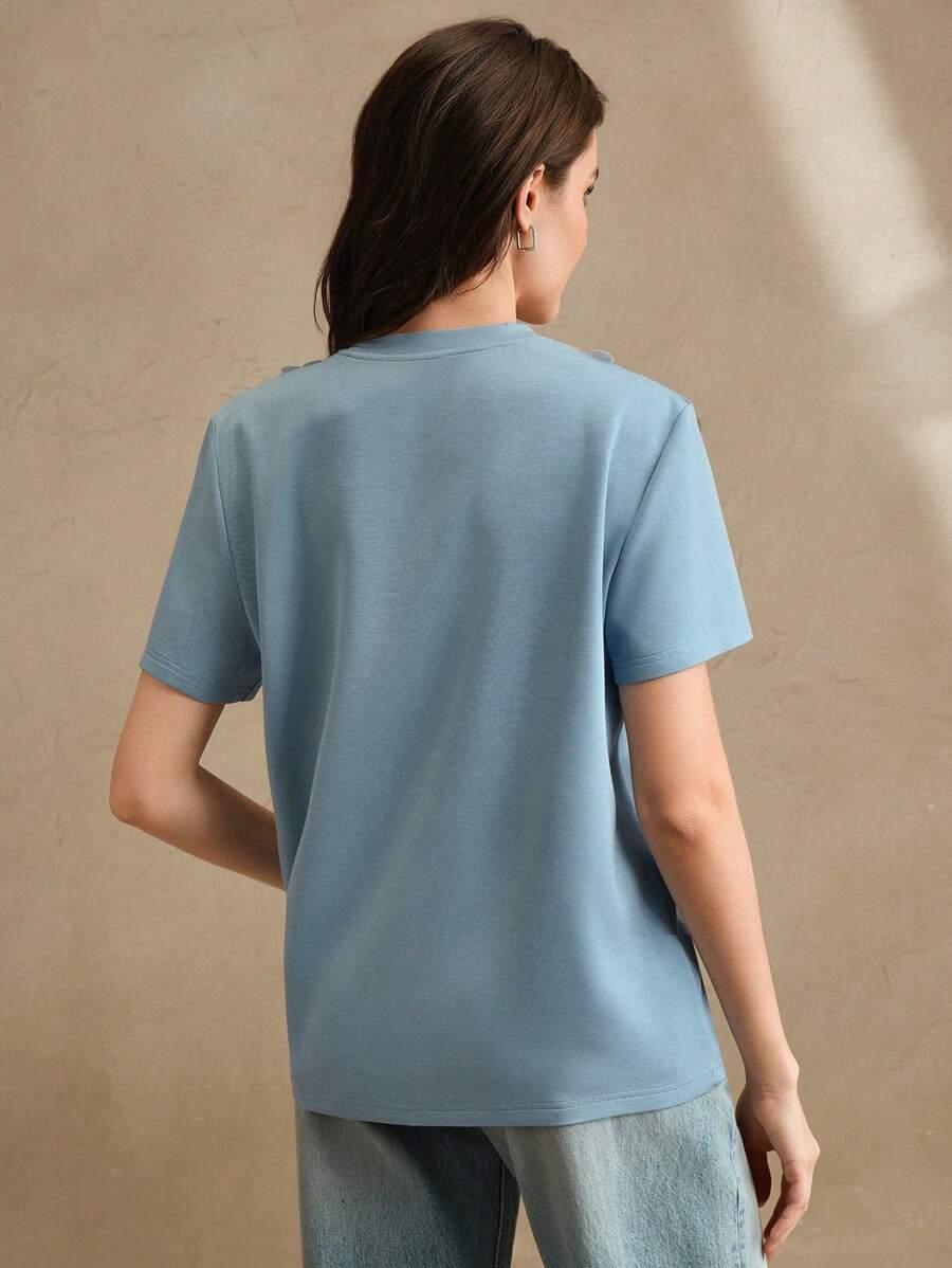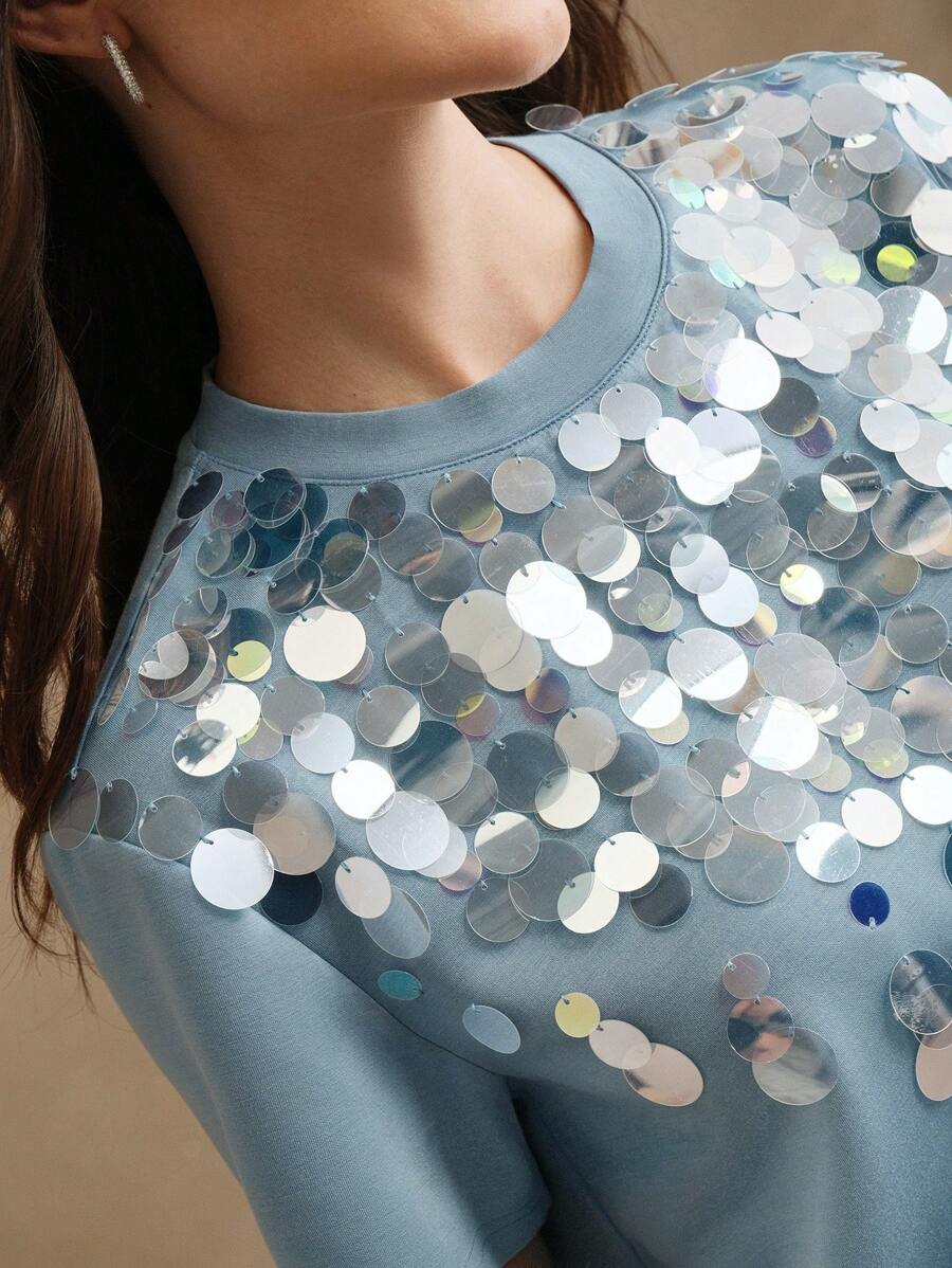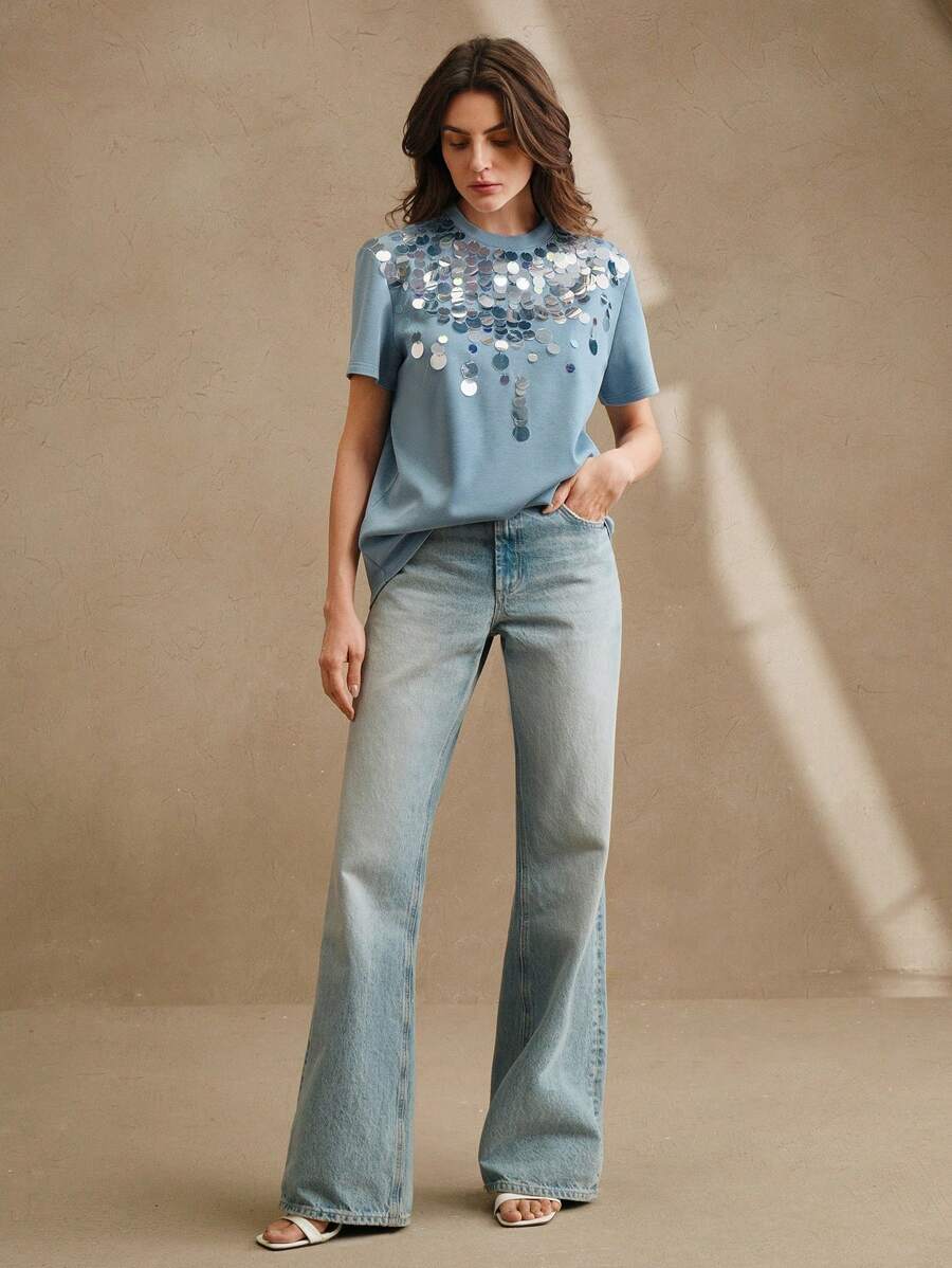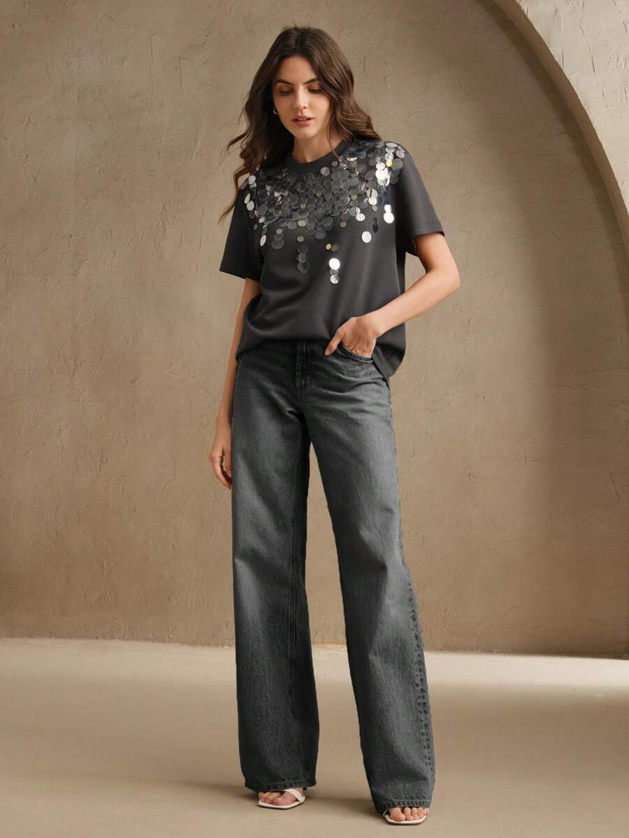 MIU Women's Crew Neck Short Sleeve Regular Length Elegant Sequin T-Shirt, Spring/Summer Outfits For Women, Festival