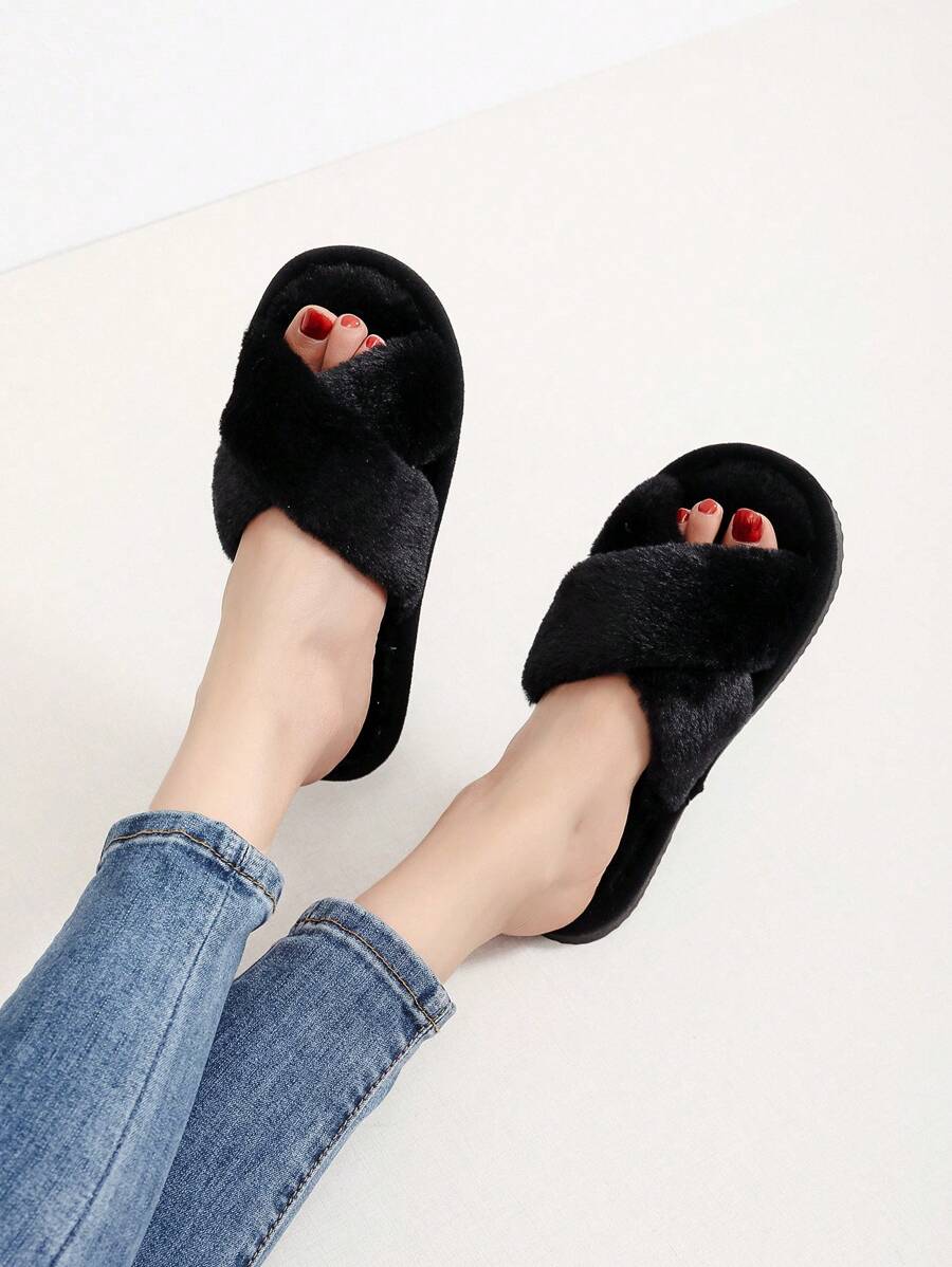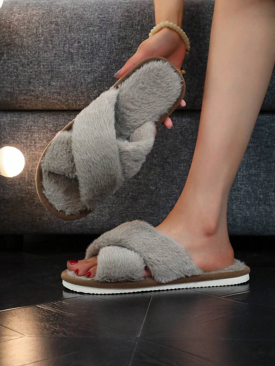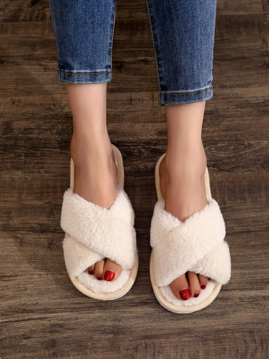 MIU Women's Cross-Band Furry Slippers, Soft And Cozy House Slippers, Warm And Comfortable Open Toe Plush Indoor/Outdoor Shoes Breathable Pink Slippers