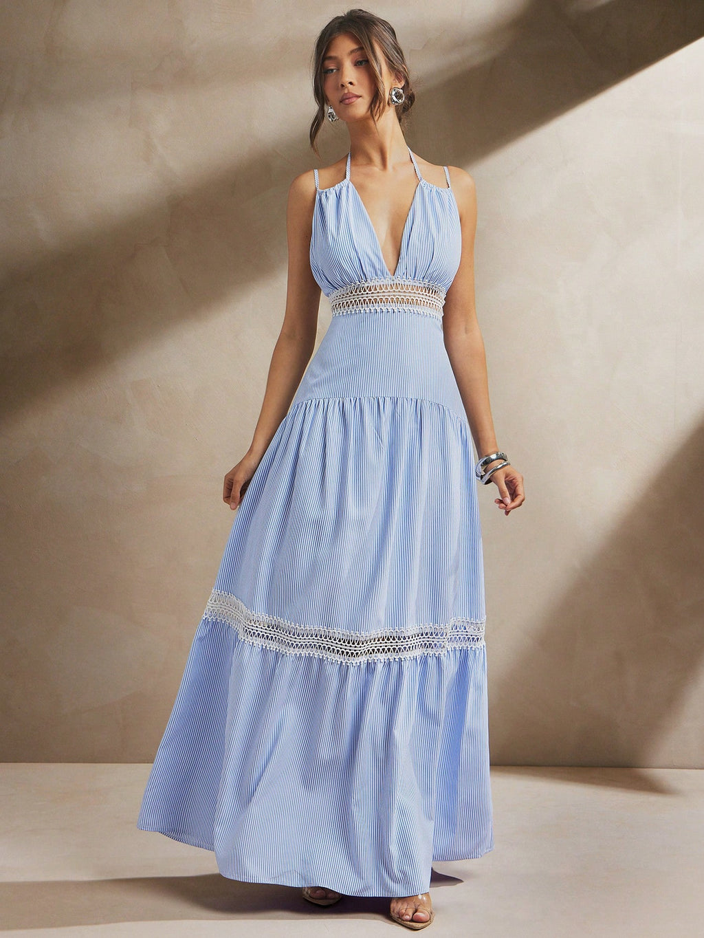 MIU Women's Double Strap Sleeveless Blue/White Popline Stripe Low Neck Flowy Summer Maxi Dress With Sheer Trim, Summer Outfits For Women, Beach Outfits For Women, 4th Of July Outfits