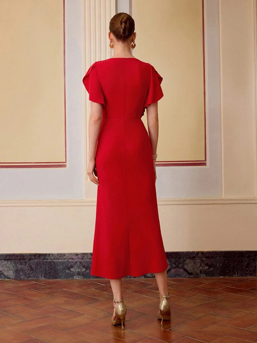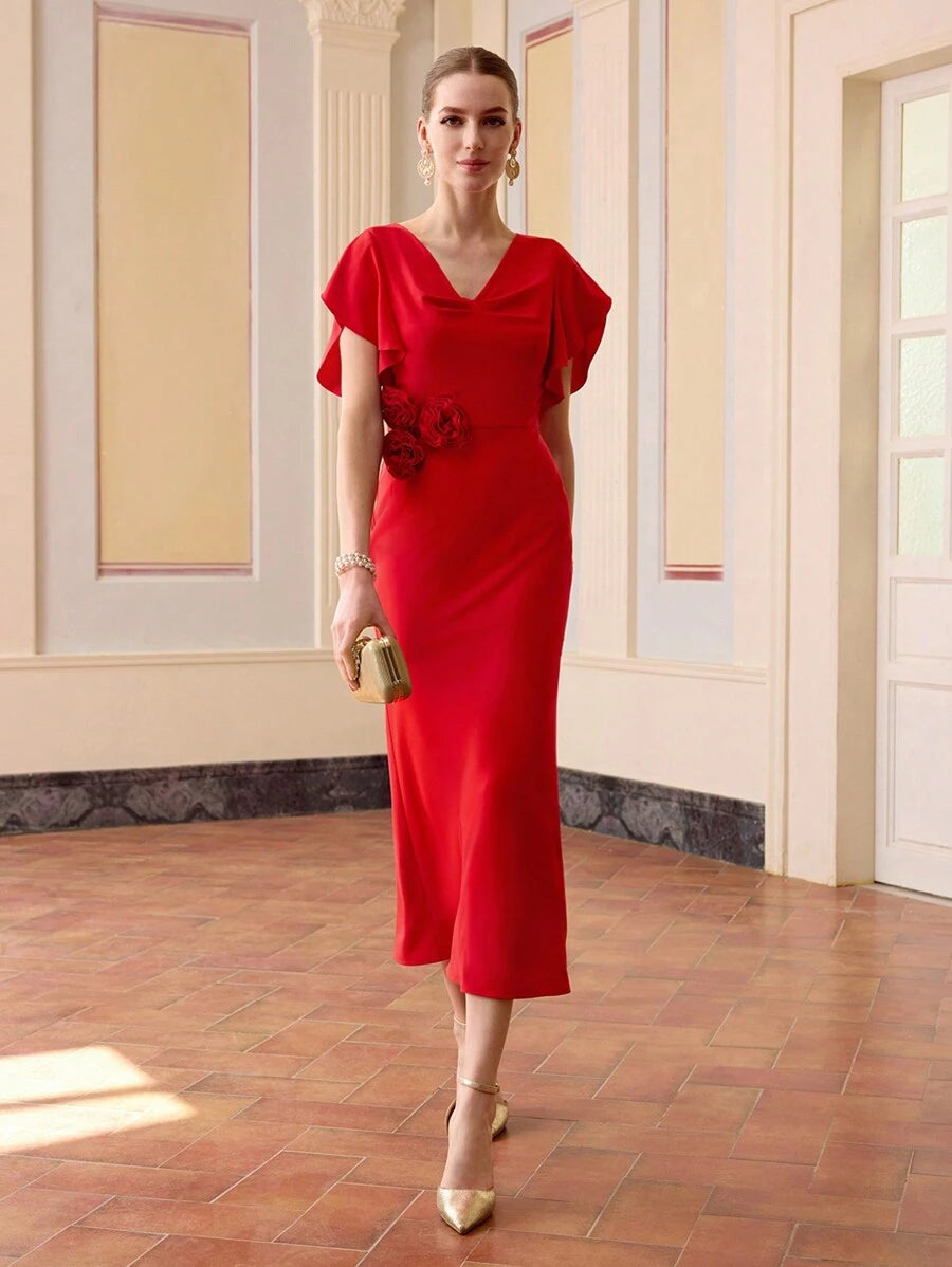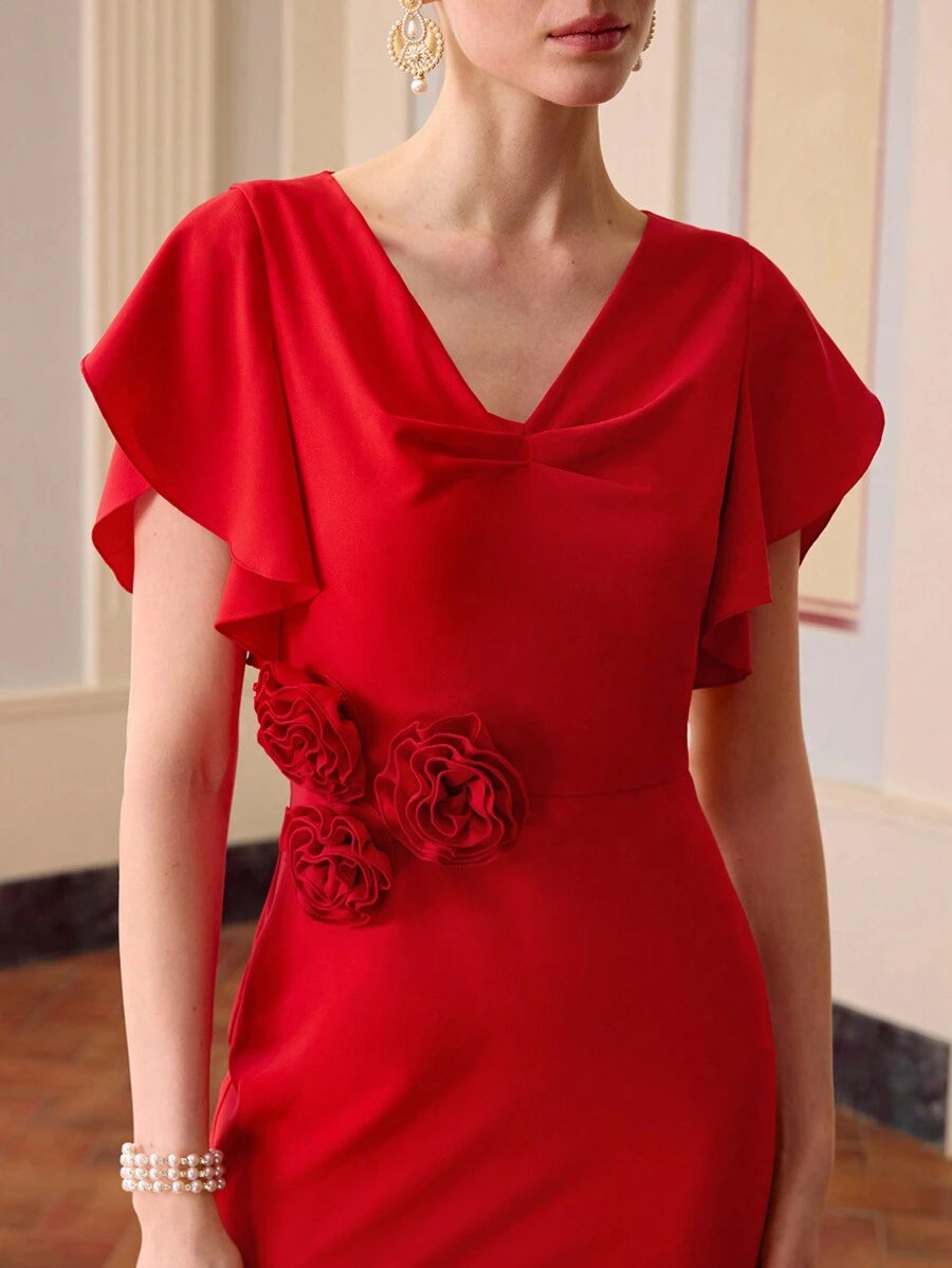 MIU Women's Elegant 3D Floral Color Block Ruffled Sleeve Dress