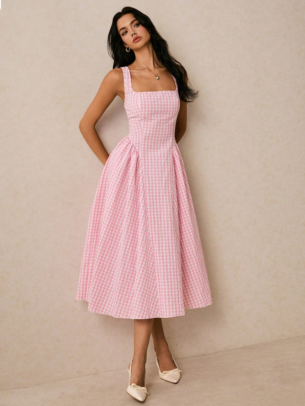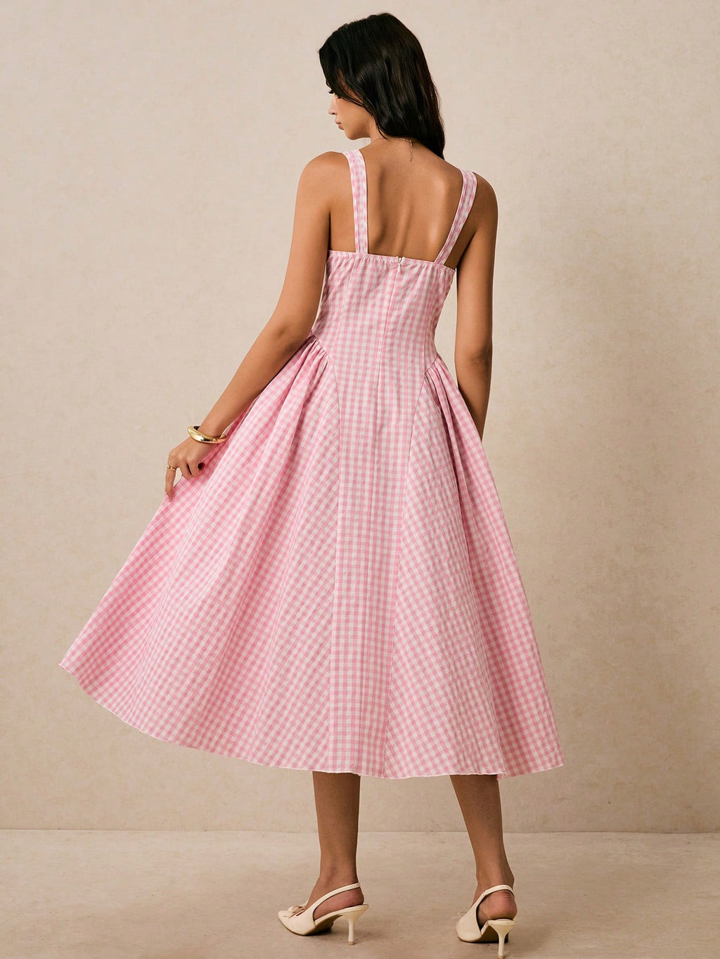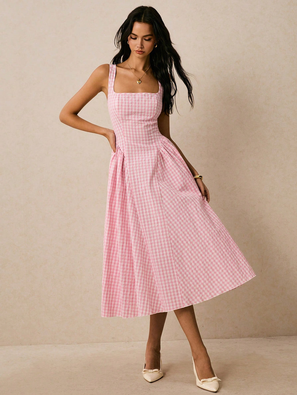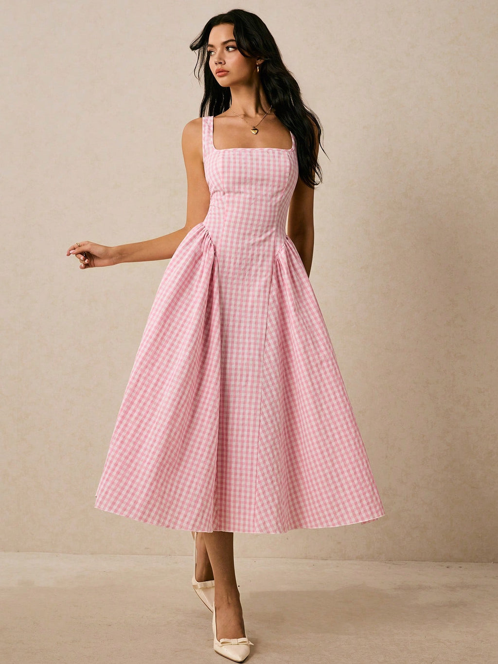 MIU Women's Elegant Check Pattern Sleeveless Midi Dress, Summer, Elegant,Summer Dresses For Women,Tea Party Dress,Casual Dresses For Woman,Business Casual Woman,Old Money