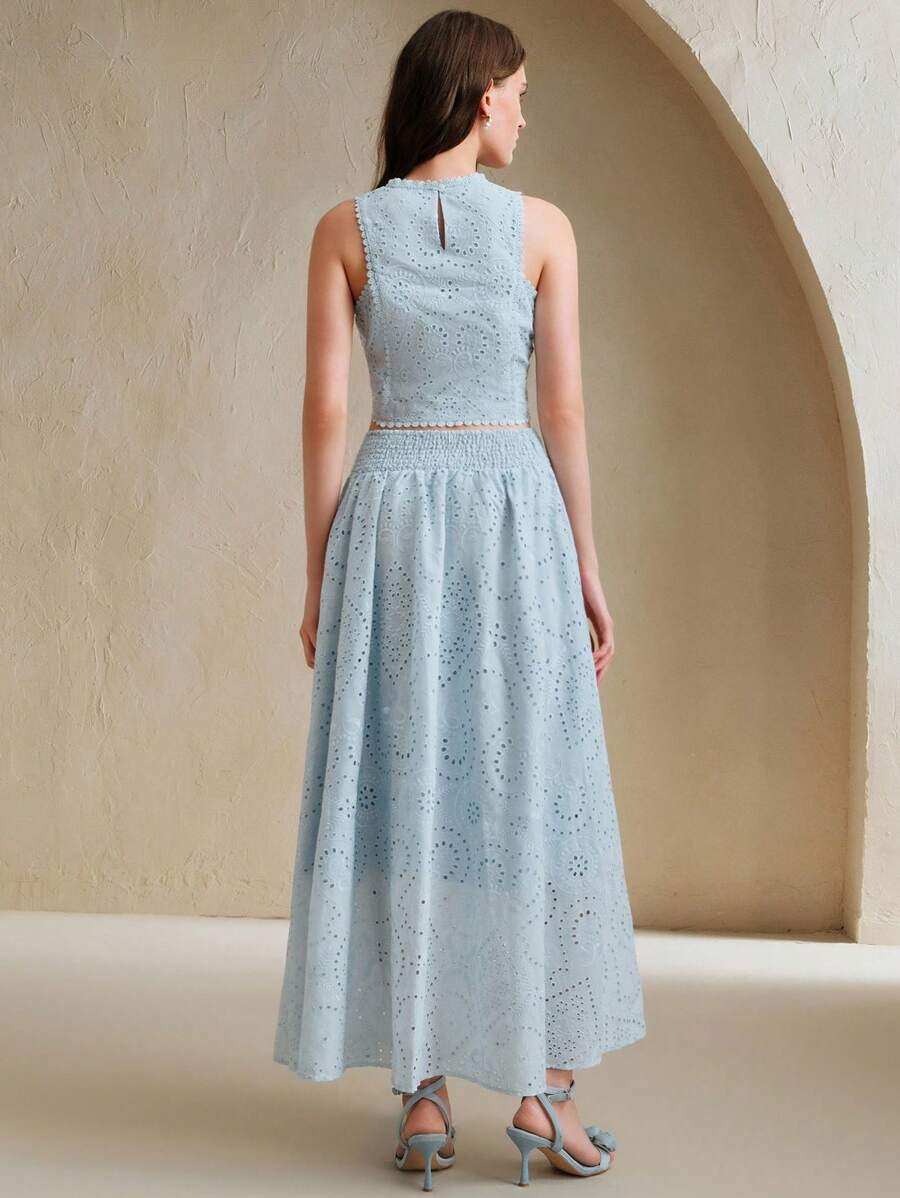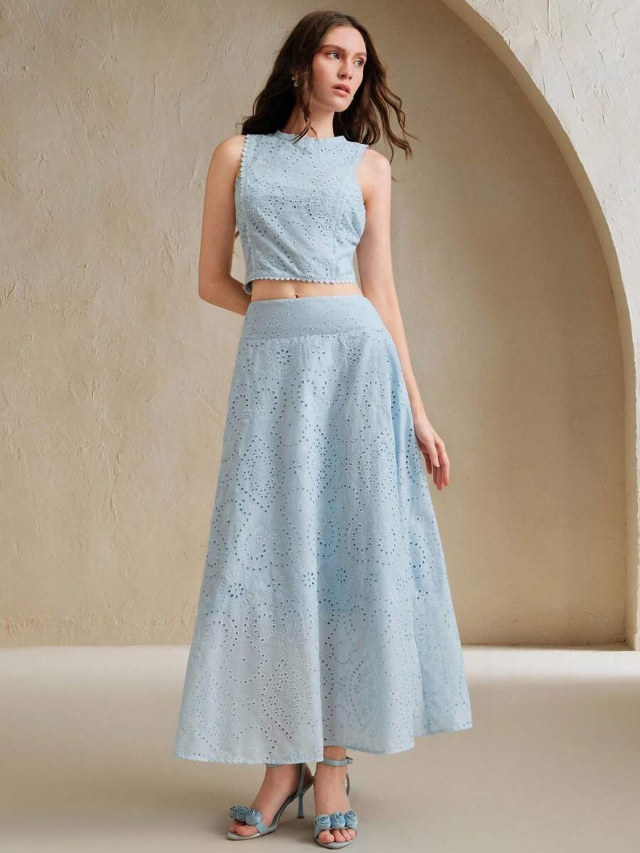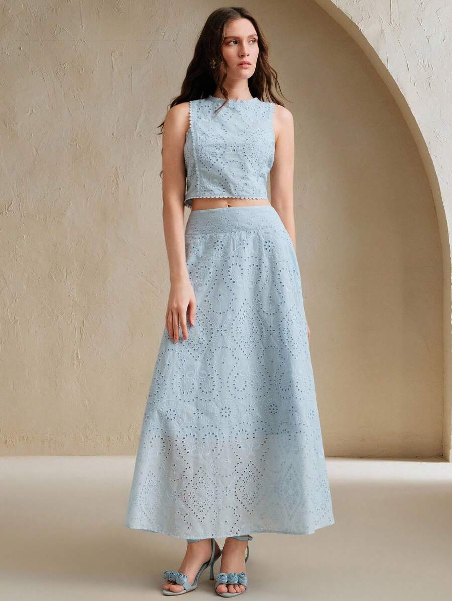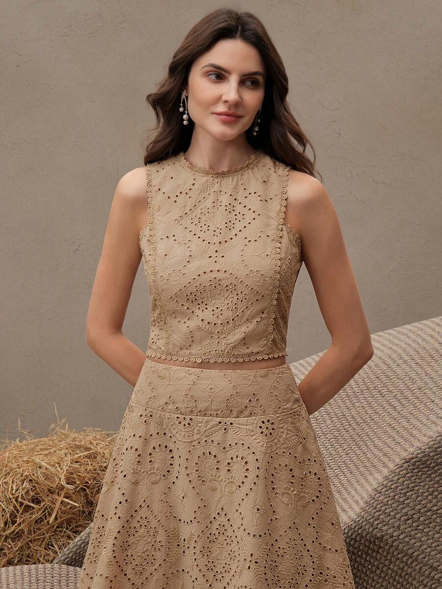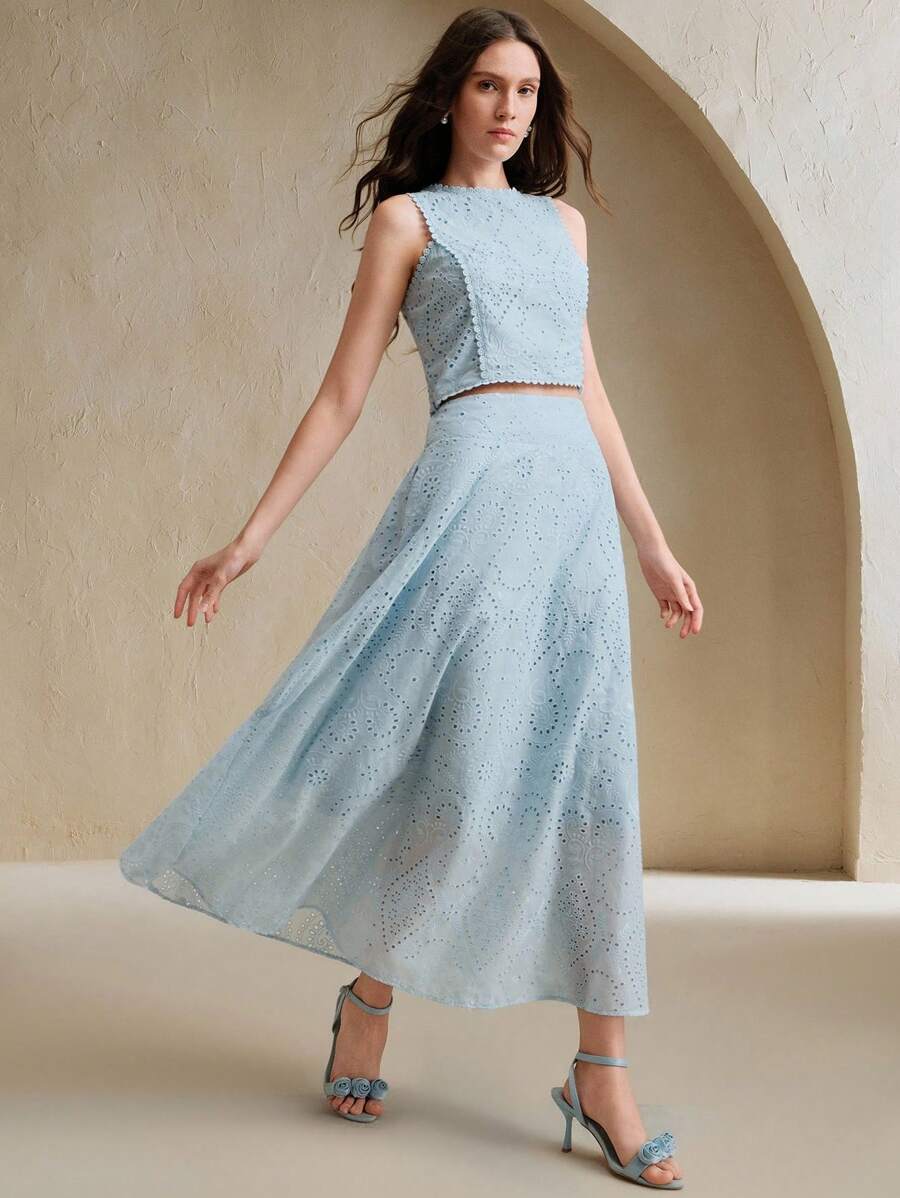 MIU Women's Elegant Embroidered Sleeveless Blouse Top And A-Line Skirt 2 Pieces Set, Suitable For Vacation, Spring/Summer, Festival, Graduation
