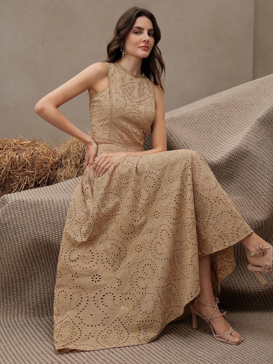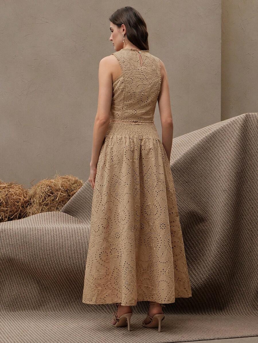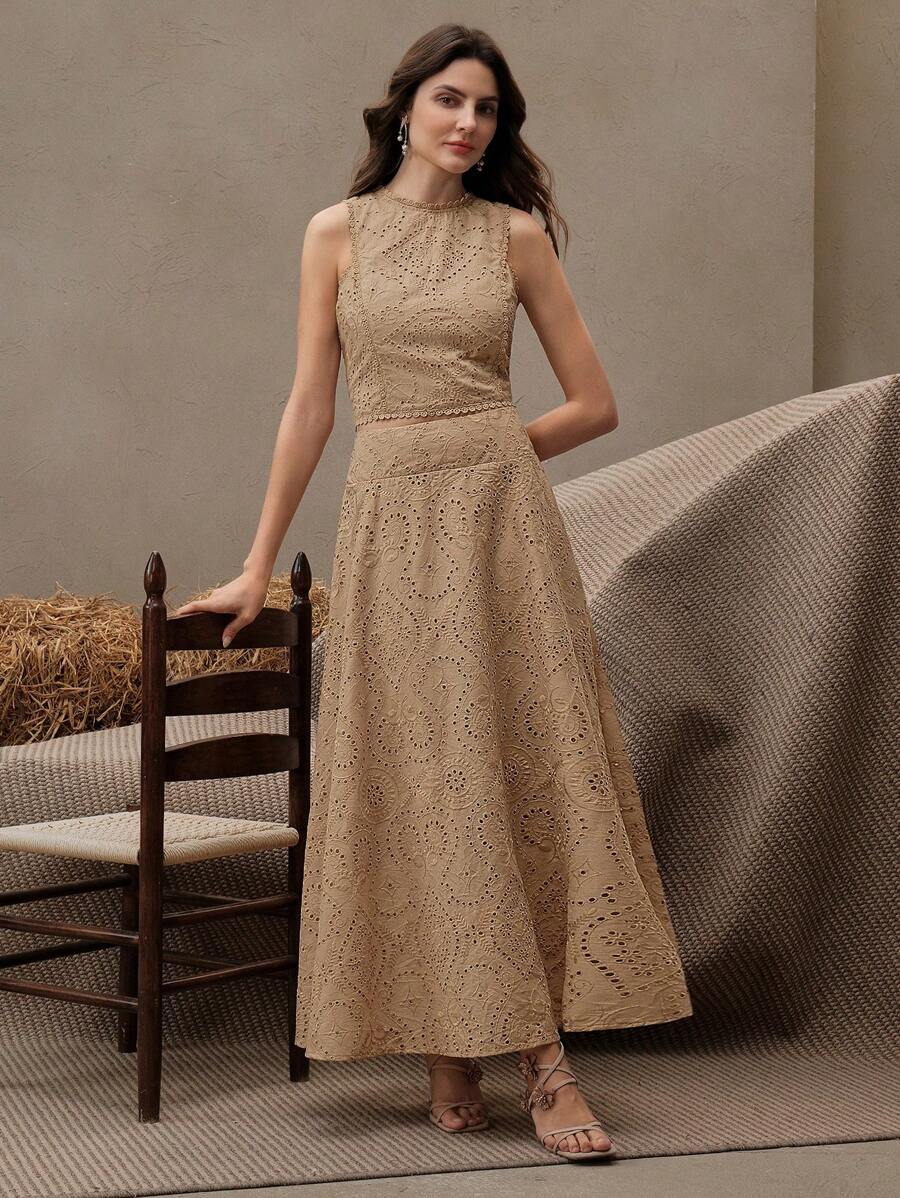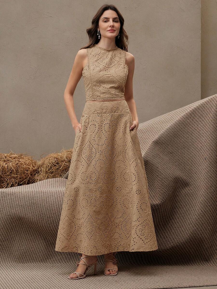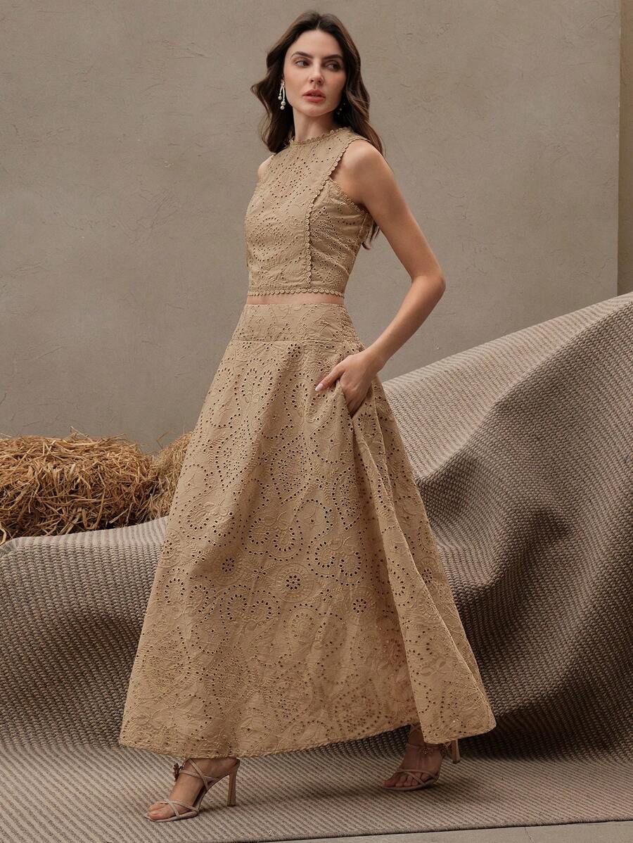 MIU Women's Elegant Embroidered Sleeveless Blouse Top And A-Line Skirt 2 Pieces Set, Suitable For Vacation, Spring/Summer, Festival, Graduation