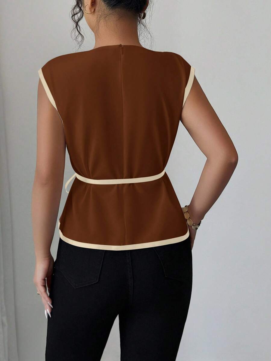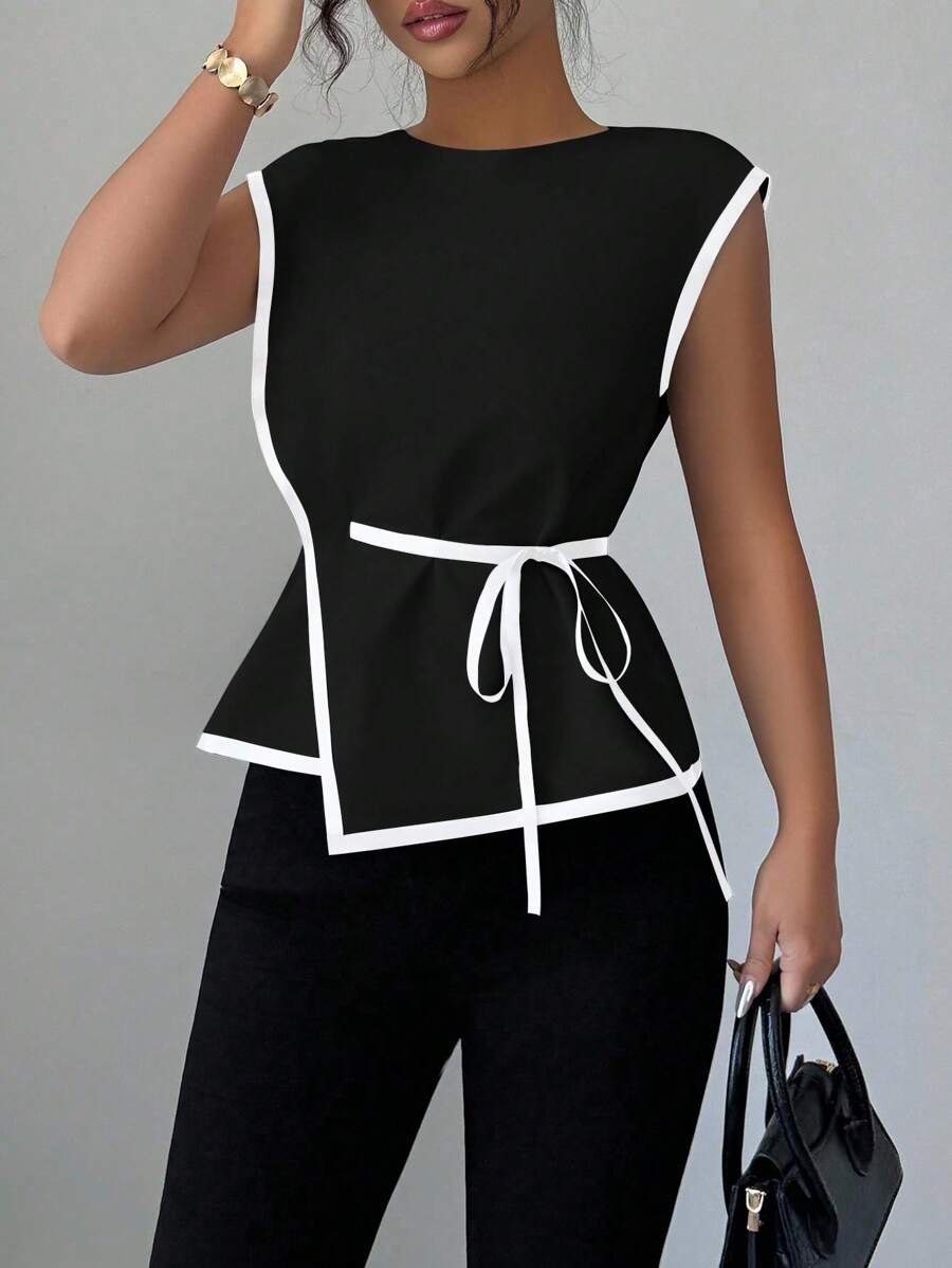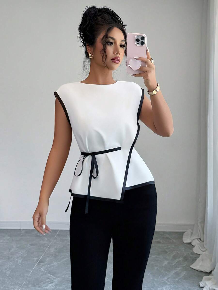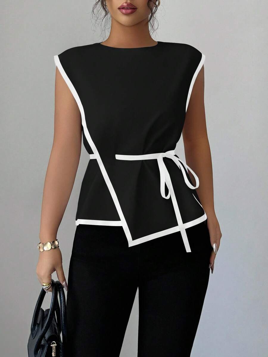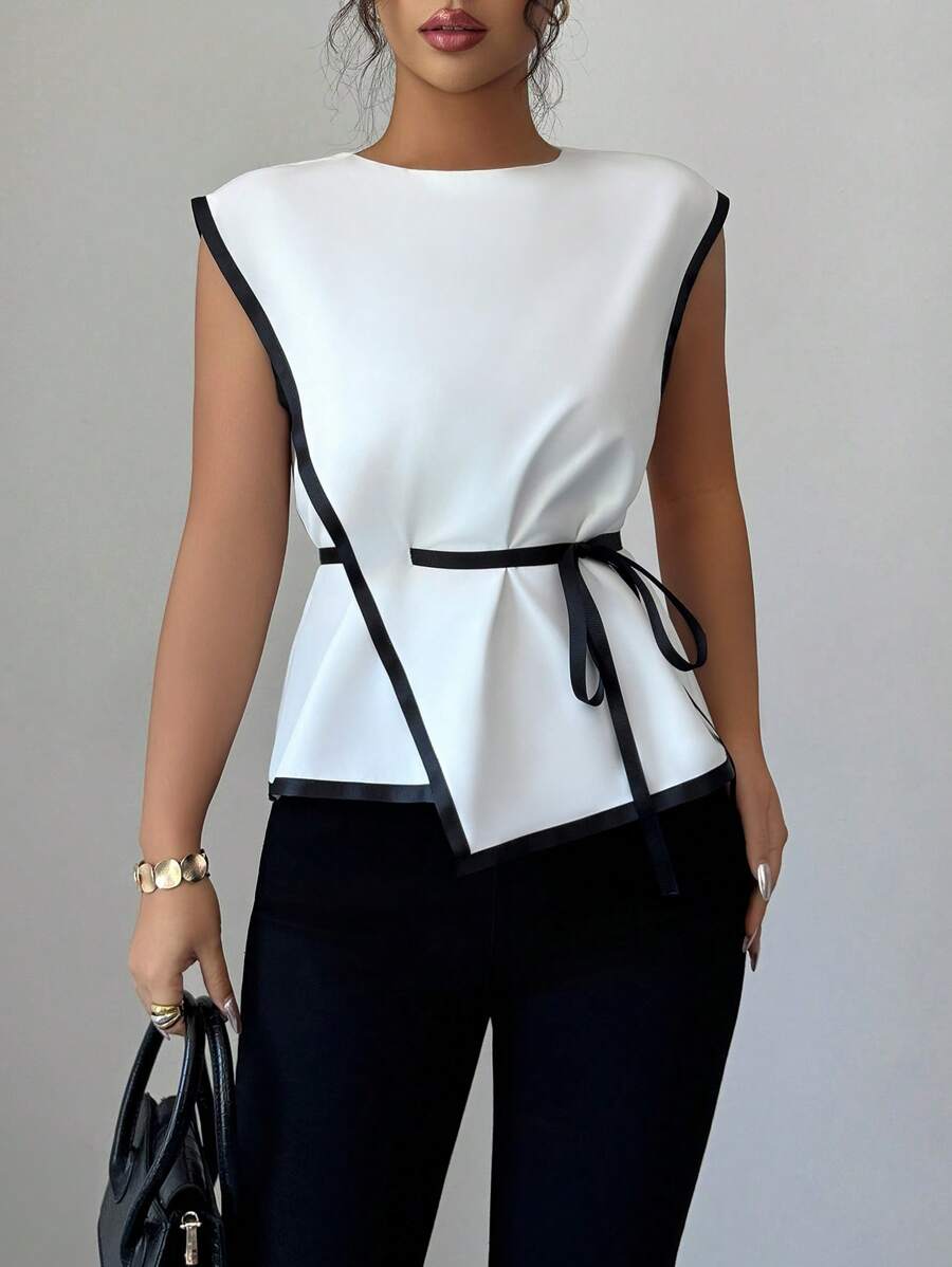 MIU Women's Elegant Fitted Two-Tone Blouse, Suitable For Commuting