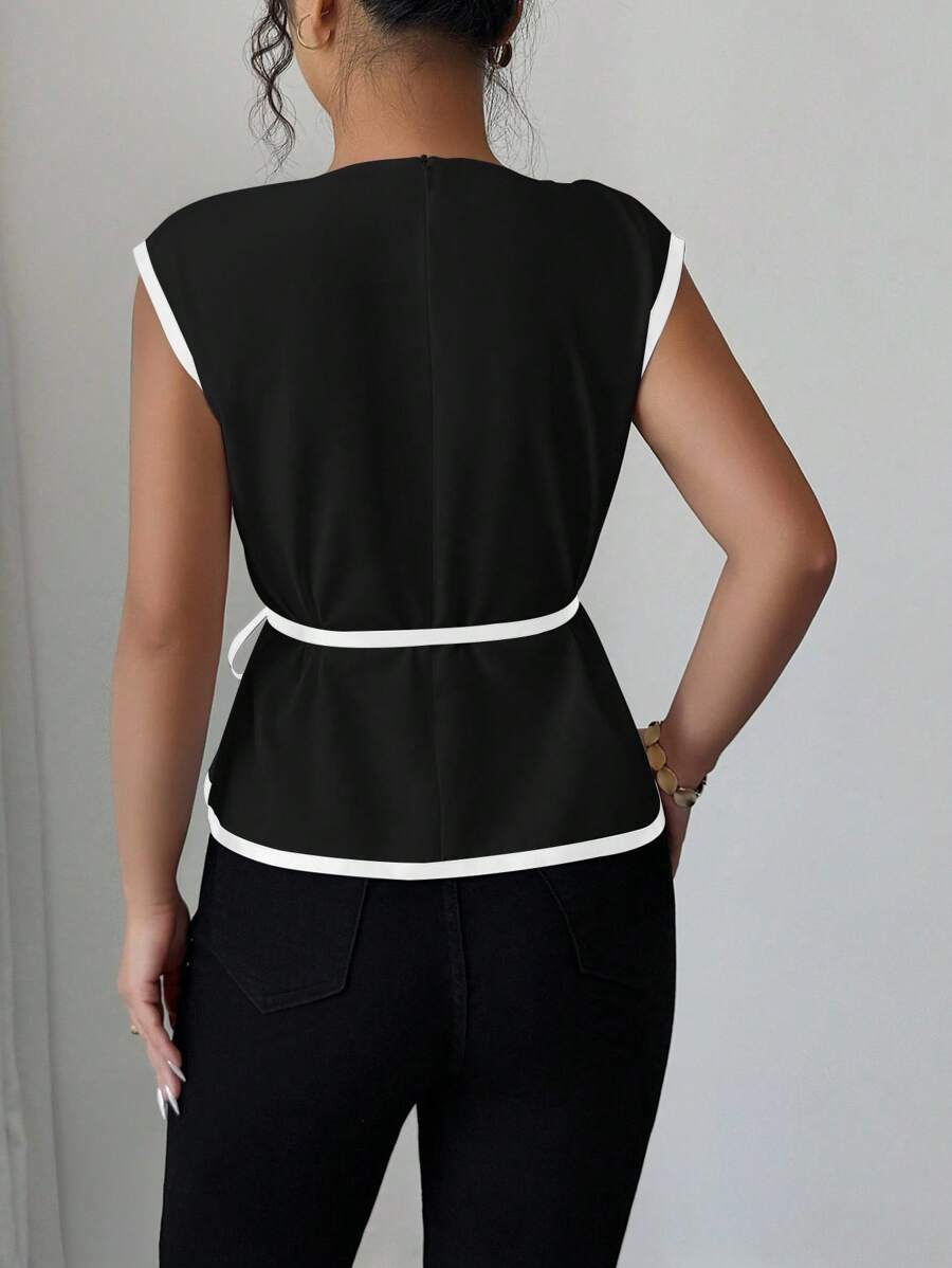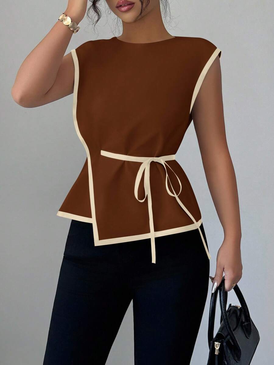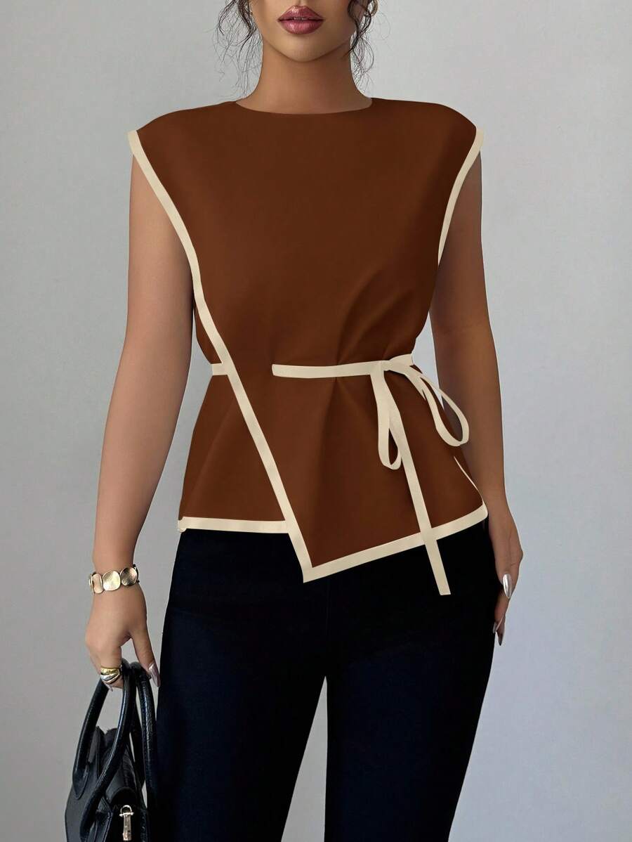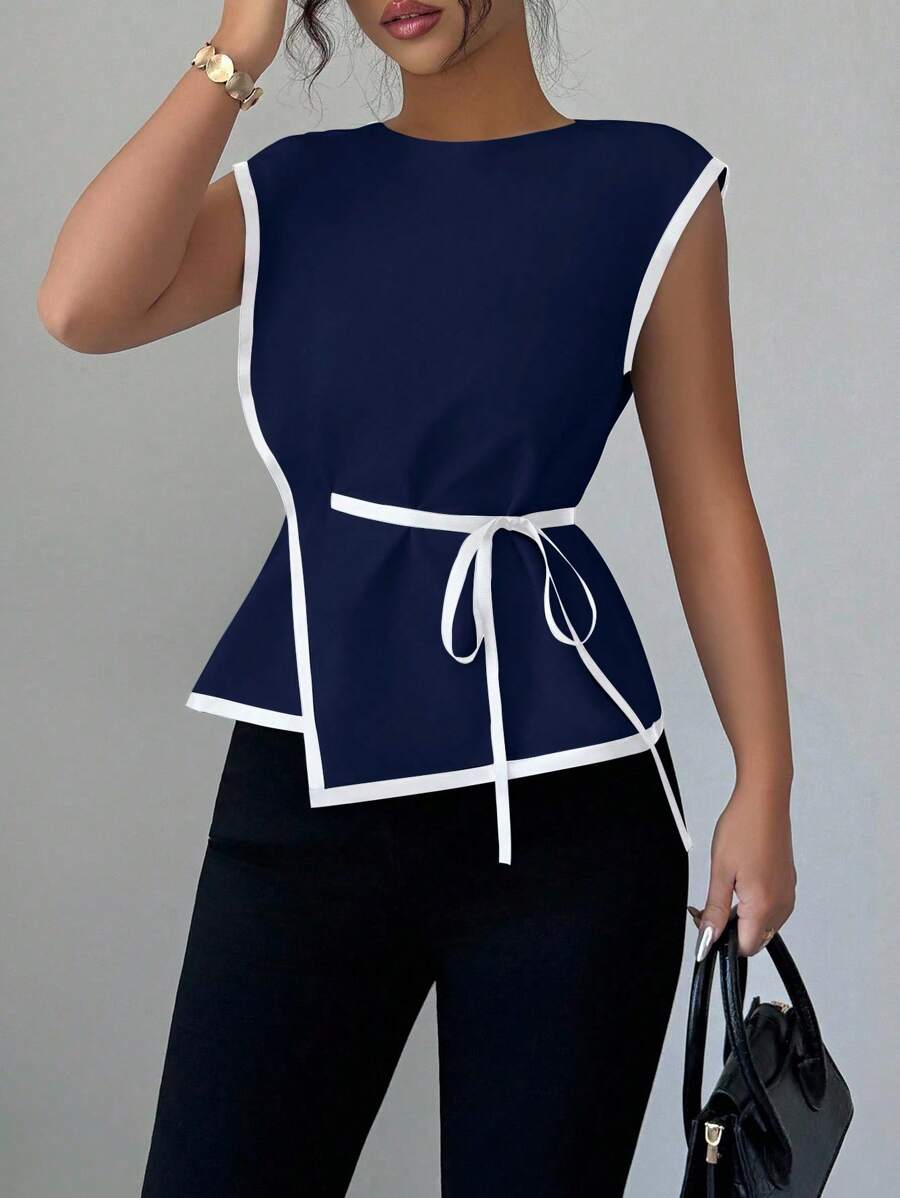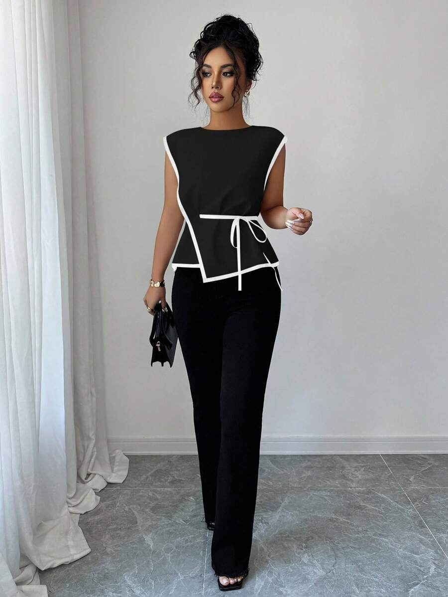 MIU Women's Elegant Fitted Two-Tone Blouse, Suitable For Commuting