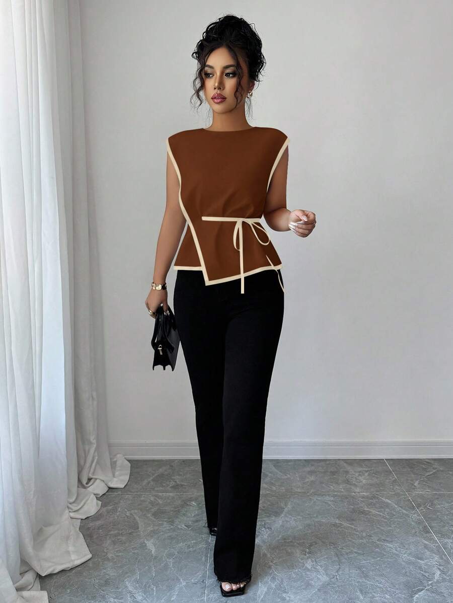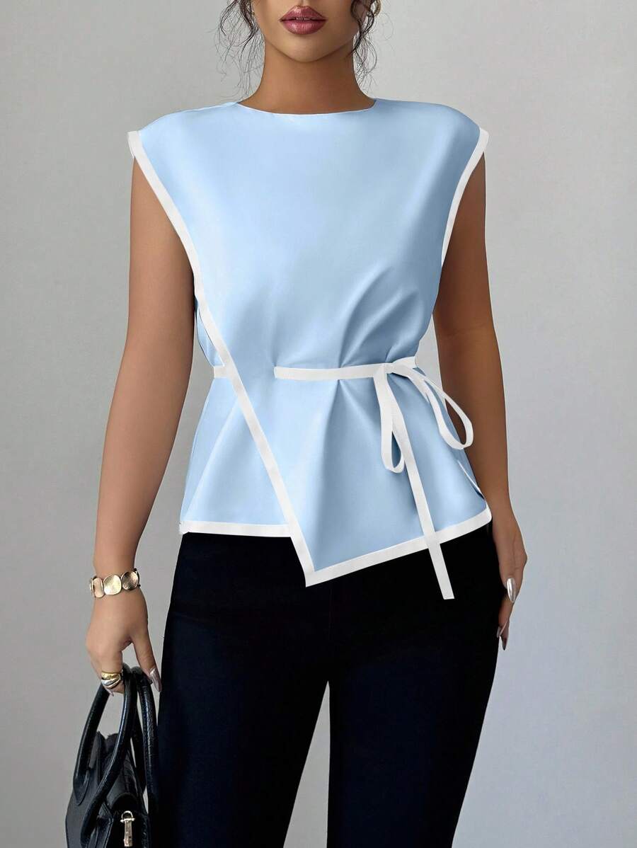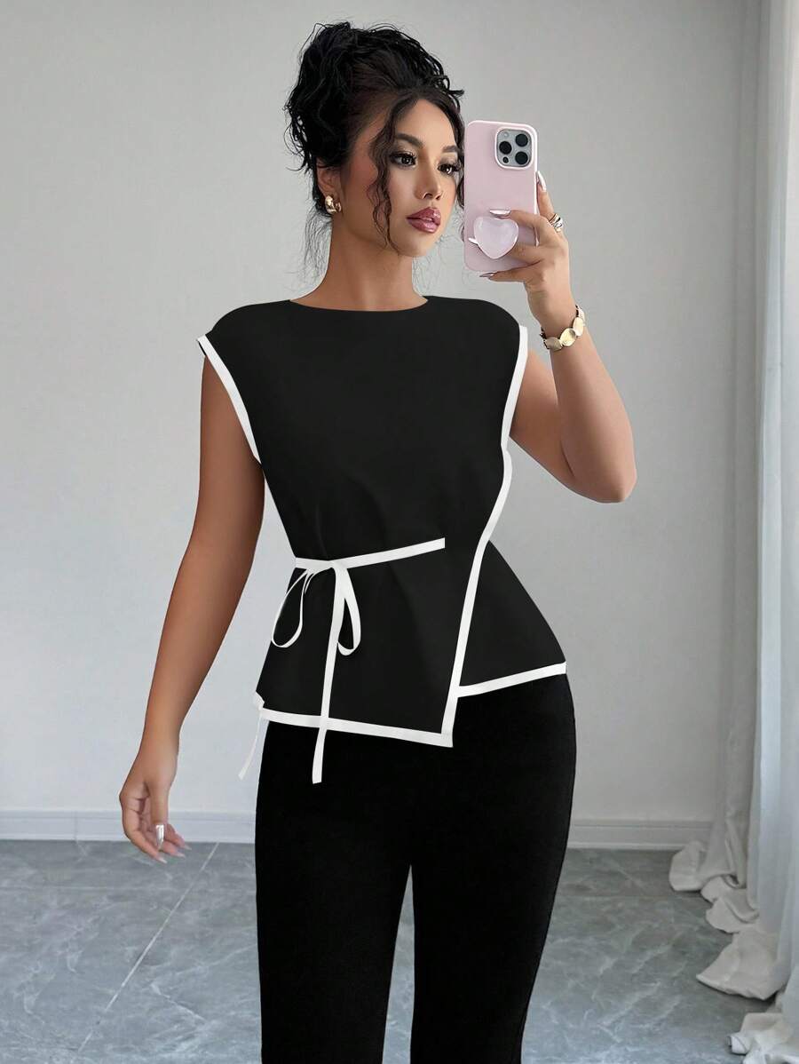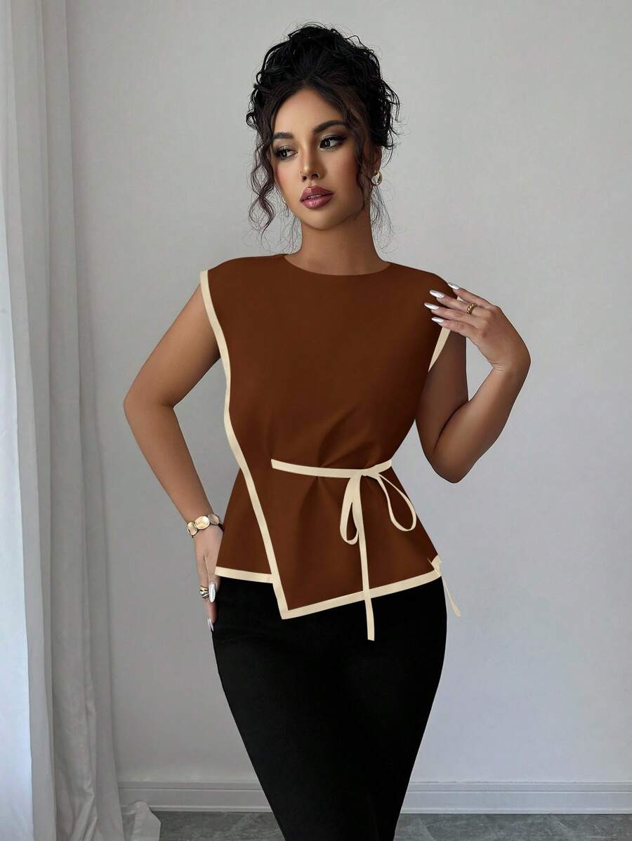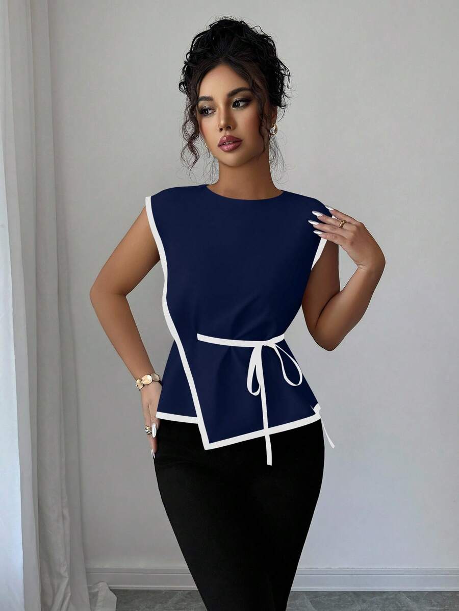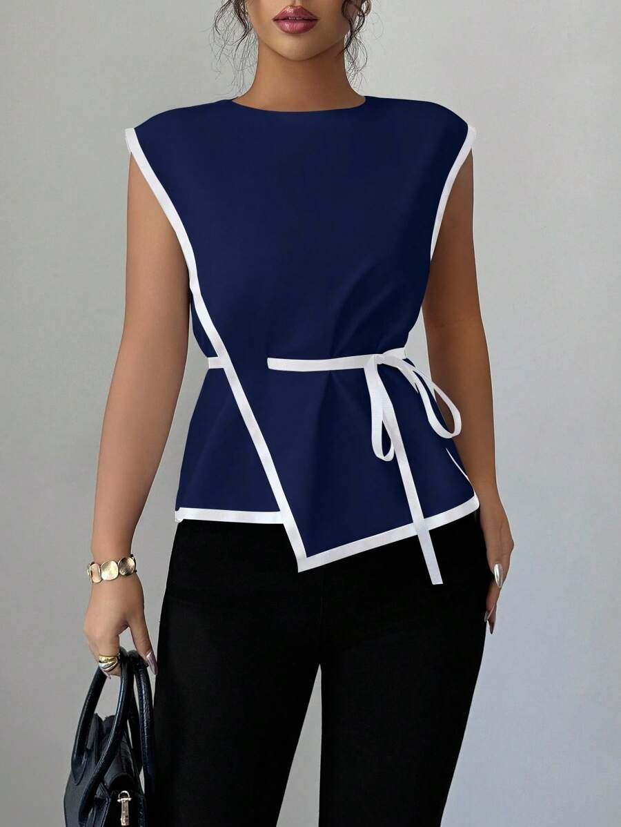 MIU Women's Elegant Fitted Two-Tone Blouse, Suitable For Commuting