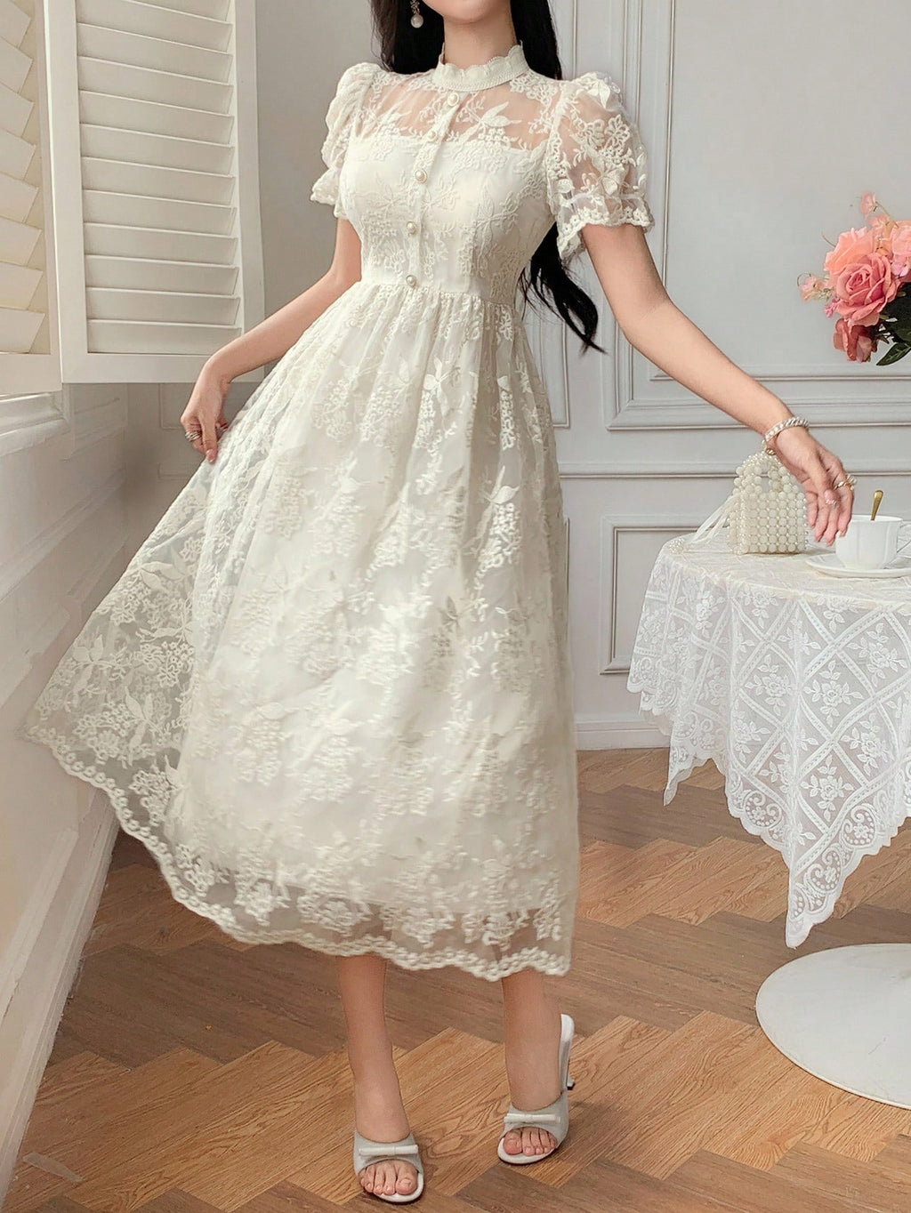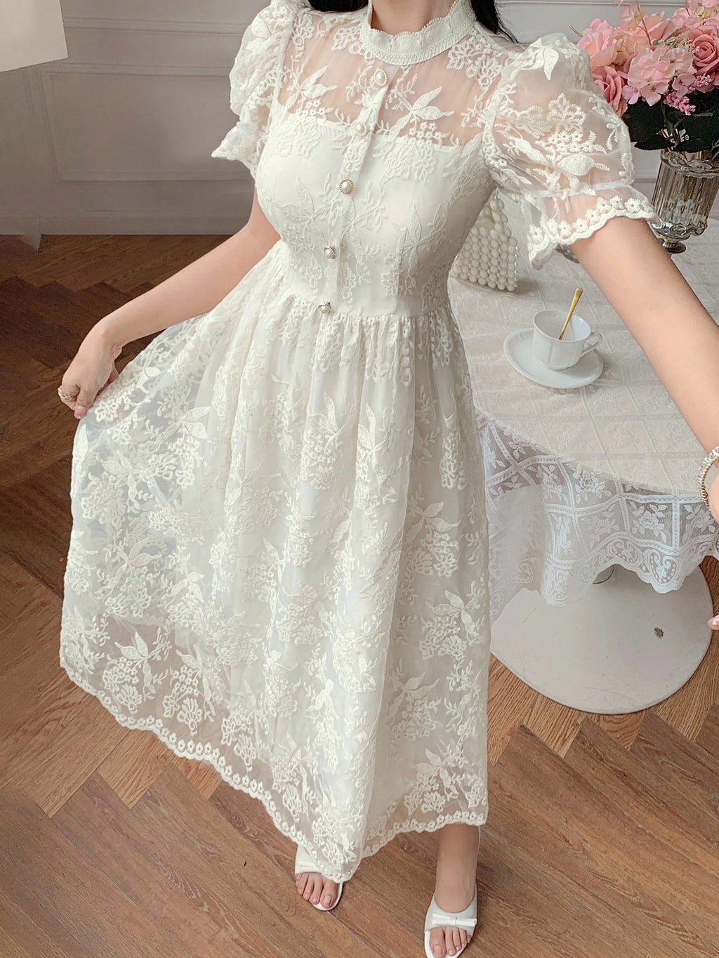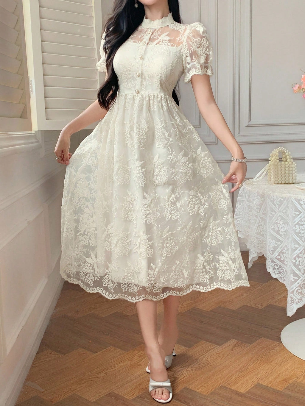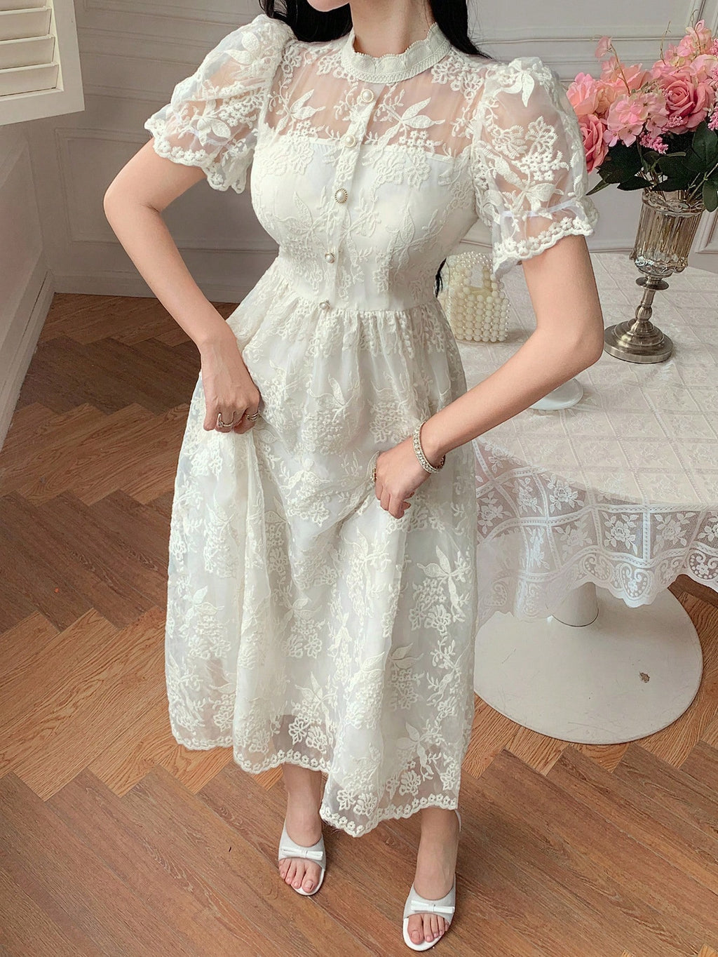 MIU Women's Elegant Lace Collar Puff Sleeve Mid-Long Dress